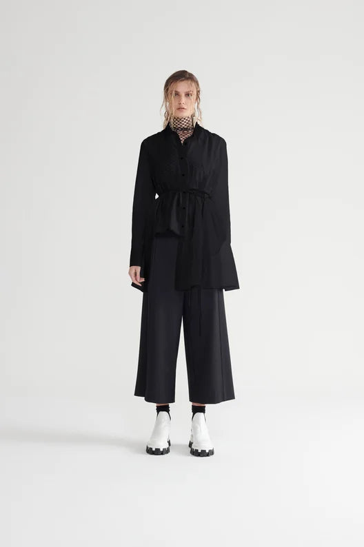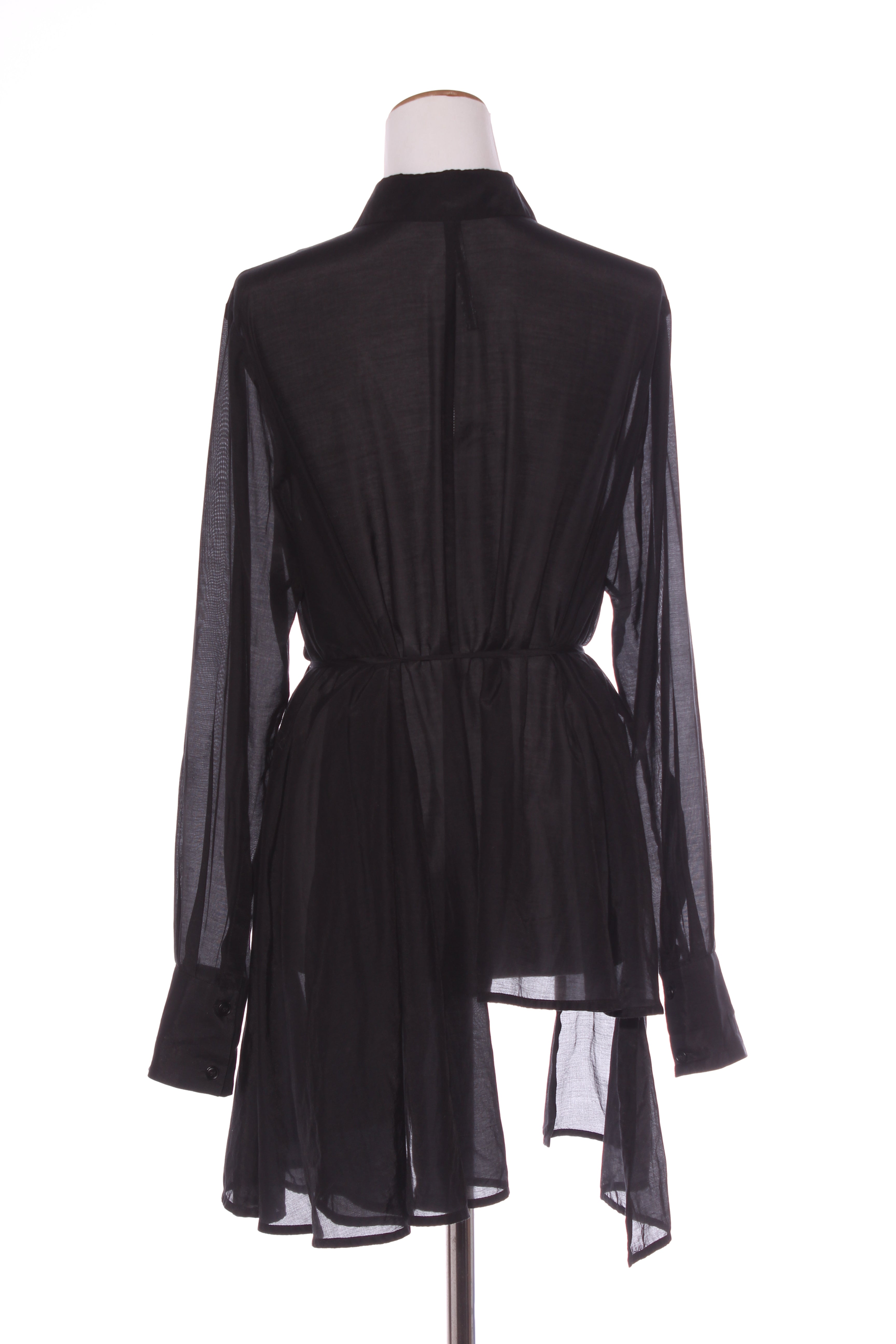 SIZE ON TAG: XLFITS LIKE: 16COLOUR: BlackFABRIC: 70% cotton, 30% silkCONDITION: Excellent prelovedMEASUREMENTS:BUST: 61cms WAIST: 84cms LENGTH: 61-86cms NOTES: Button up front and sleeve ends. Belt...