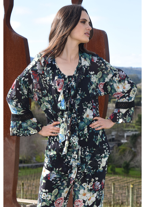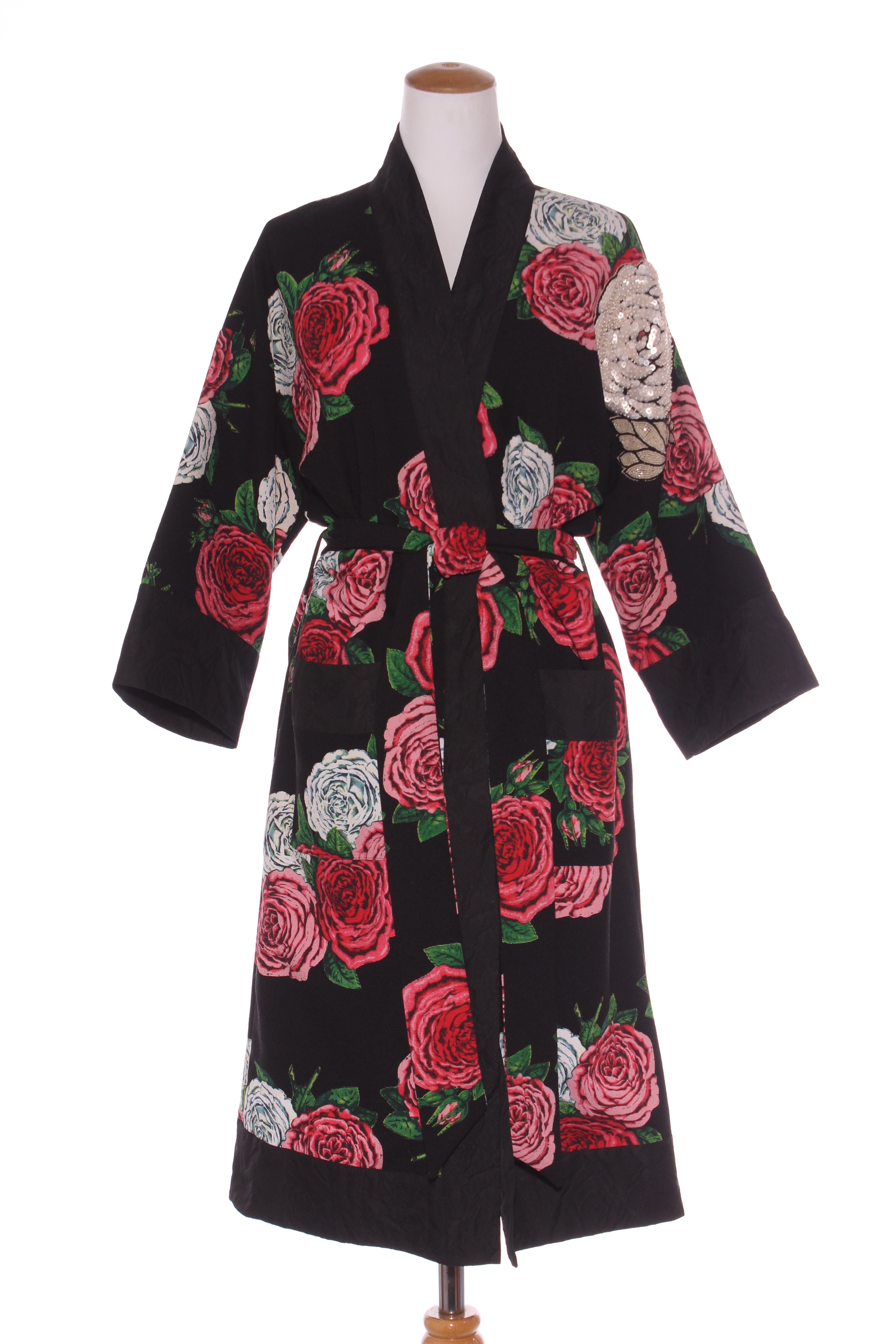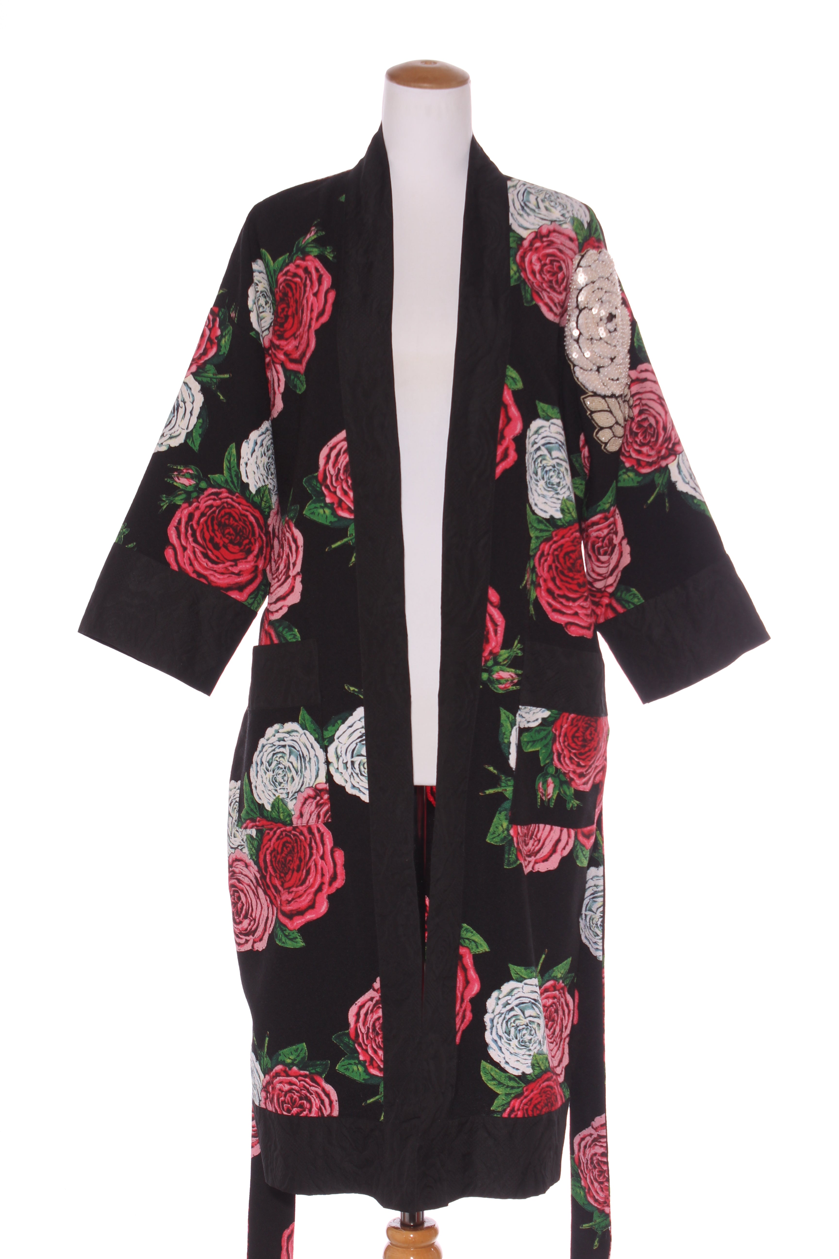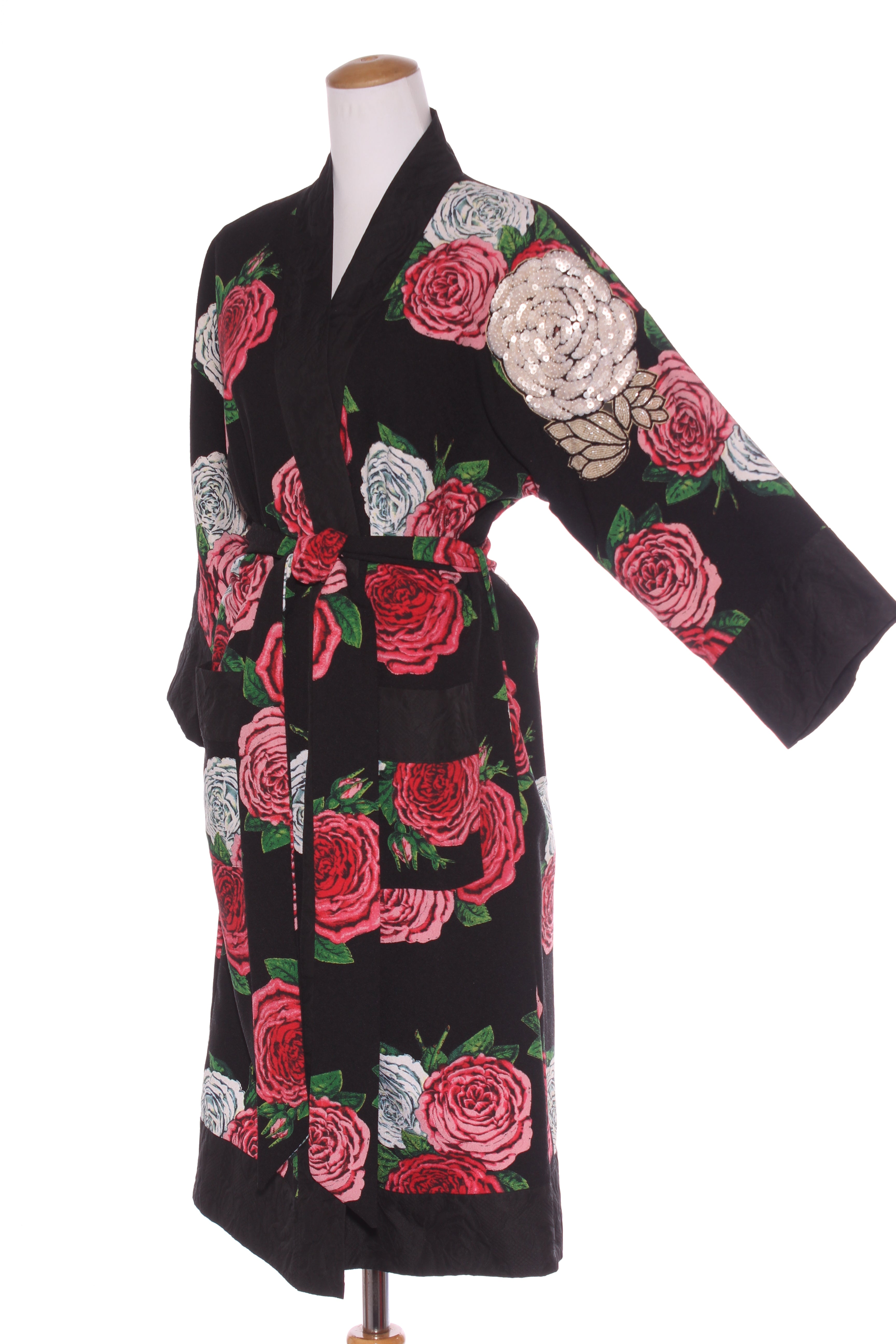 SIZE ON TAG: SFITS LIKE: 10-14COLOUR: Black, pink, multiFABRIC: PolyesterCONDITION: Excellent prelovedMEASUREMENTS:BUST: 65cms WAIST: Free LENGTH: 112cms NOTES: "No rose without a thorn - Kim oh...