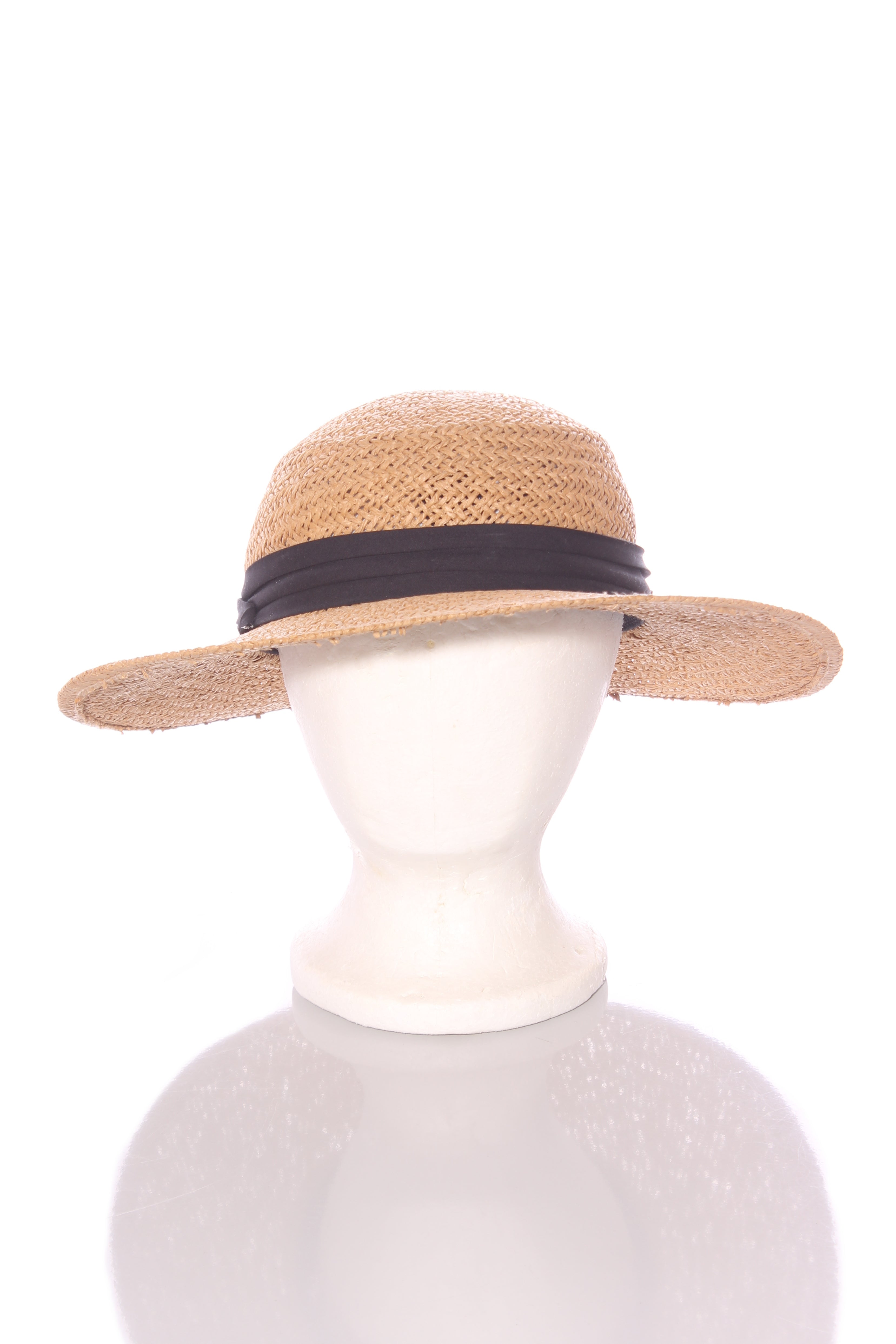 COLOUR: Tan, blackFABRIC: Paper exclusive of decorationCONDITION: Like newMEASUREMENTS:INNER CIRCUMFERENCE: 62cm NOTES: A lovely tan straw hat with black ribbon. This hat is one size fits all and has an adjustable inner band...