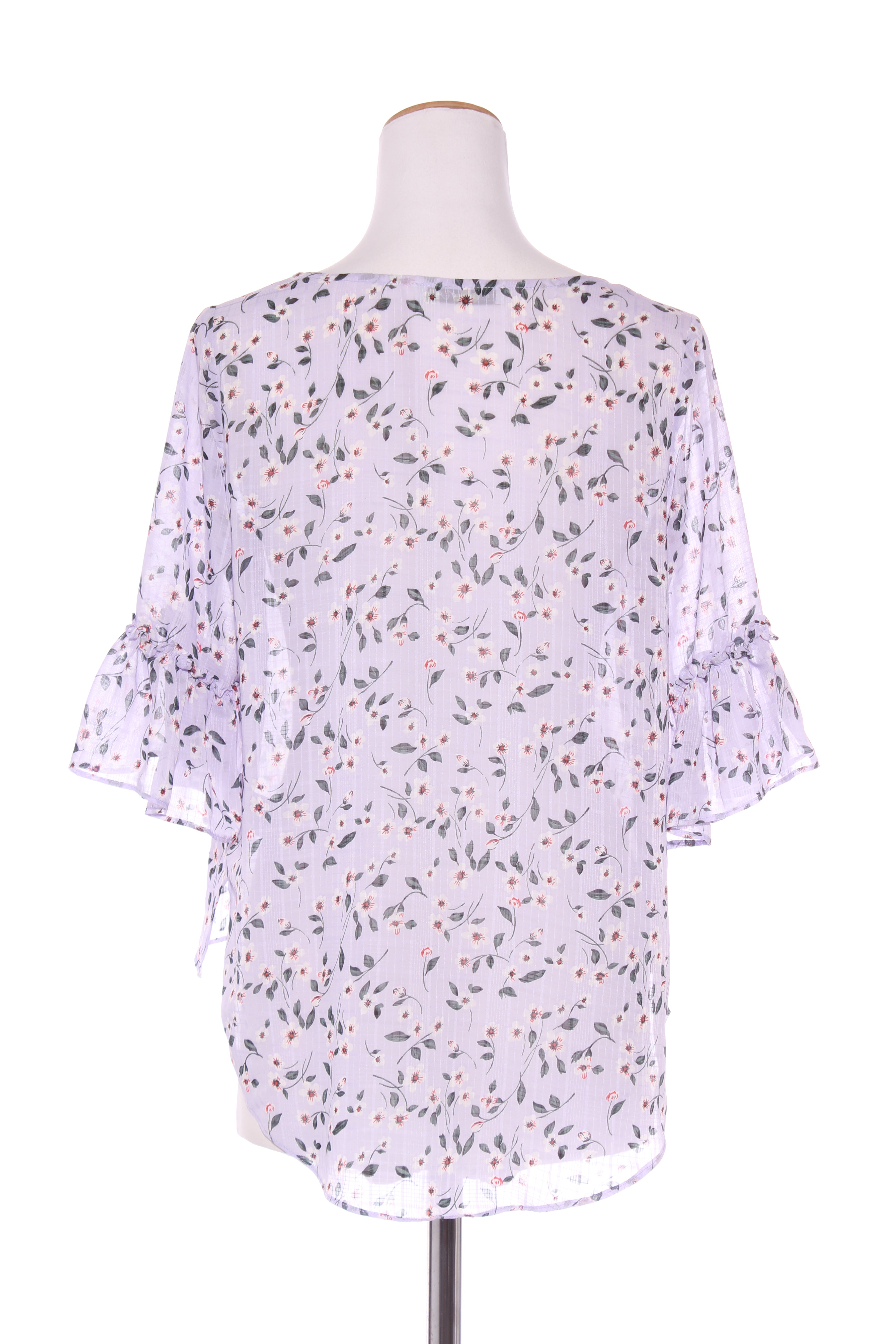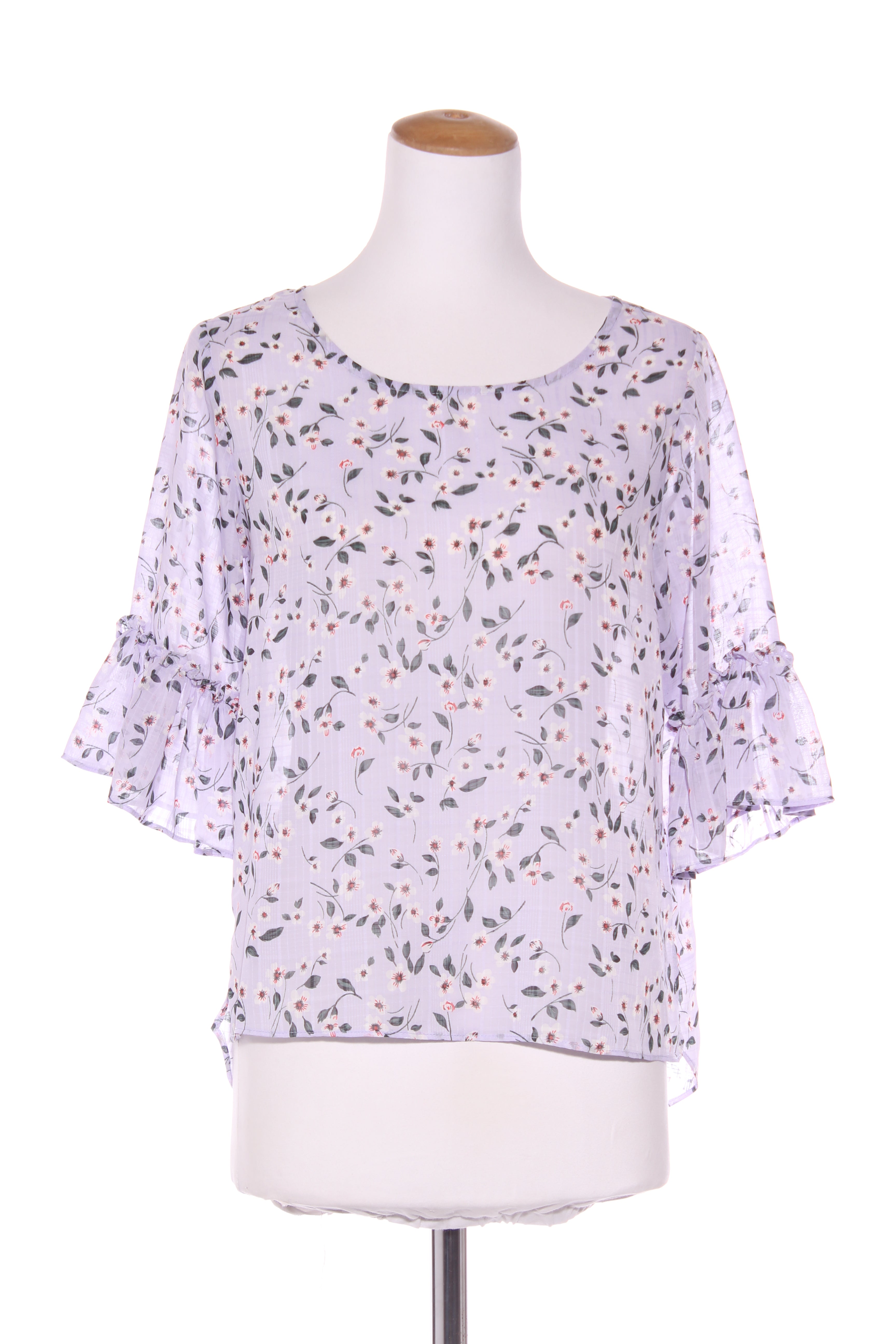 SIZE ON TAG: 8FITS LIKE: 8-10COLOUR: Multi, lilacFABRIC: PolyesterCONDITION: Excellent prelovedMEASUREMENTS:BUST: 49cms WAIST: 52cms LENGTH: 57-74cmsNOTES: Slip required. Ruffle sleeve ends.