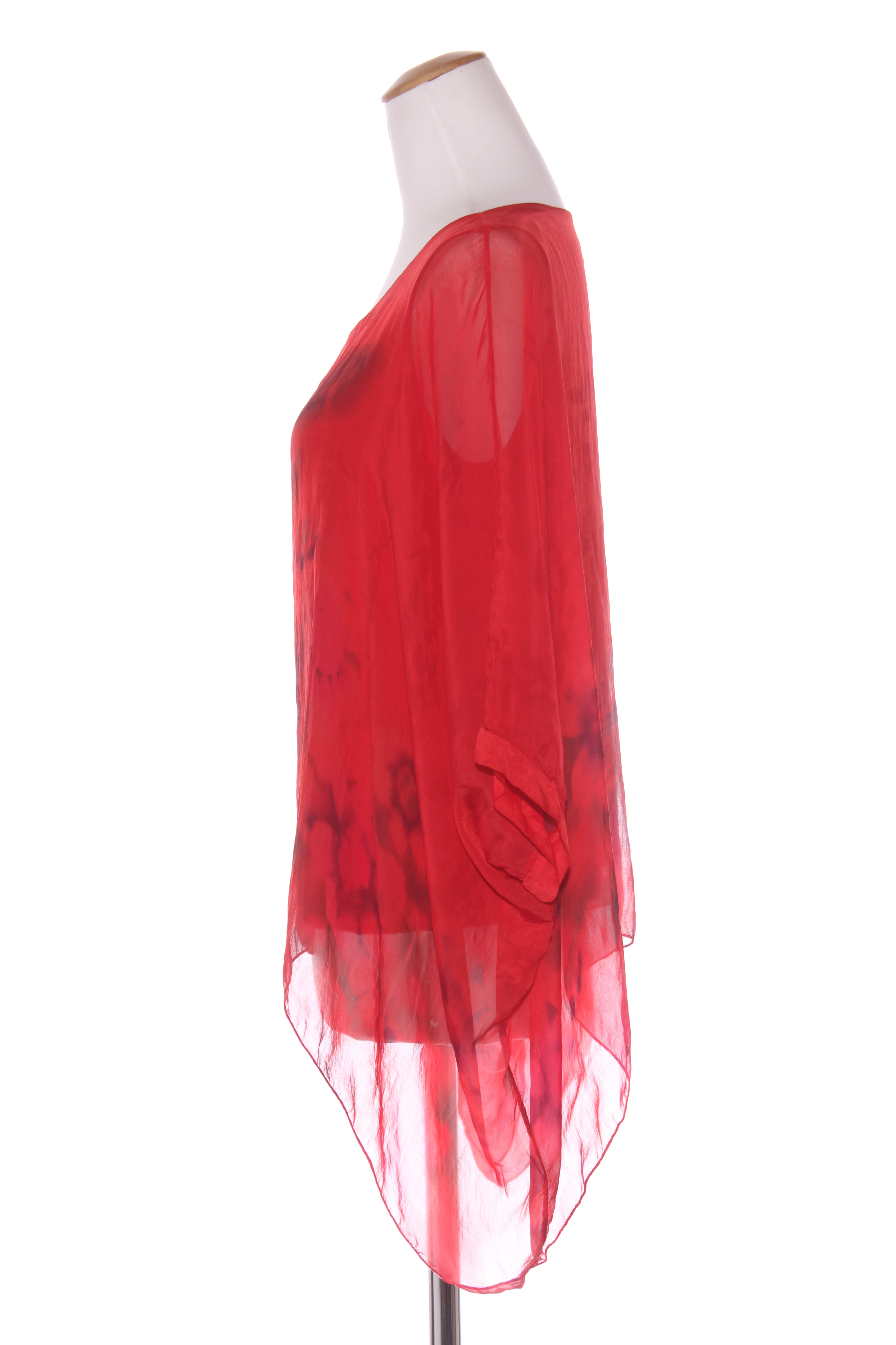 SIZE ON TAG: 14FITS LIKE: N/ACOLOUR: Red, lilac, multiFABRIC: ViscoseCONDITION: Very good prelovedMEASUREMENTS:BUST: 55cms WAIST: 58cms LENGTH: 70cms NOTES: Made in NZ. Elasticated sleeve ends.