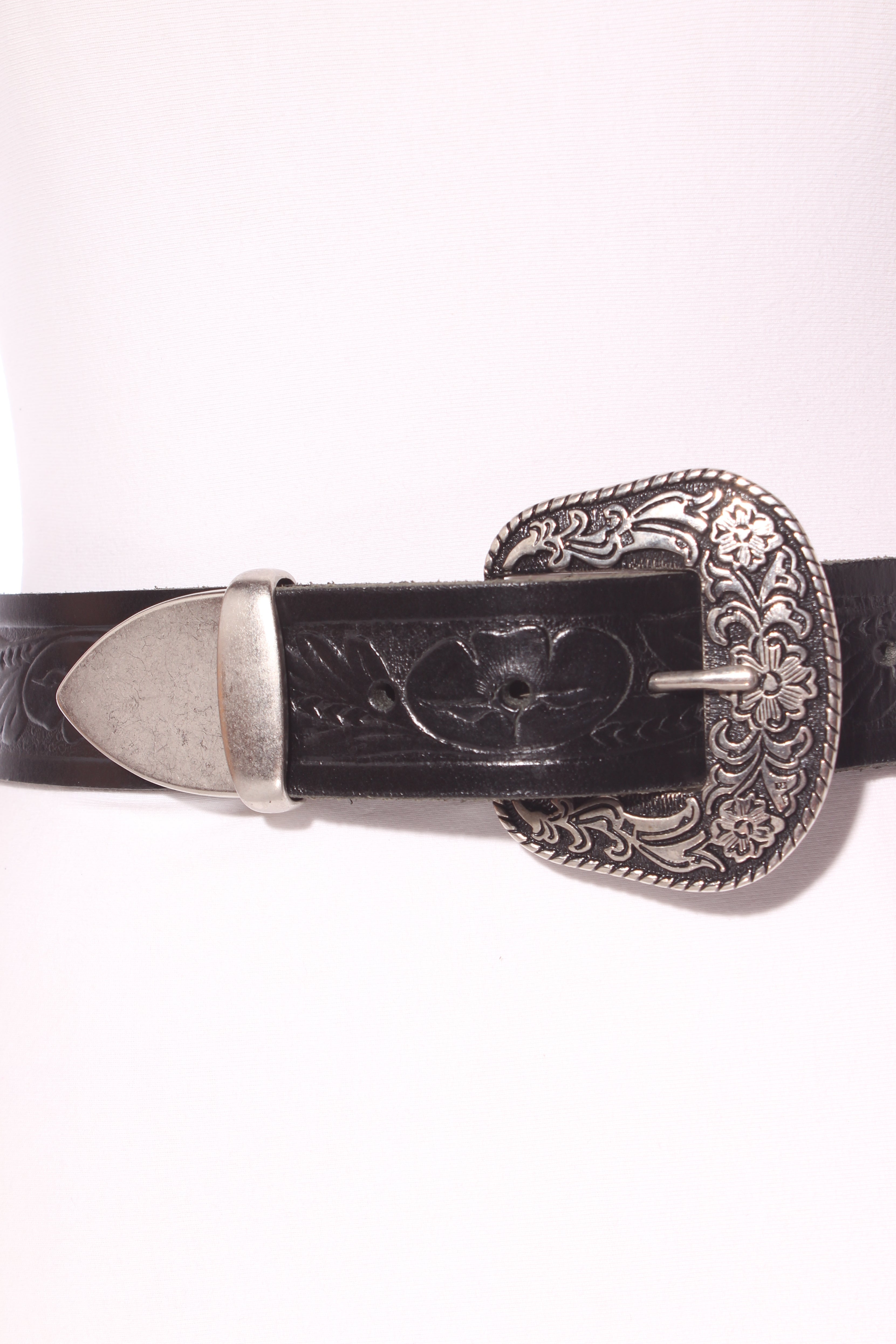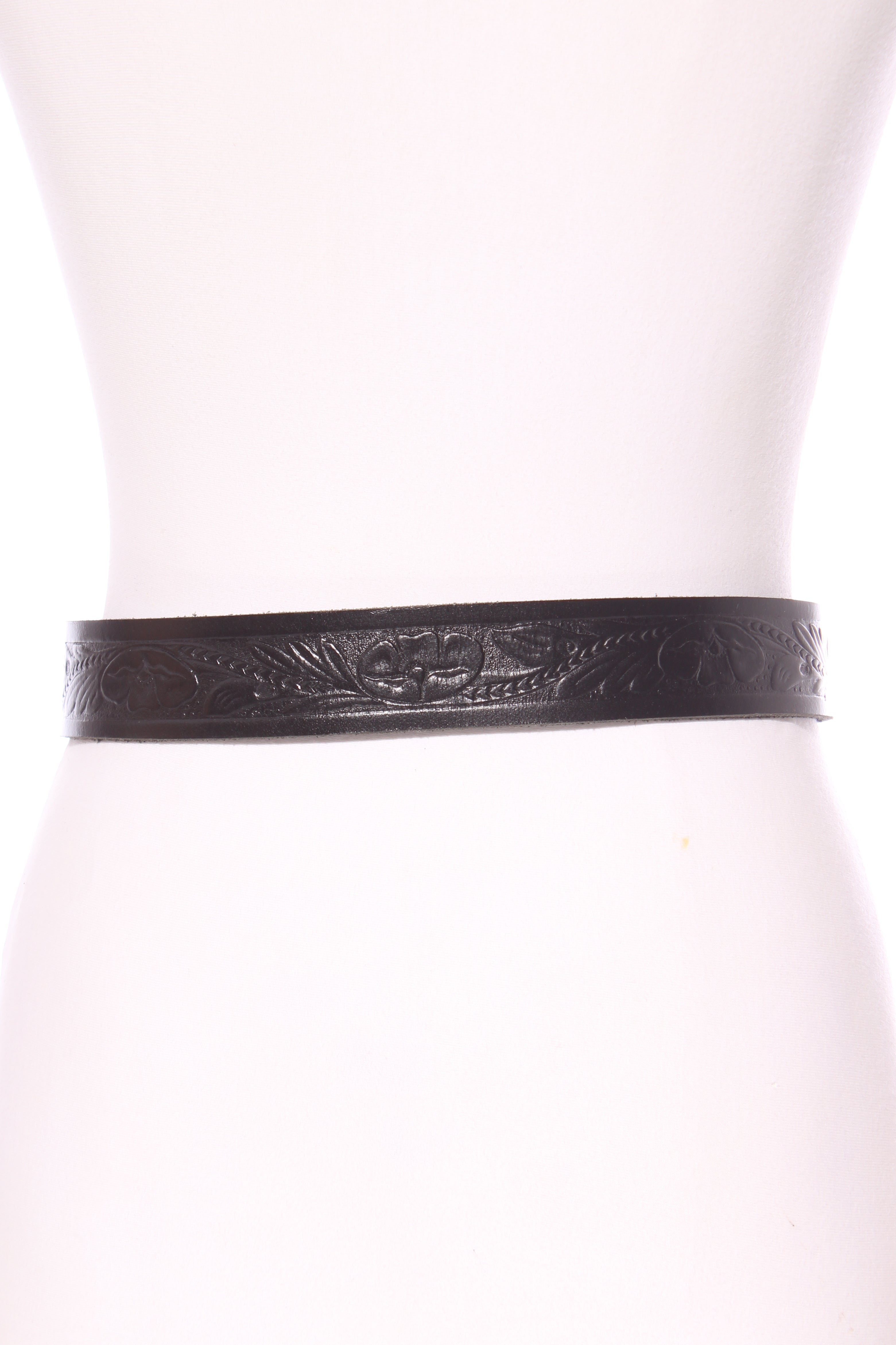 FITS LIKE: 6-8 or up to 12 on the waistCOLOUR: Black, silverFABRIC: Leather, metalCONDITION: Excellent prelovedMEASUREMENTS:WIDTH: 3.6cms LENGTH: 72-82cmsNOTES: Incredible quality leather, embossed patterned metal buckle