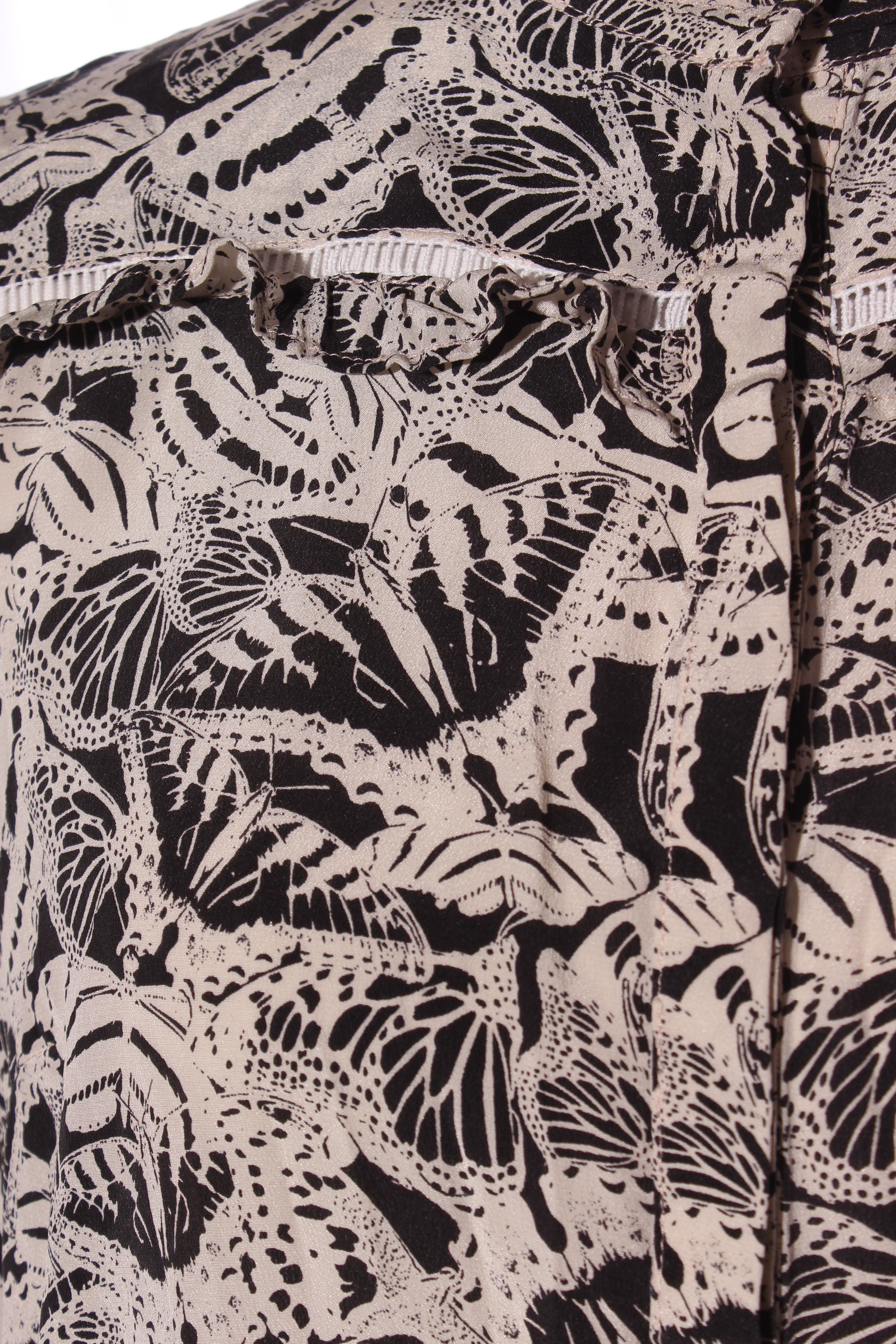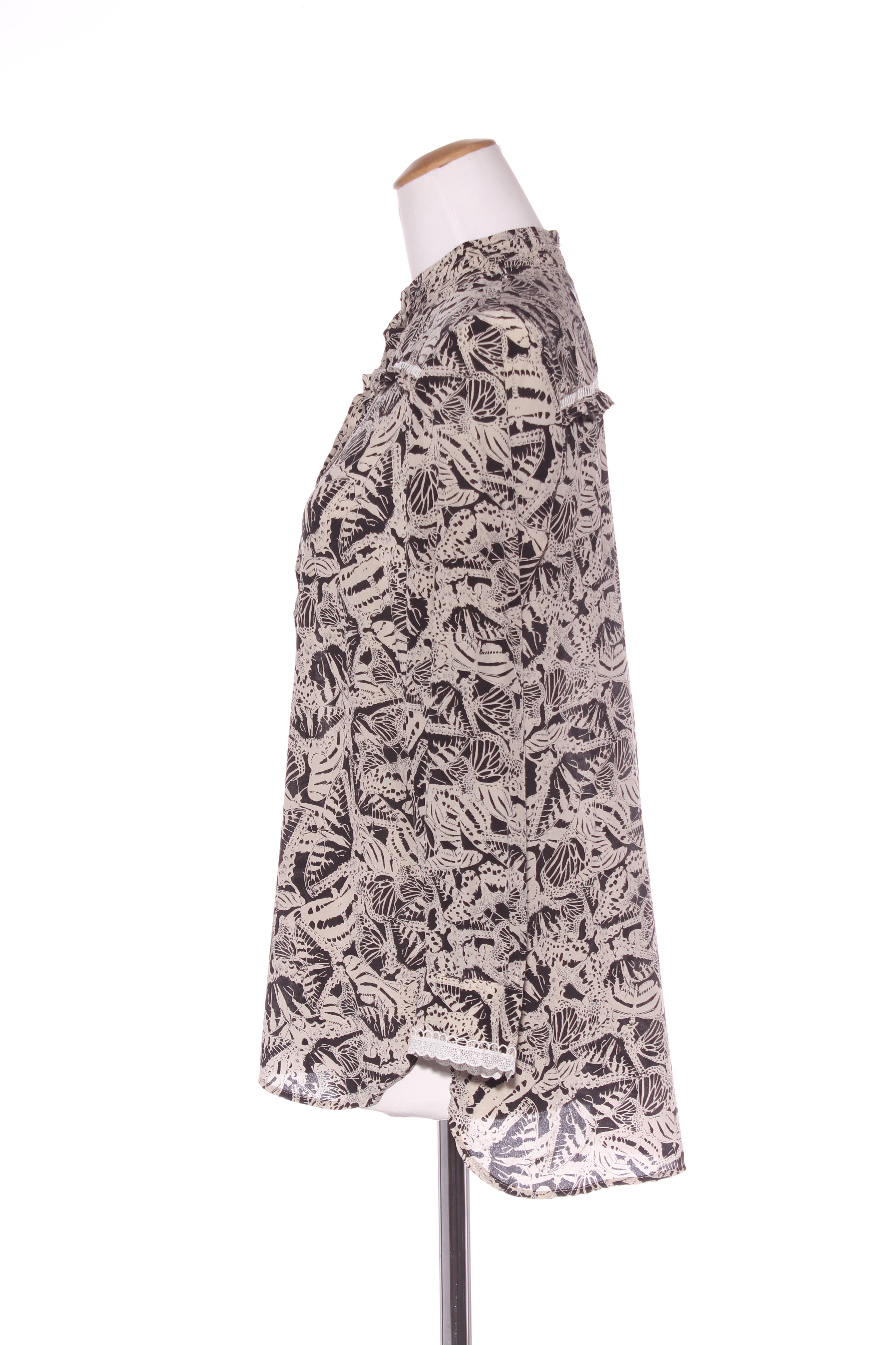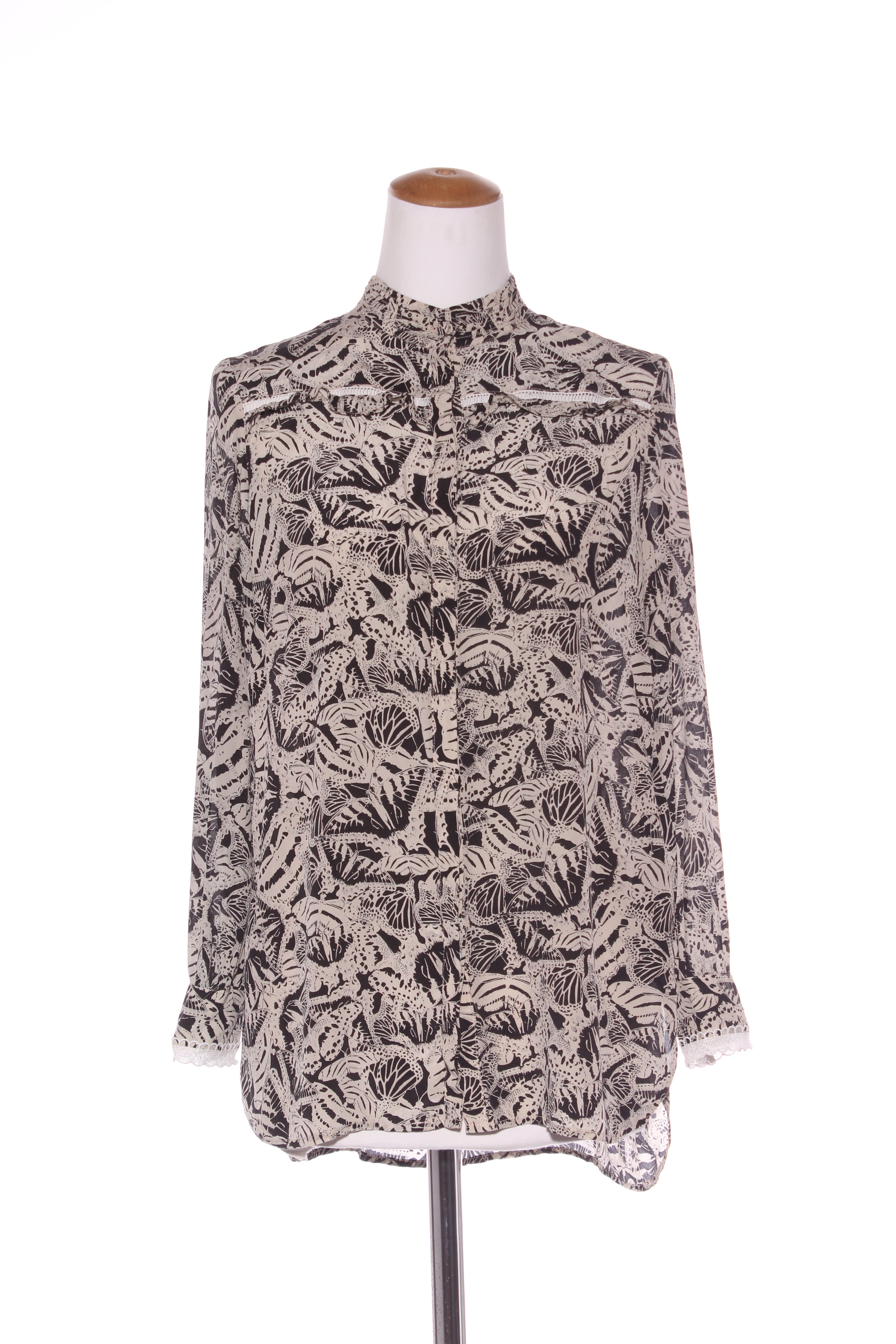 SIZE ON TAG: XSFITS LIKE: 8COLOUR: Black, sandstoneFABRIC: SilkCONDITION: Excellent prelovedMEASUREMENTS:BUST: 48cms WAIST: 53cms LENGTH: 68-73cms NOTES: Gorgeous butterfly print in 100% silk. Features a lace...