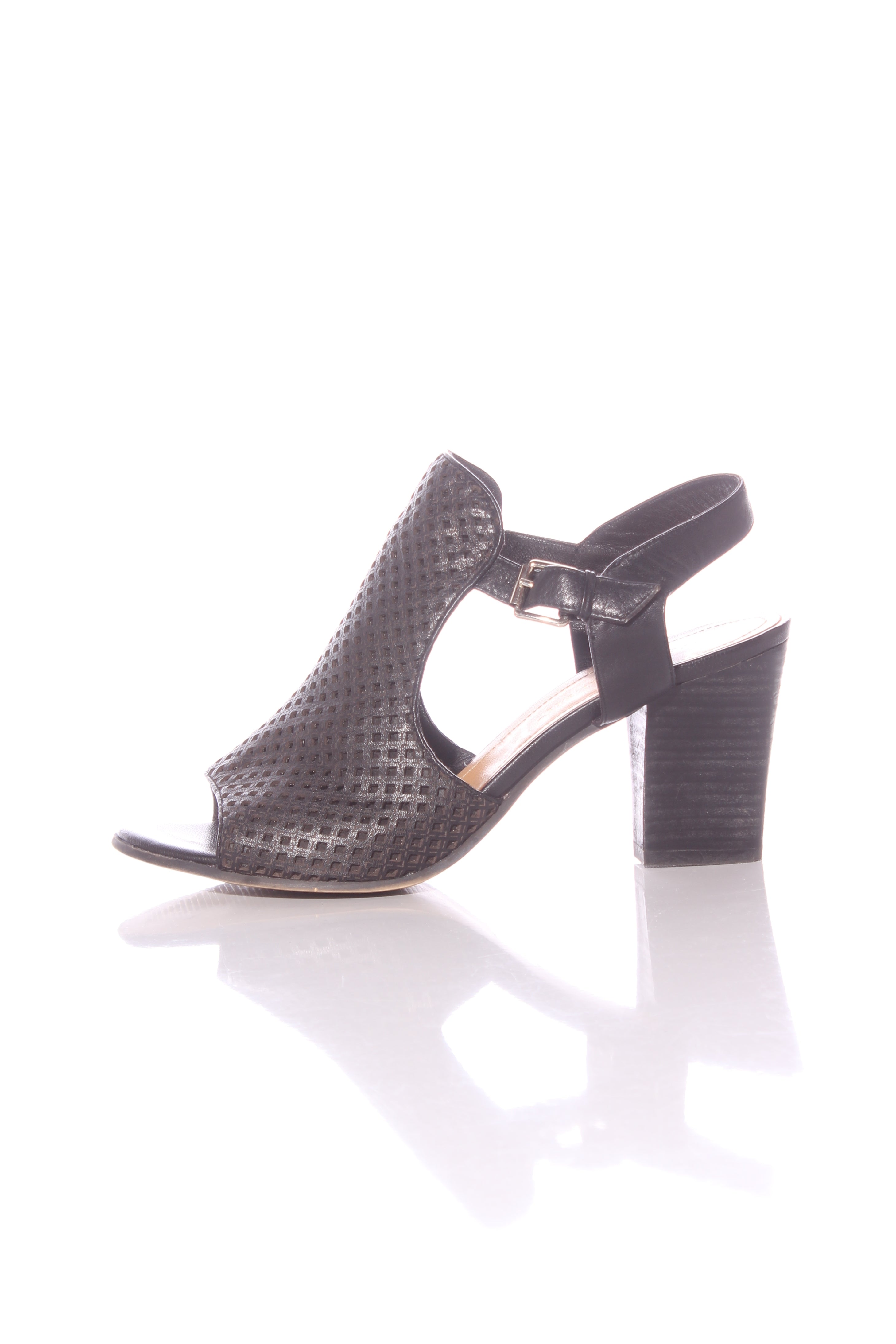 SIZE ON SHOE: 40FITS LIKE: 9COLOUR: BlackFABRIC: Leather upper, leather lining, non leather soleCONDITION: Excellent prelovedMEASUREMENTS:INNER SOLE: 26.5cms WIDTH: 9cms HEEL: 8cms NOTES: Adjustable ankle strap.