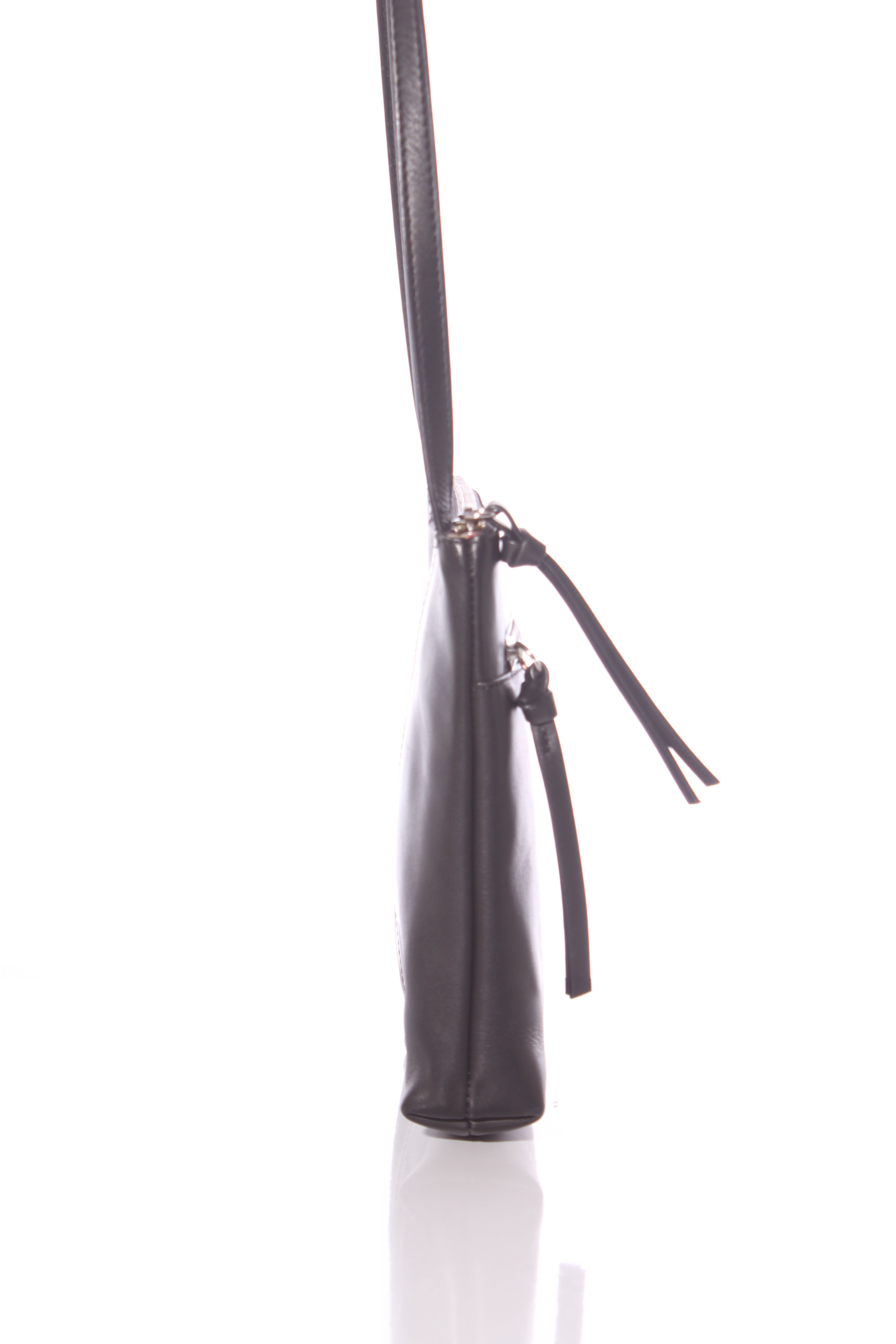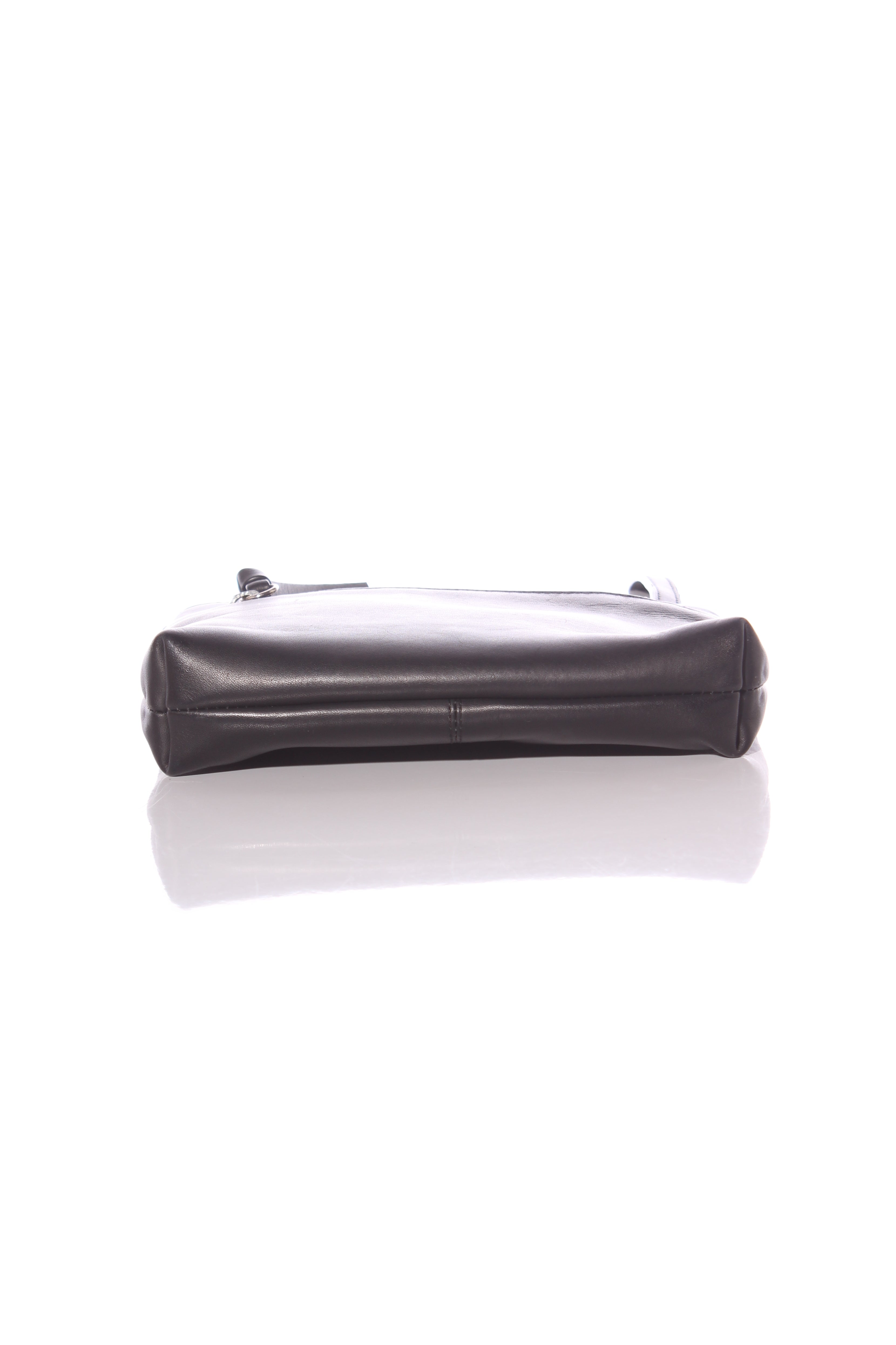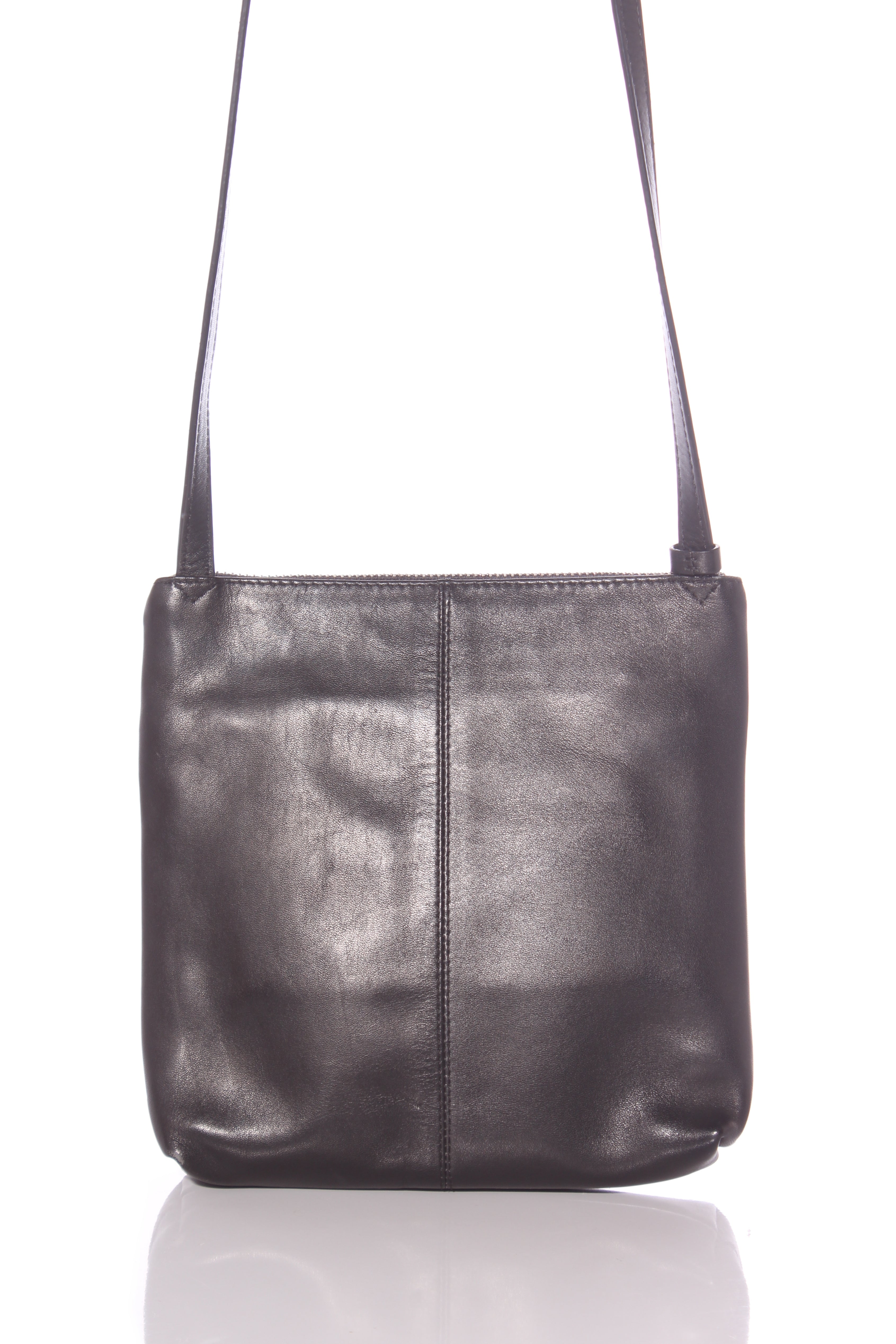 COLOUR: BlackFABRIC: LeatherCONDITION: Excellent prelovedMEASUREMENTS:HEIGHT: 20cms WIDTH: 20cms DEPTH: 4cms STRAP: 129-141cms NOTES: Zip access to main compartment. Inside features a zip and open...