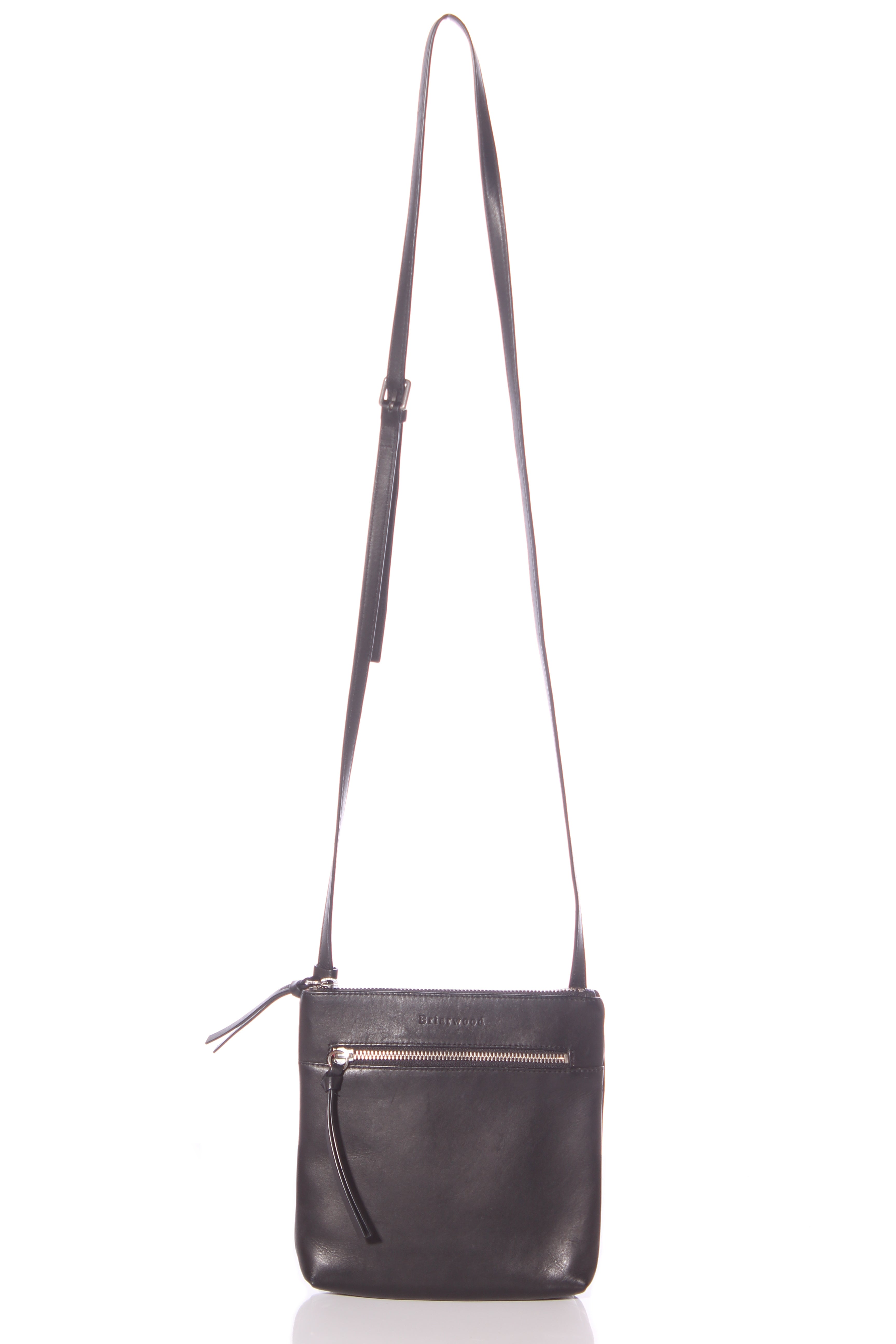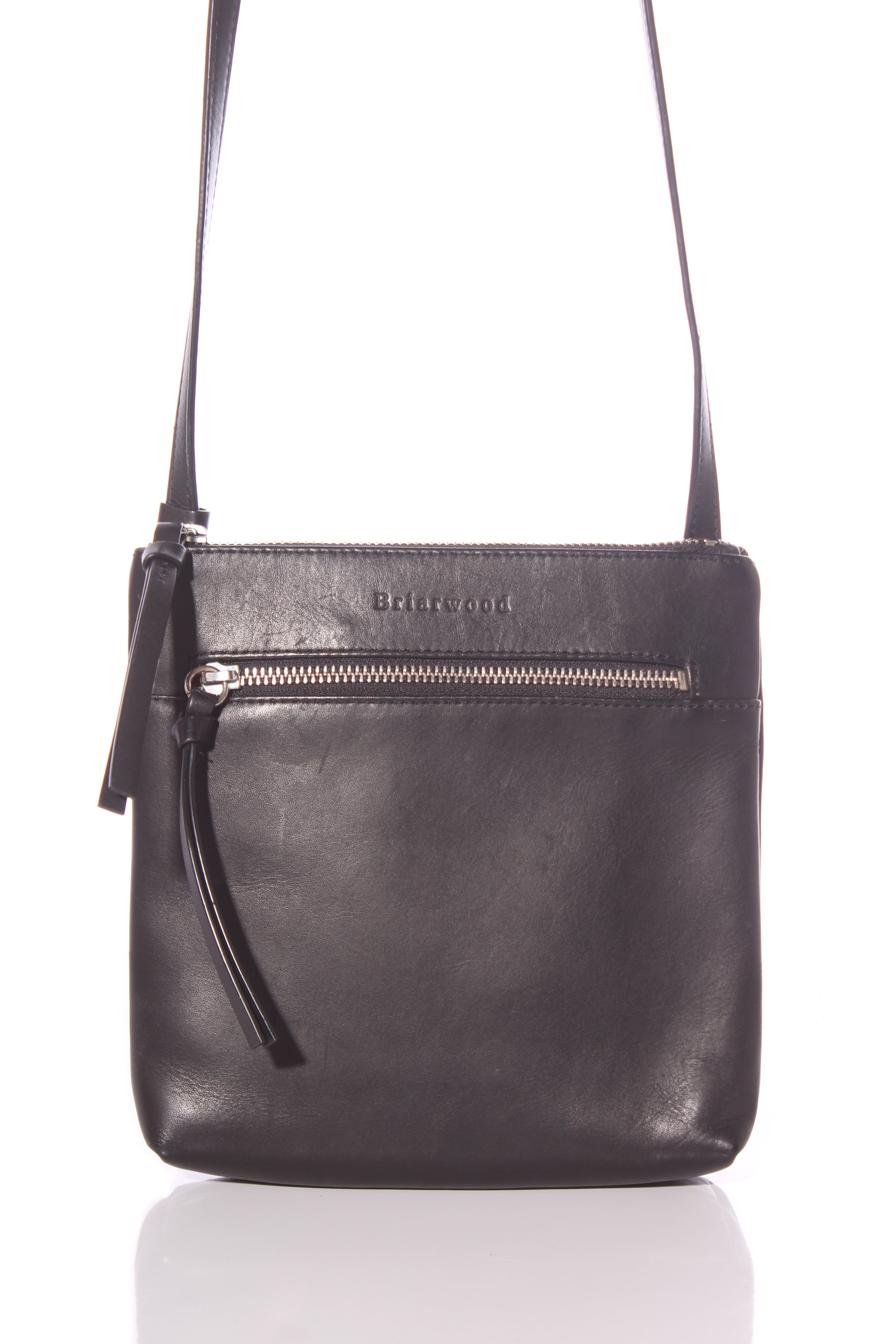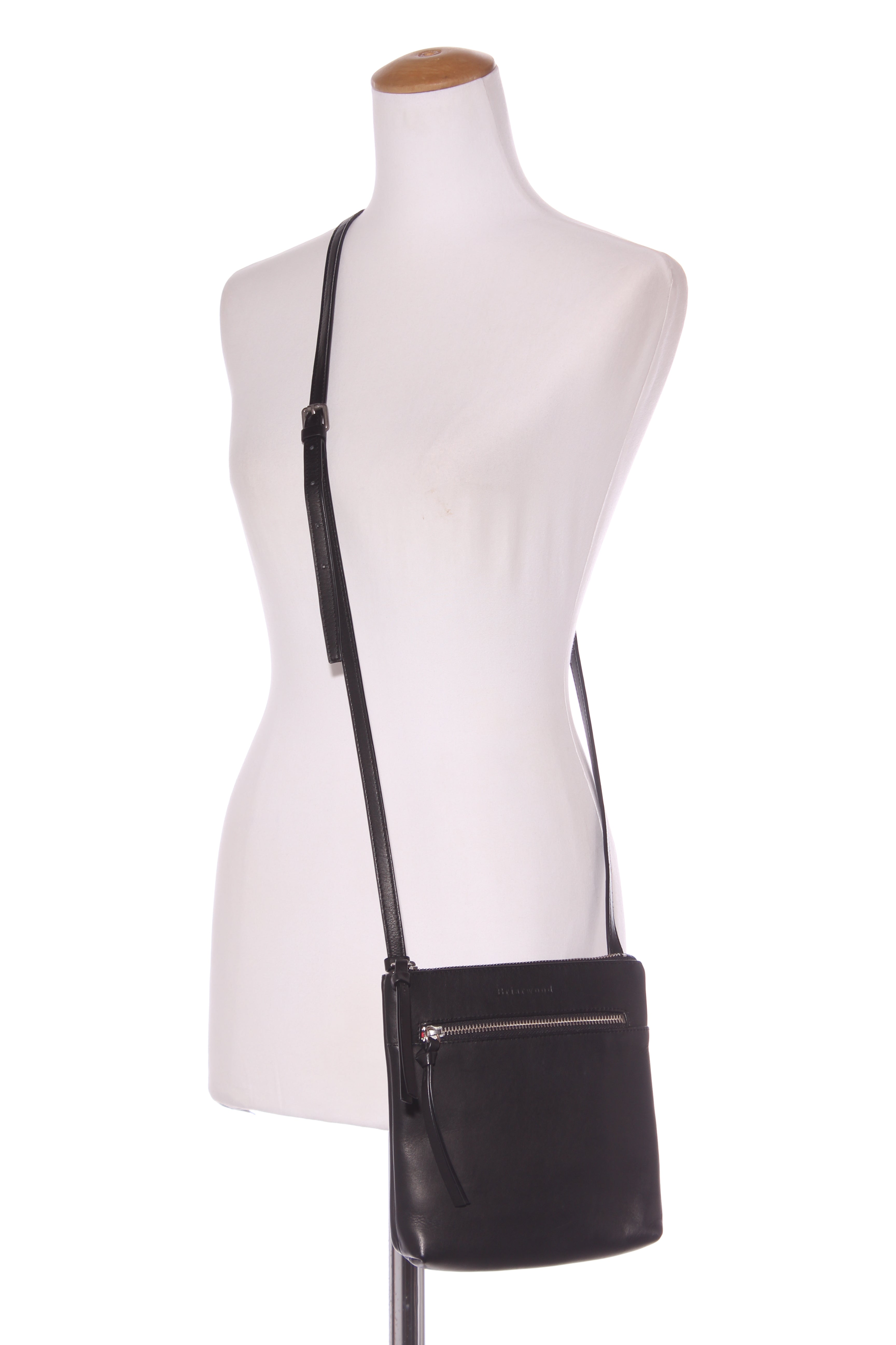 COLOUR: BlackFABRIC: LeatherCONDITION: Excellent prelovedMEASUREMENTS:HEIGHT: 20cms WIDTH: 20cms DEPTH: 4cms STRAP: 129-141cms NOTES: Zip access to main compartment. Inside features a zip and open...
