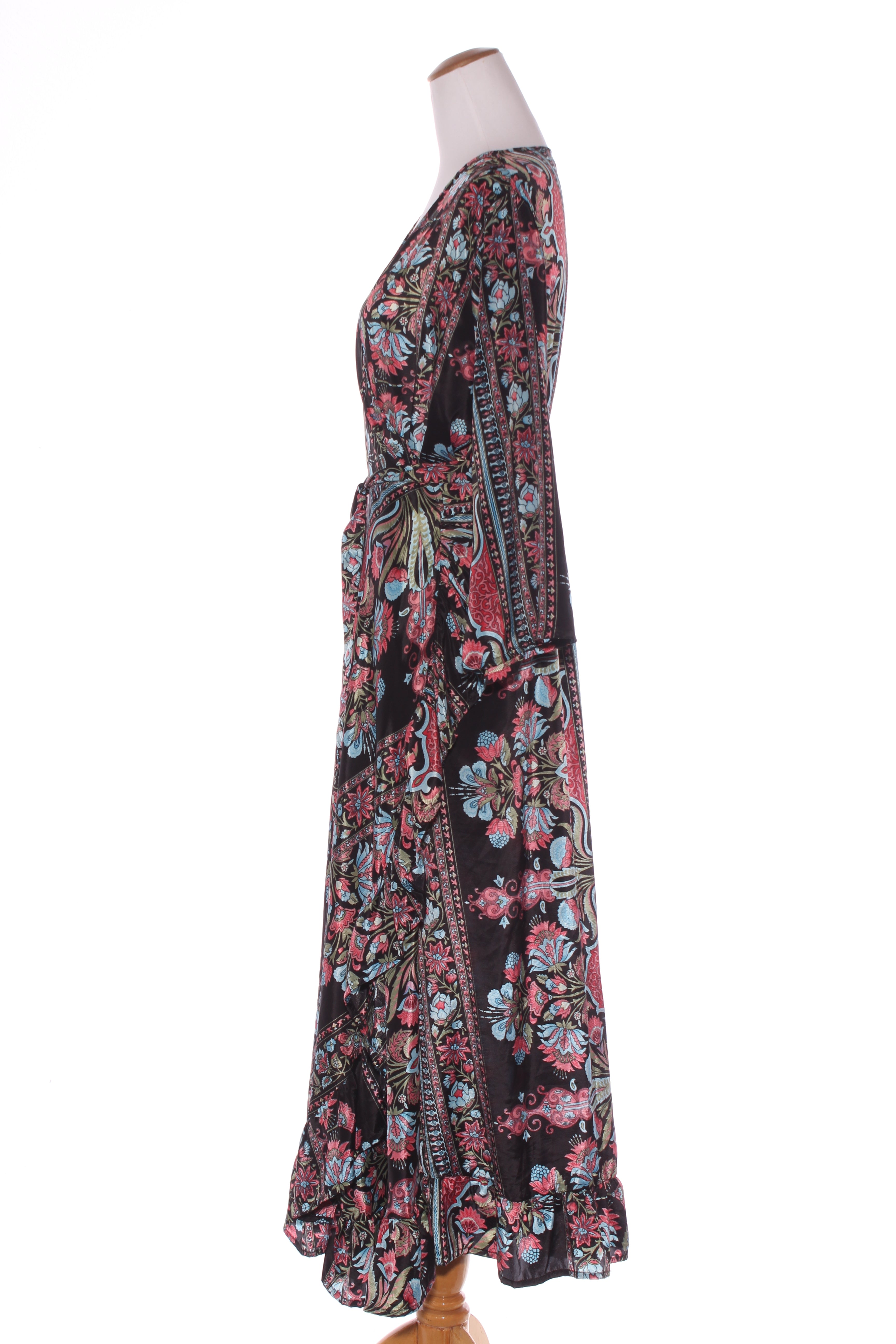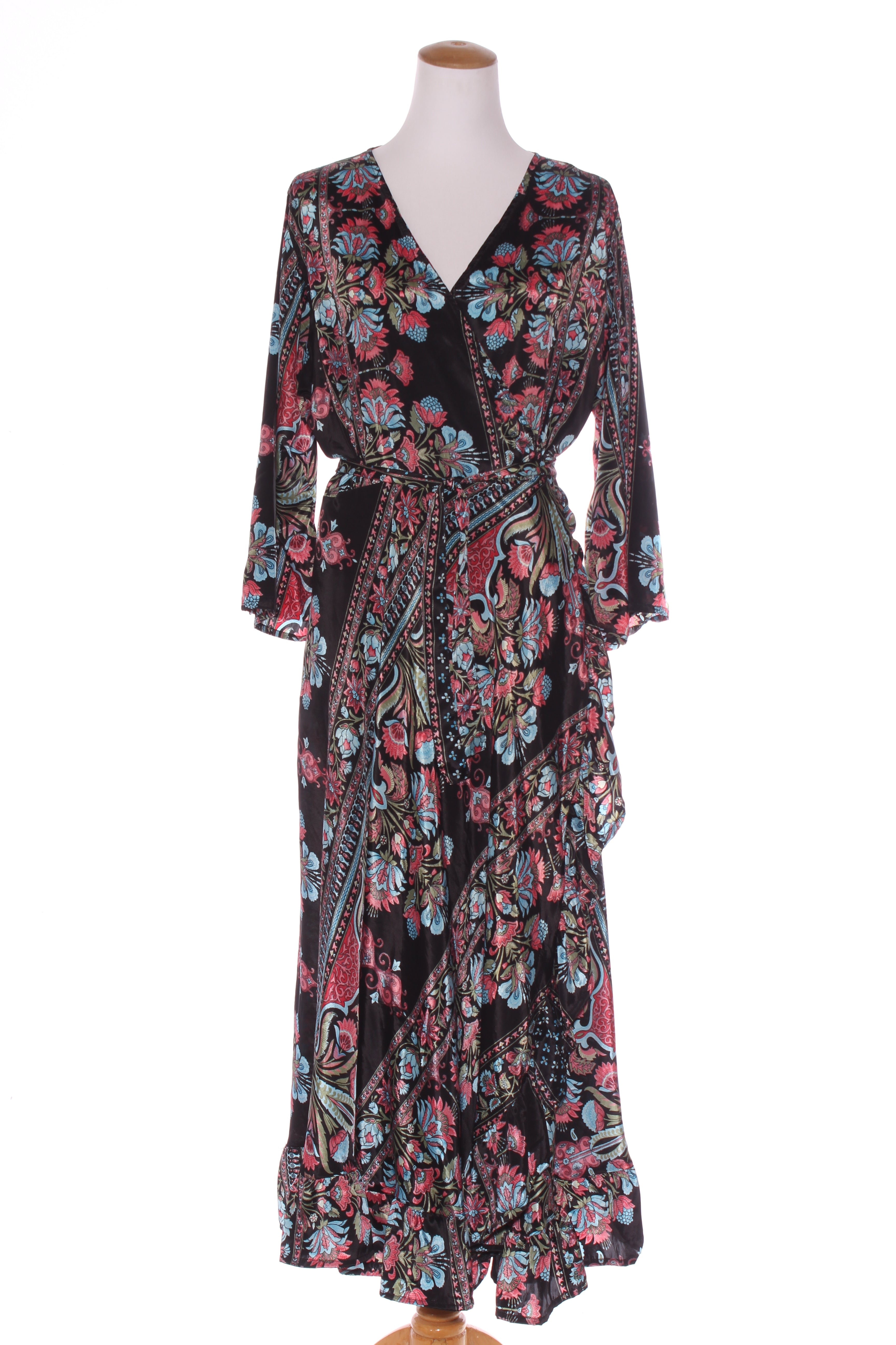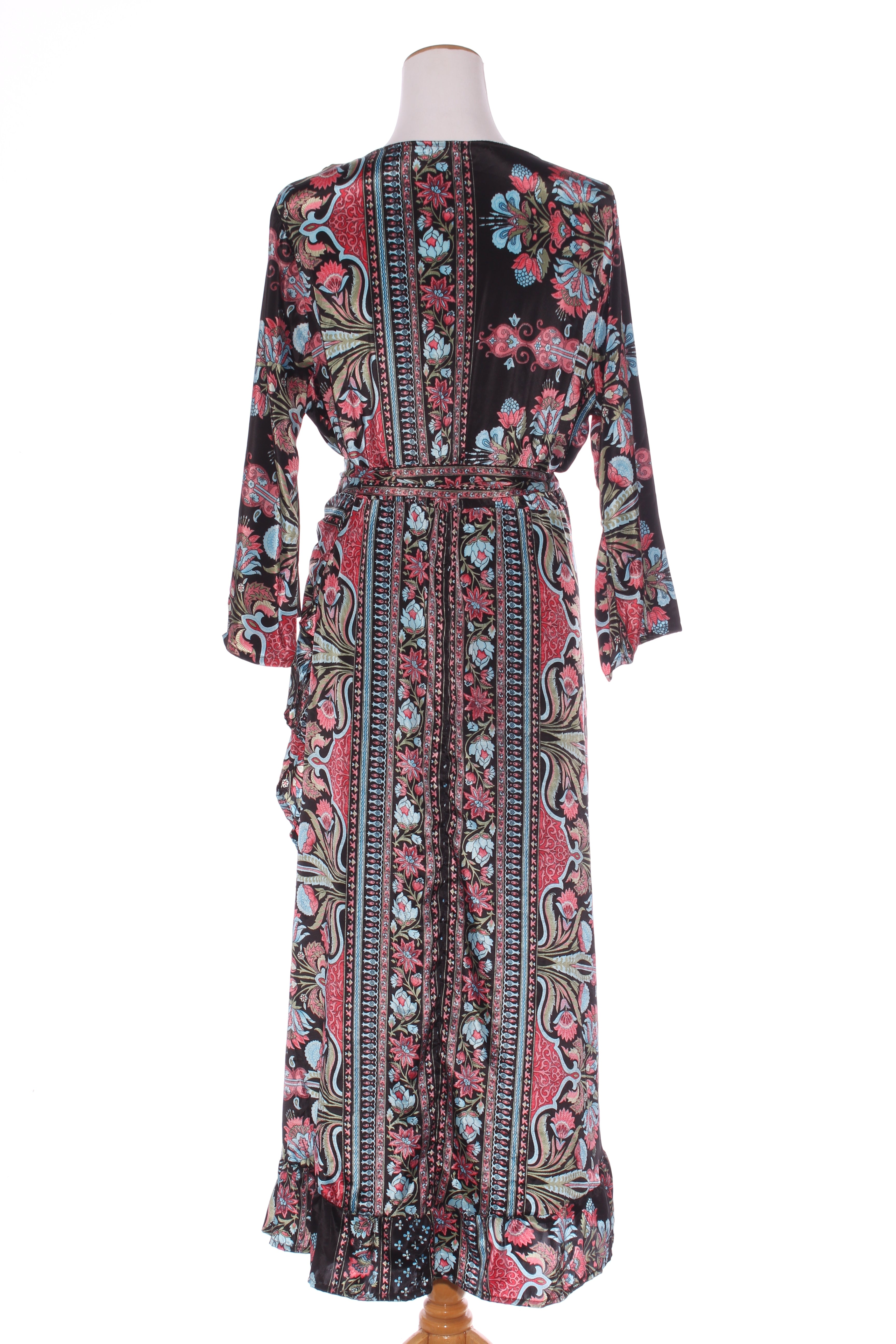 SIZE ON TAG: XLFITS LIKE: 16COLOUR: Black, multiFABRIC: 70% polyester, 30% silkCONDITION: Excellent prelovedMEASUREMENTS:BUST: 61cms WAIST: Free LENGTH: 129-138cms NOTES: Label stocked at Magazine. Wraps through...