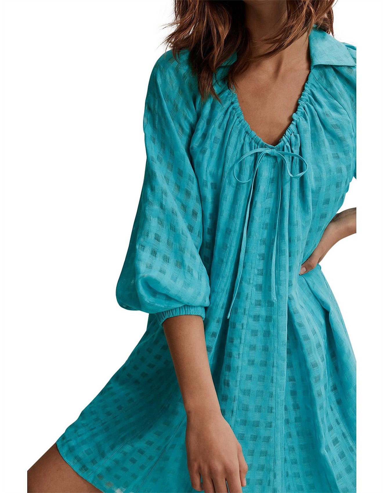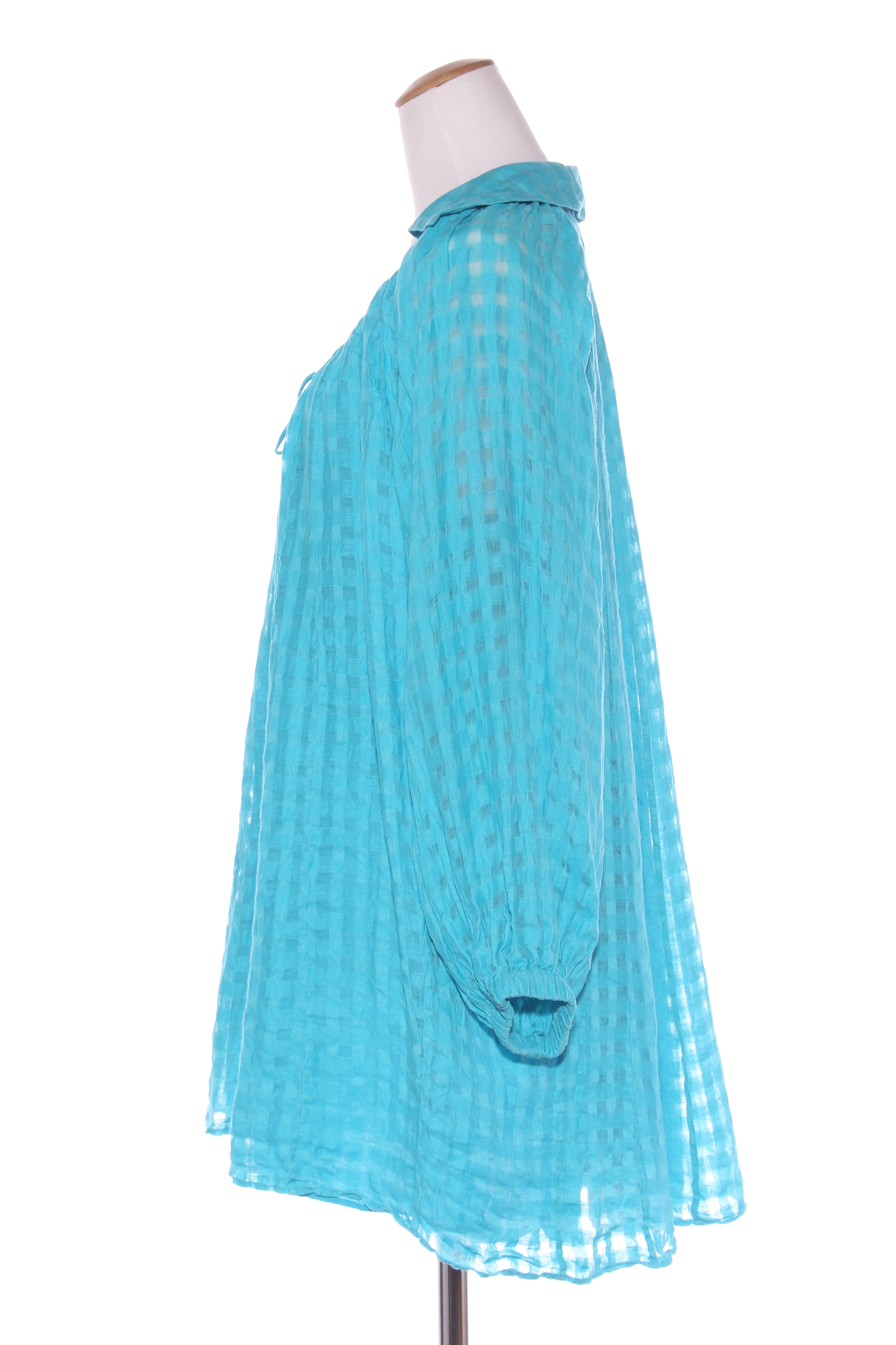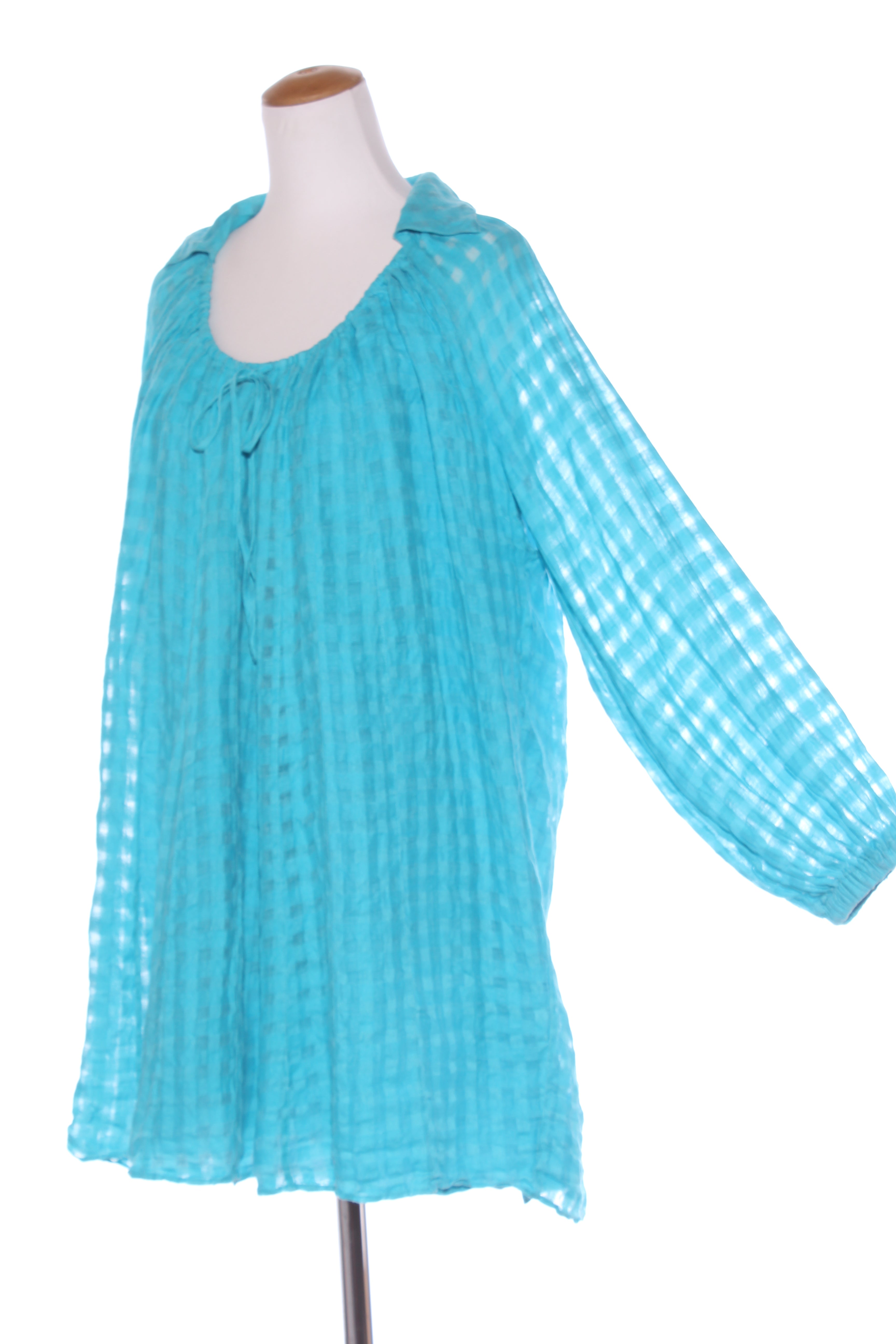 SIZE ON TAG: 14FITS LIKE: N/ACOLOUR: BlueFABRIC: 60% ramie, 40% organic linen, Lining - cottonCONDITION: Excellent prelovedMEASUREMENTS:BUST: 57cms WAIST: 75cms LENGTH: 86cmsNOTES: Drawstring through neckline ties...