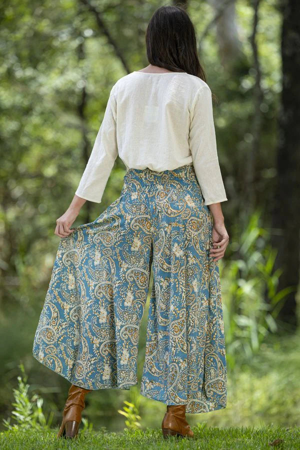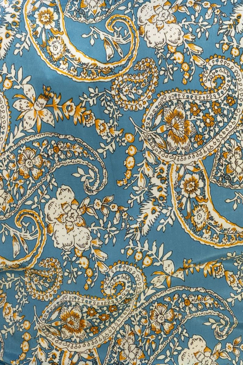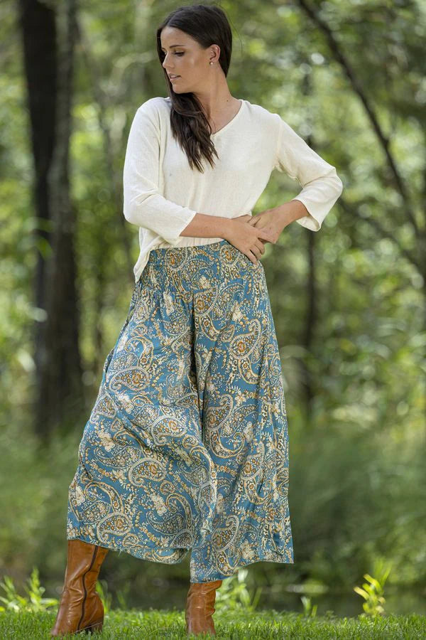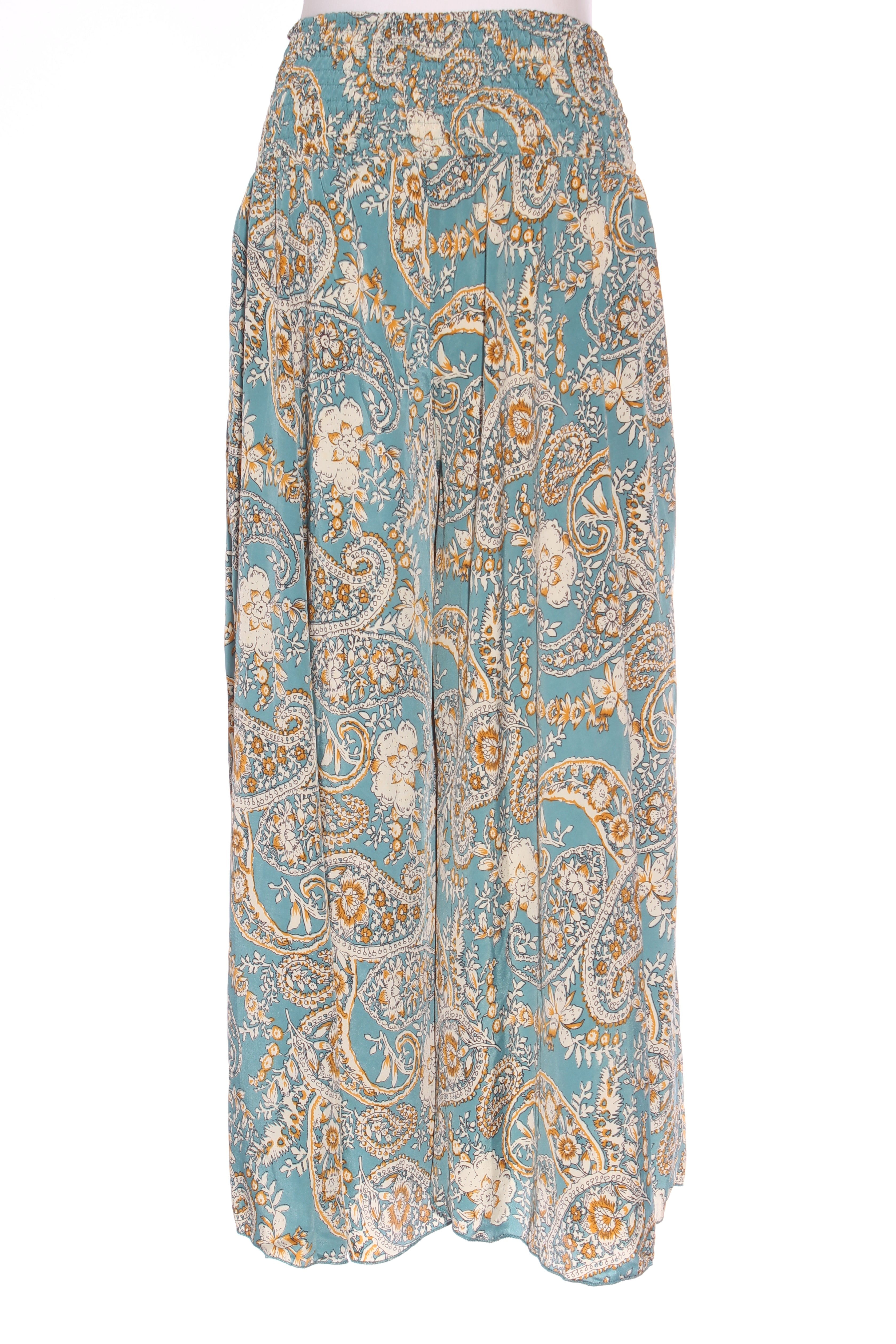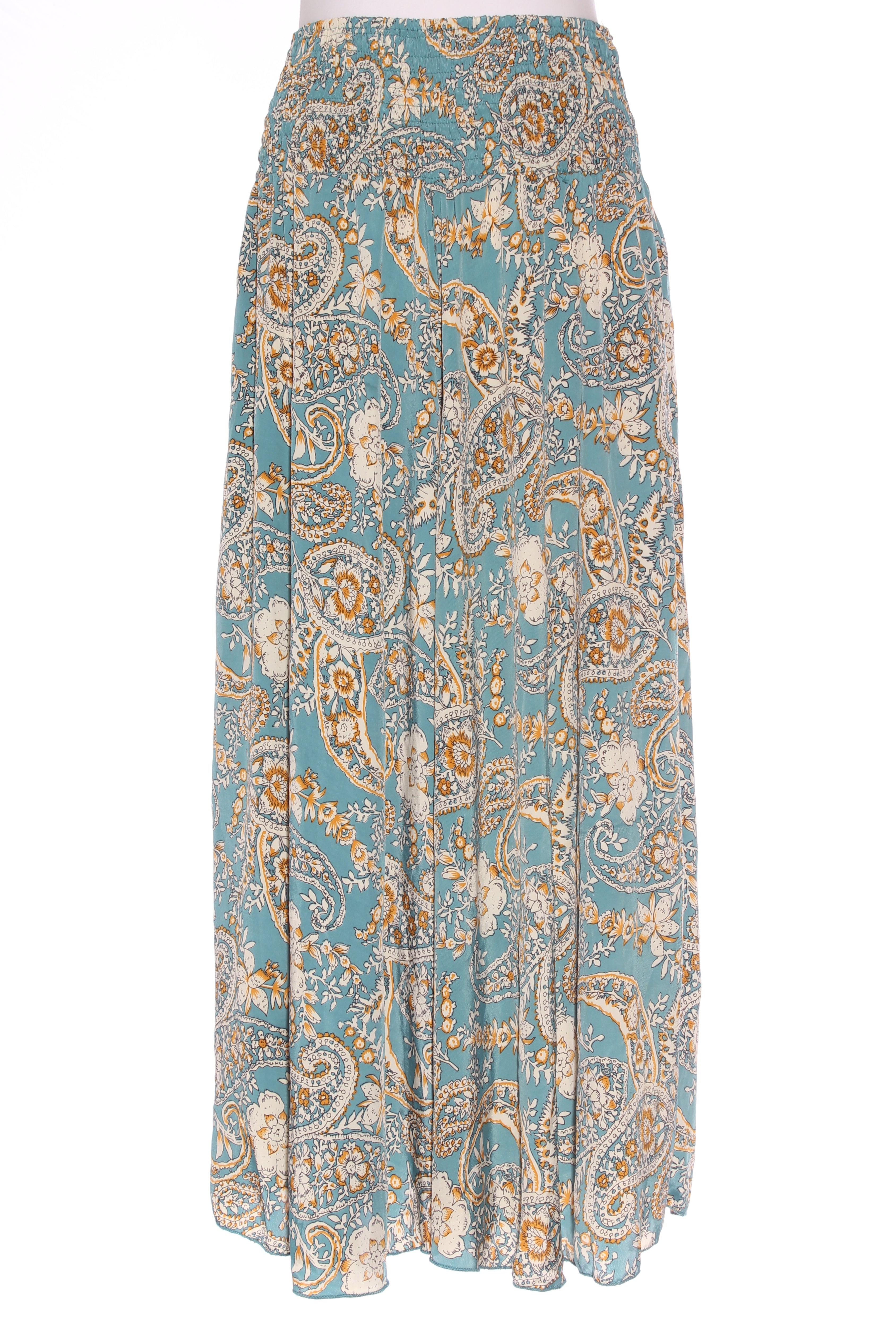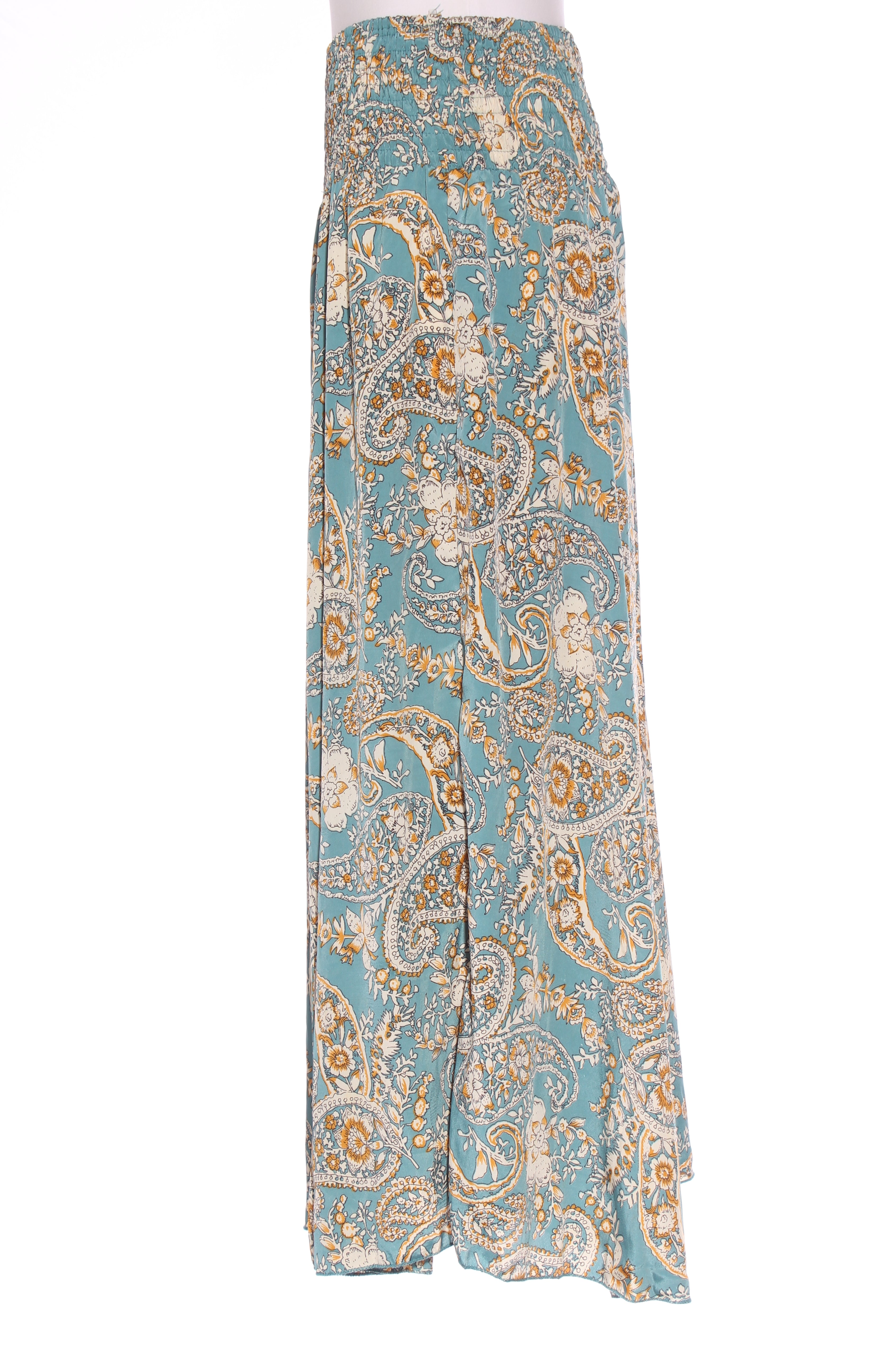SIZE ON TAG: L/XLFITS LIKE: 14-16COLOUR: Teal blue, multiFABRIC: 70% polyester, 30% silkCONDITION: Excellent preloved - worn onceMEASUREMENTS:WAIST: 35cms HIPS: Free LENGTH: 98cms NOTES: Label stocked at Magazine....