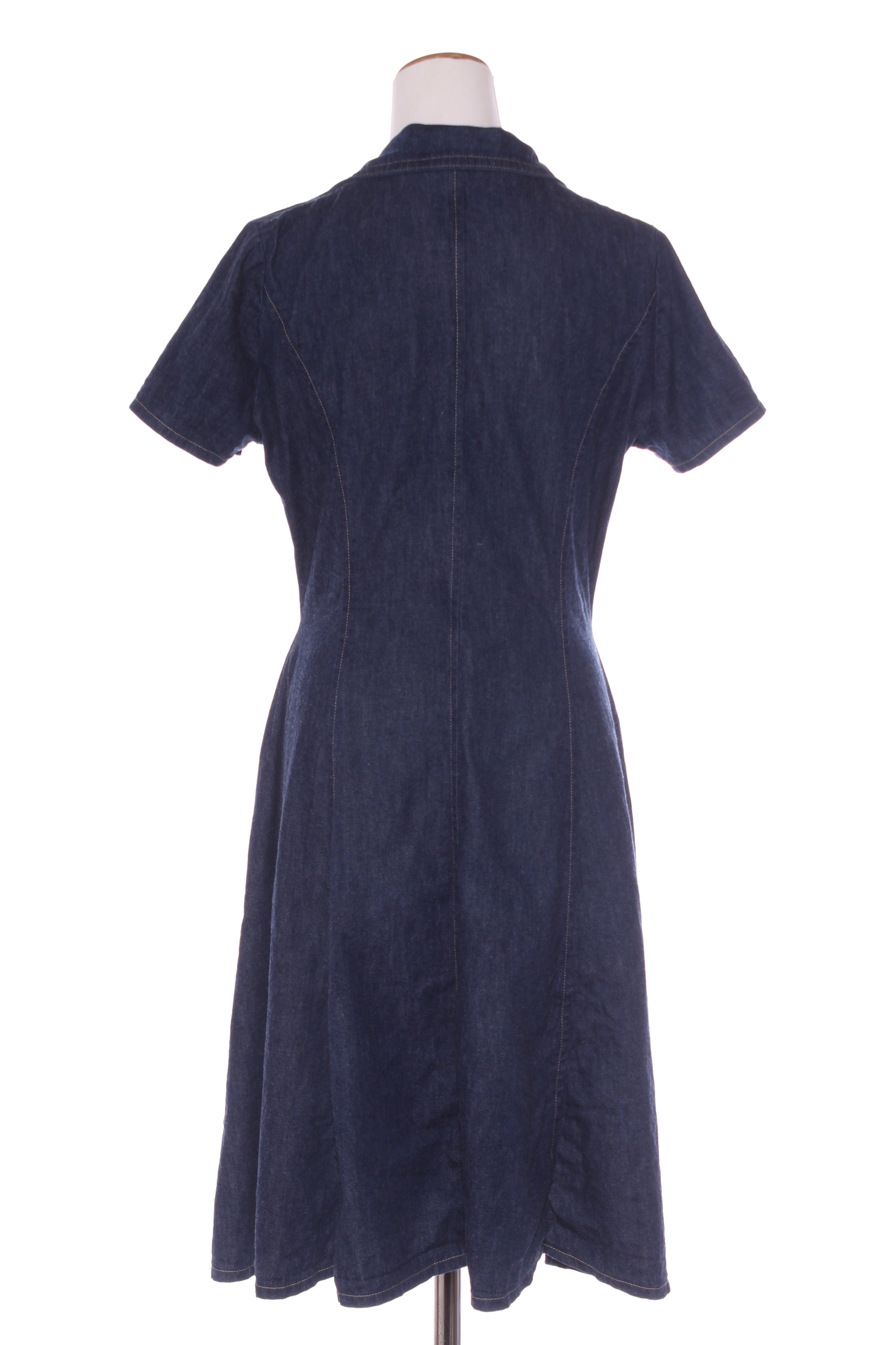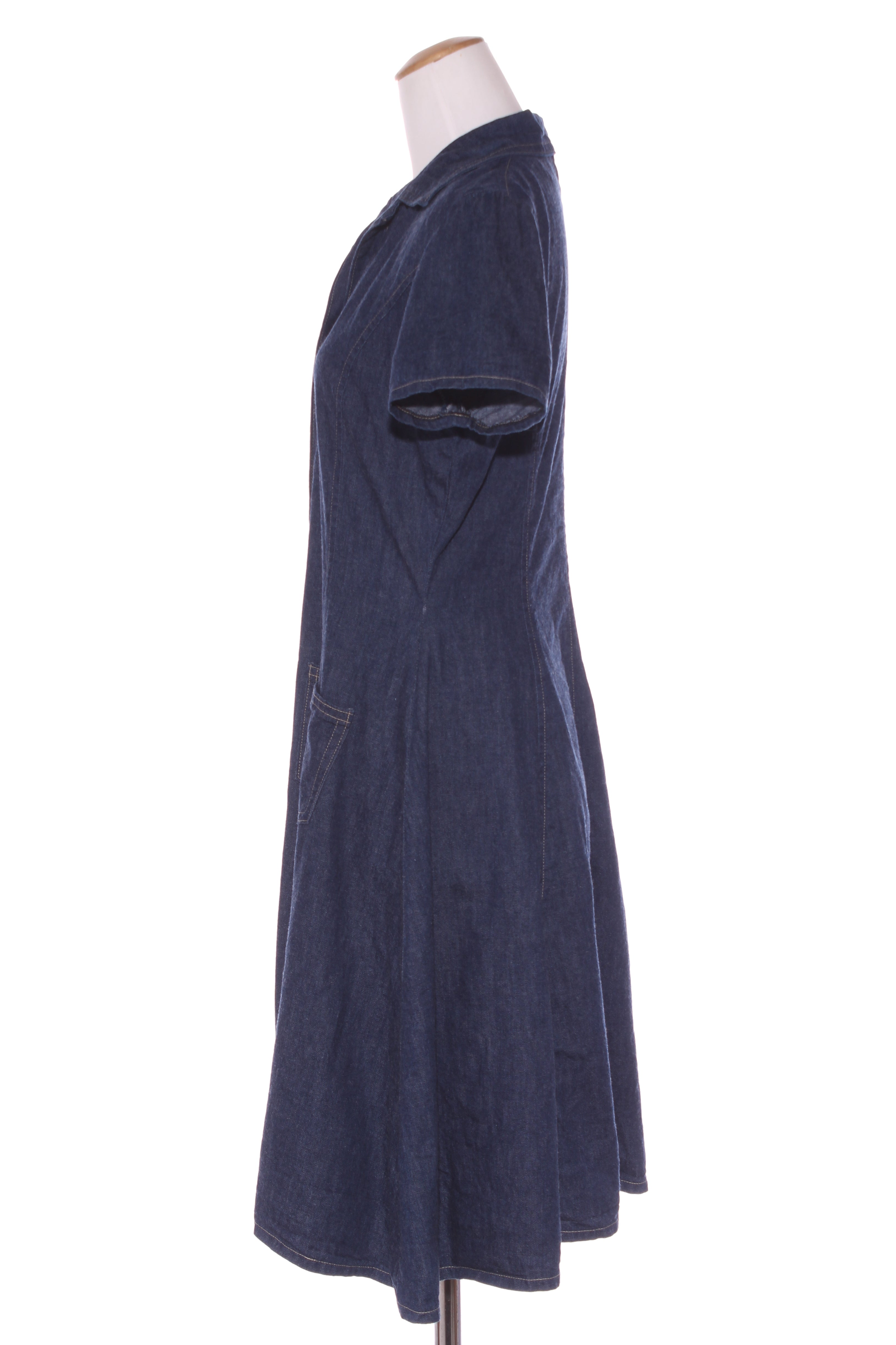 SIZE ON TAG: No tagFITS LIKE: 12COLOUR: Navy blueFABRIC: CottonCONDITION: Excellent prelovedMEASUREMENTS:BUST: 53cms WAIST: 43cms LENGTH: 103cms NOTES: Either vintage or homemade. Button up front. Front...