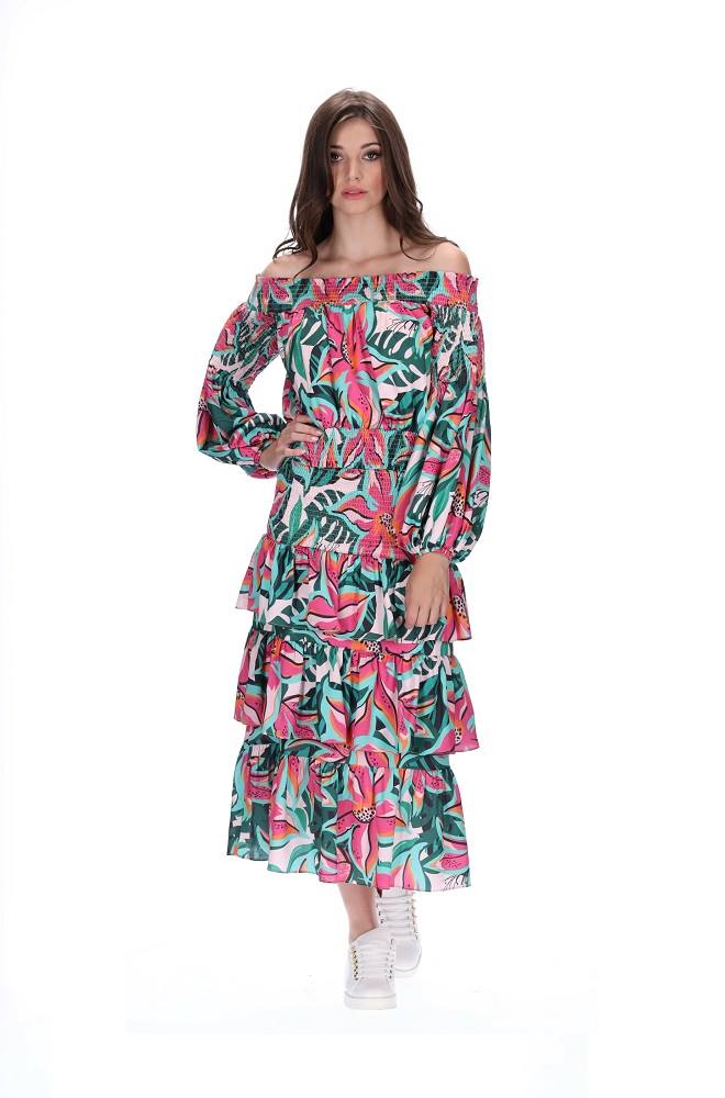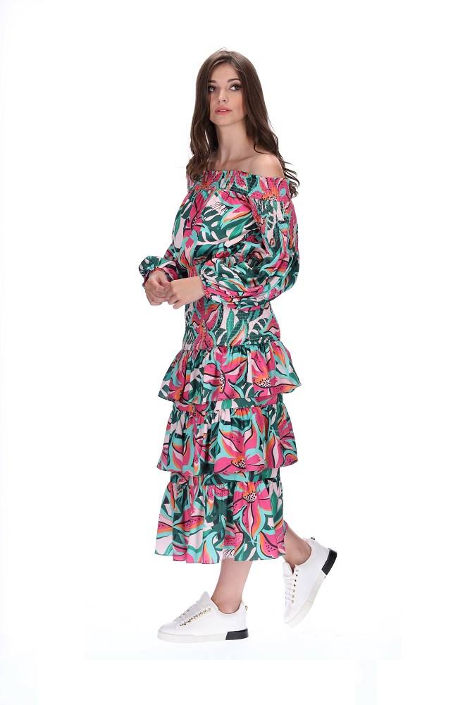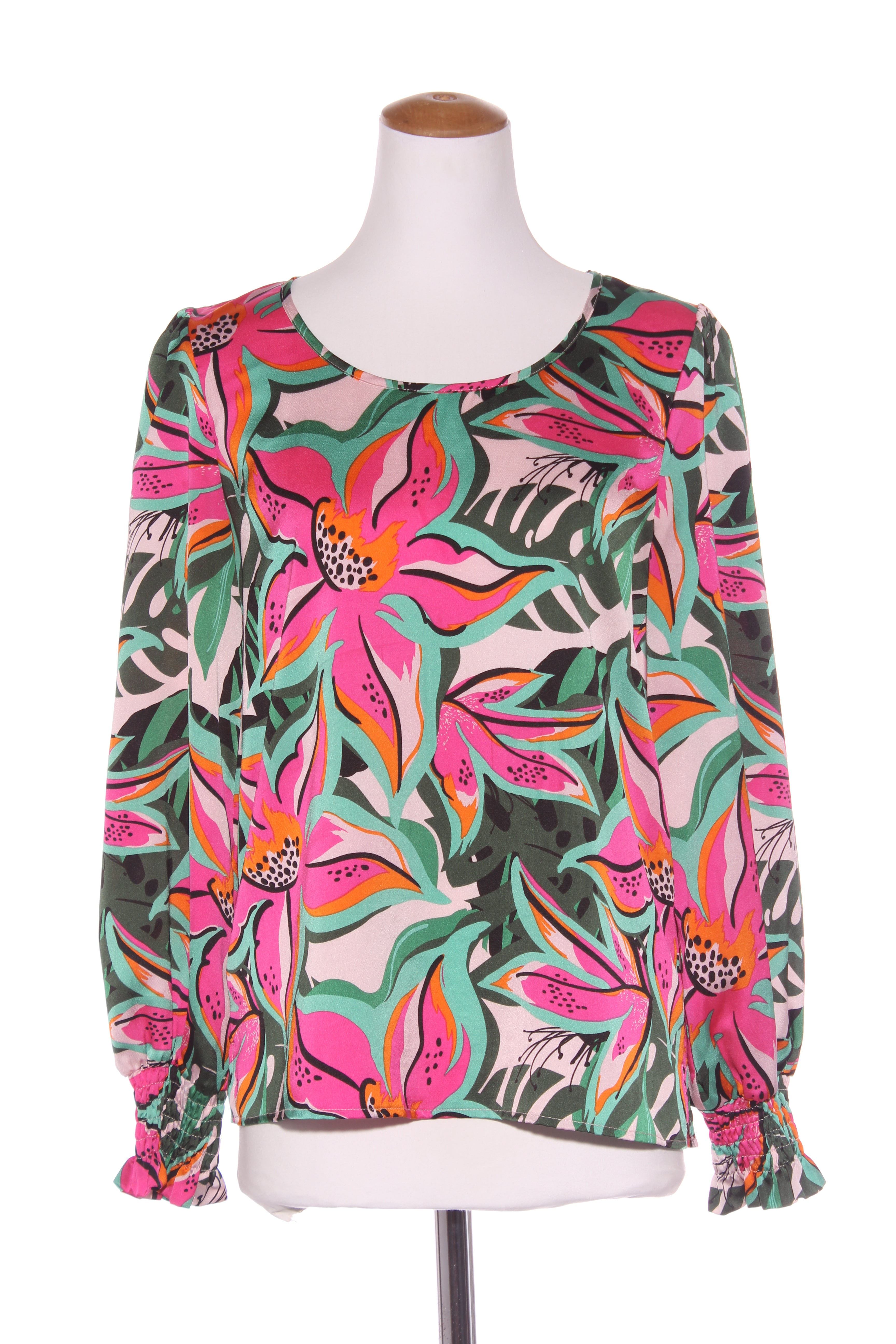 SIZE ON TAG: 8FITS LIKE: 8-10COLOUR: Fluro pink, multiFABRIC: PolyesterCONDITION: Excellent prelovedMEASUREMENTS:BUST: 49cms WAIST: 48cms LENGTH: 65cms NOTES: A gorgeous floral print off-shoulder top with long...