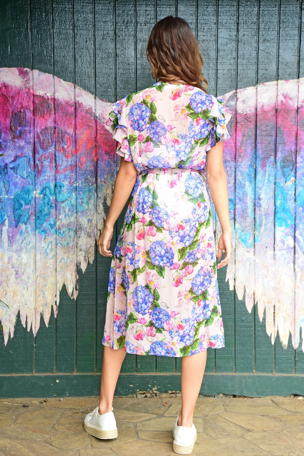 SIZE ON TAG: No tagFITS LIKE: 14COLOUR: Pink, multiFABRIC: No tag, viscoseCONDITION: Excellent prelovedMEASUREMENTS: BUST: 58cms WAIST: 54cms LENGTH: 110-117cmsNOTES: "Hi-di-Hydrangea - Flute yourself" Summer...