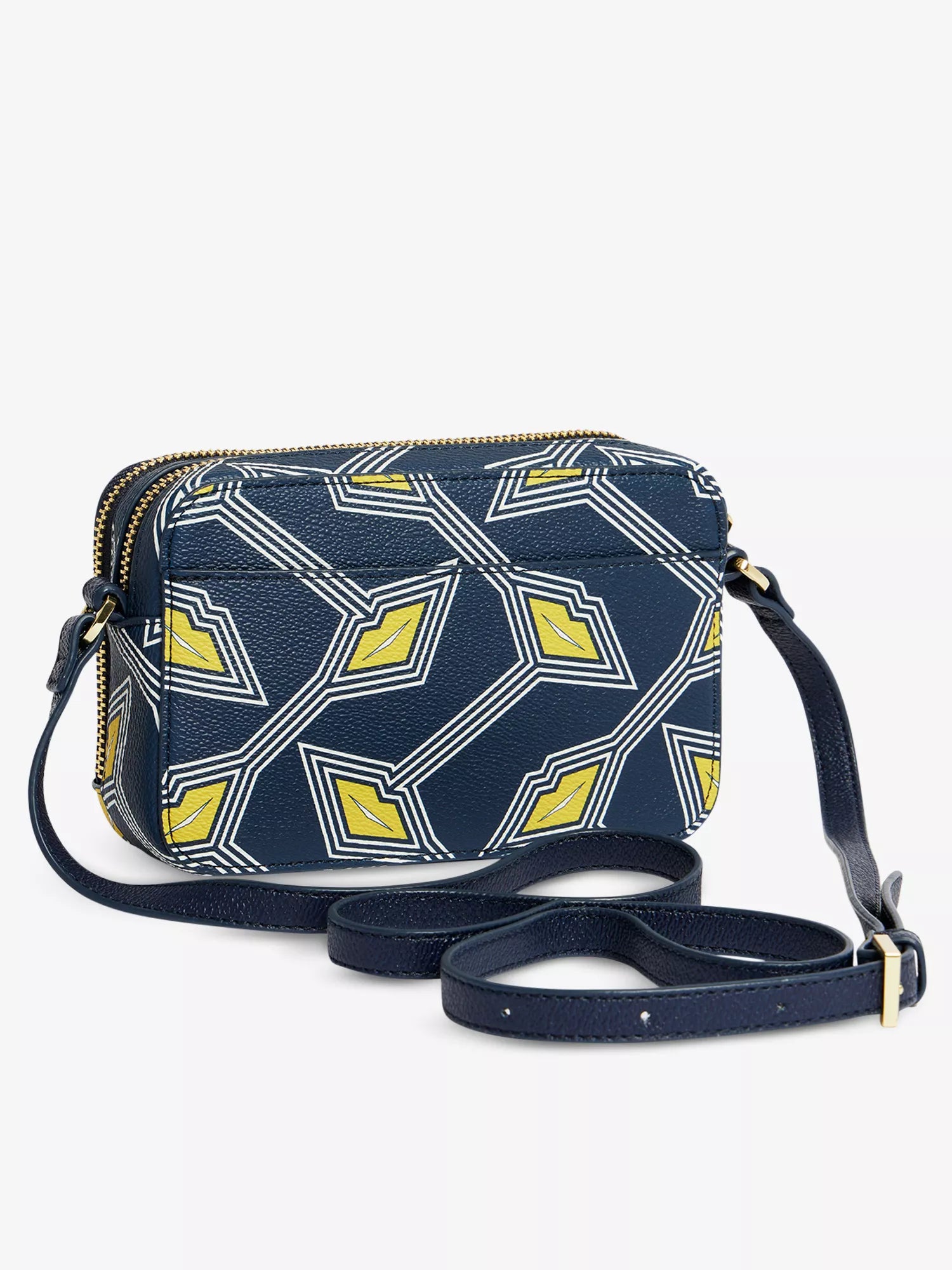 COLOUR: Navy blue, yellow, white, goldFABRIC: polyvinyl chloride; lining 100% polyesterCONDITION: Excellent prelovedMEASUREMENTS:HEIGHT: 11cms WIDTH: 17cms DEPTH: 5cms STRAP: 110-126cms NOTES: Sealed with a...