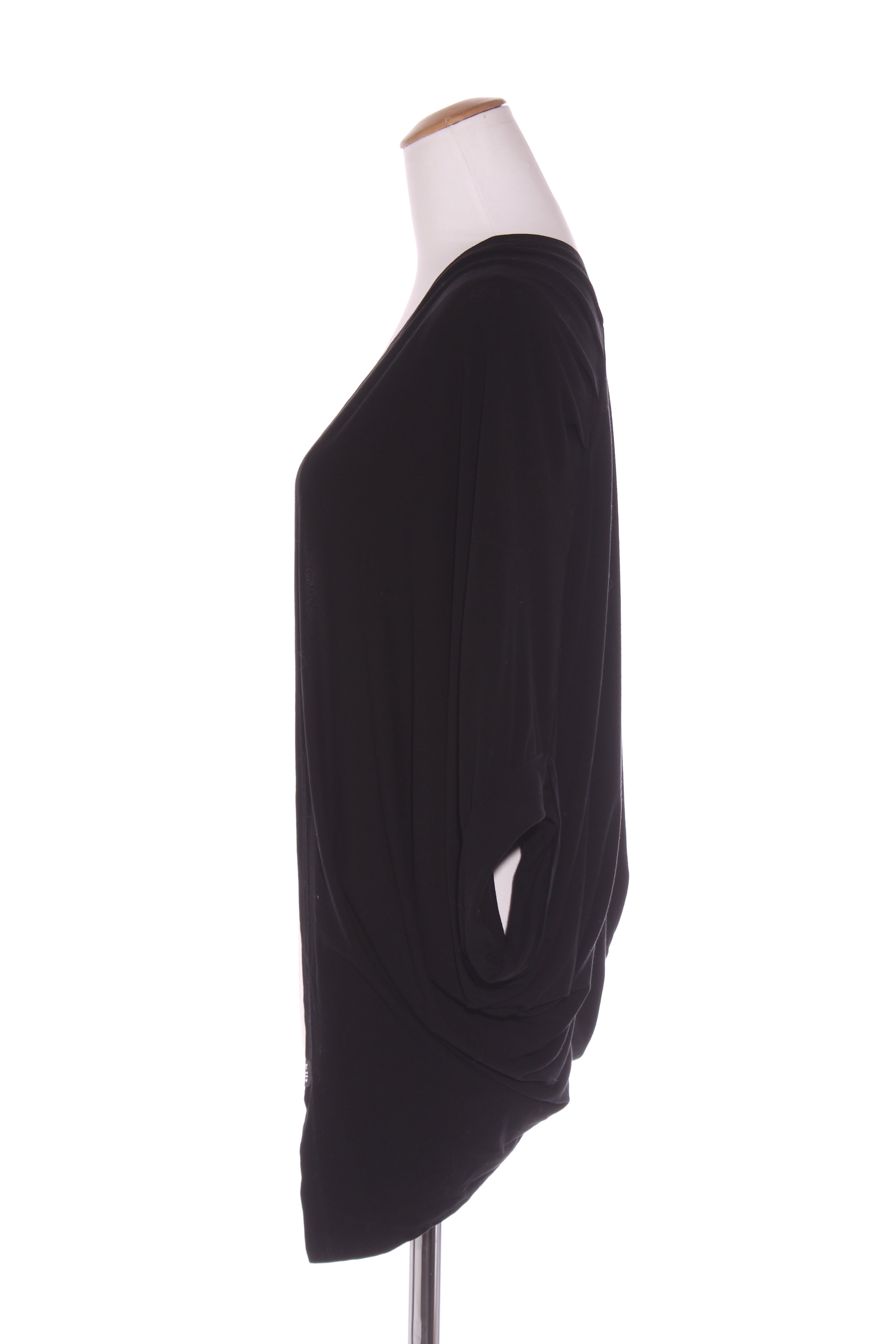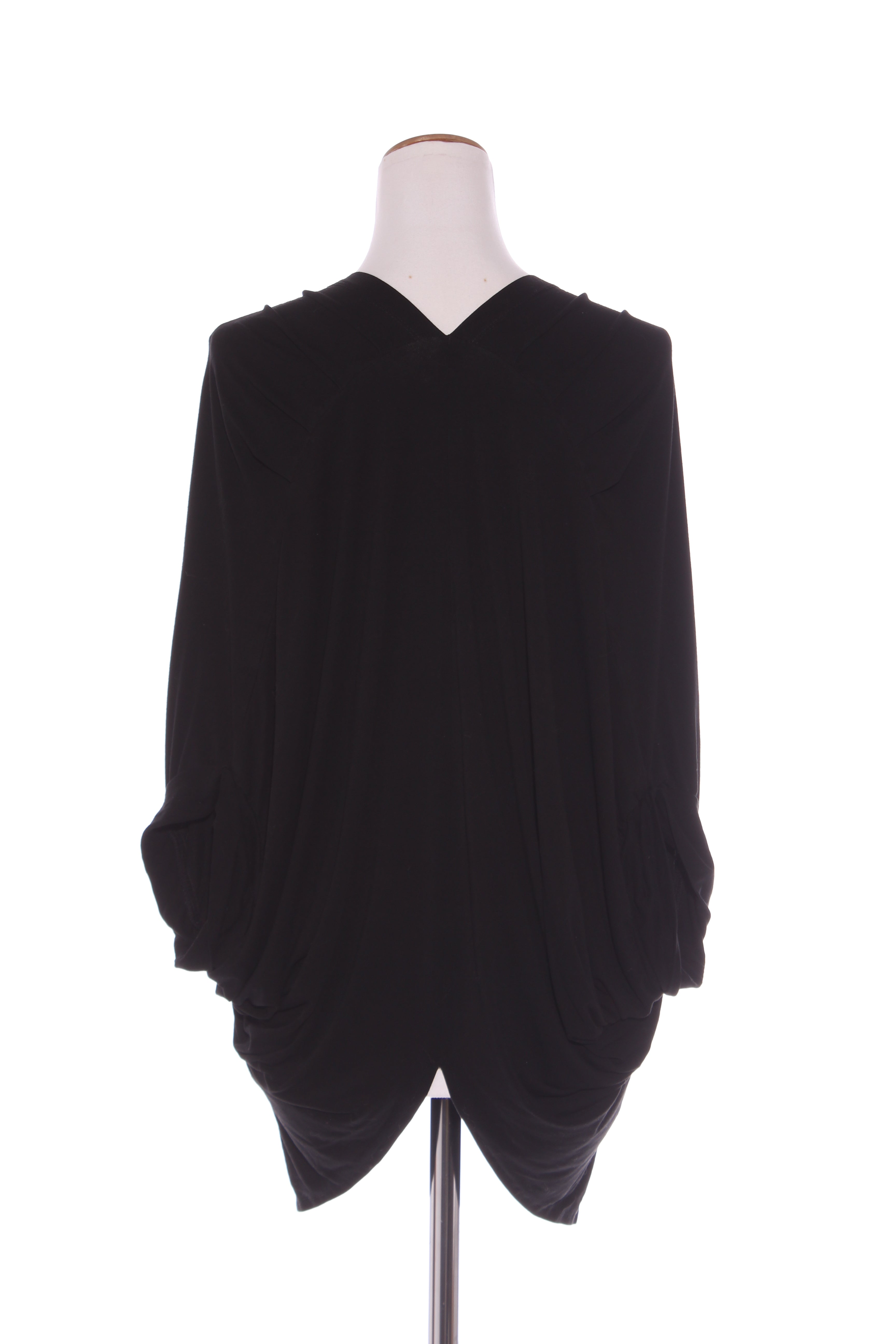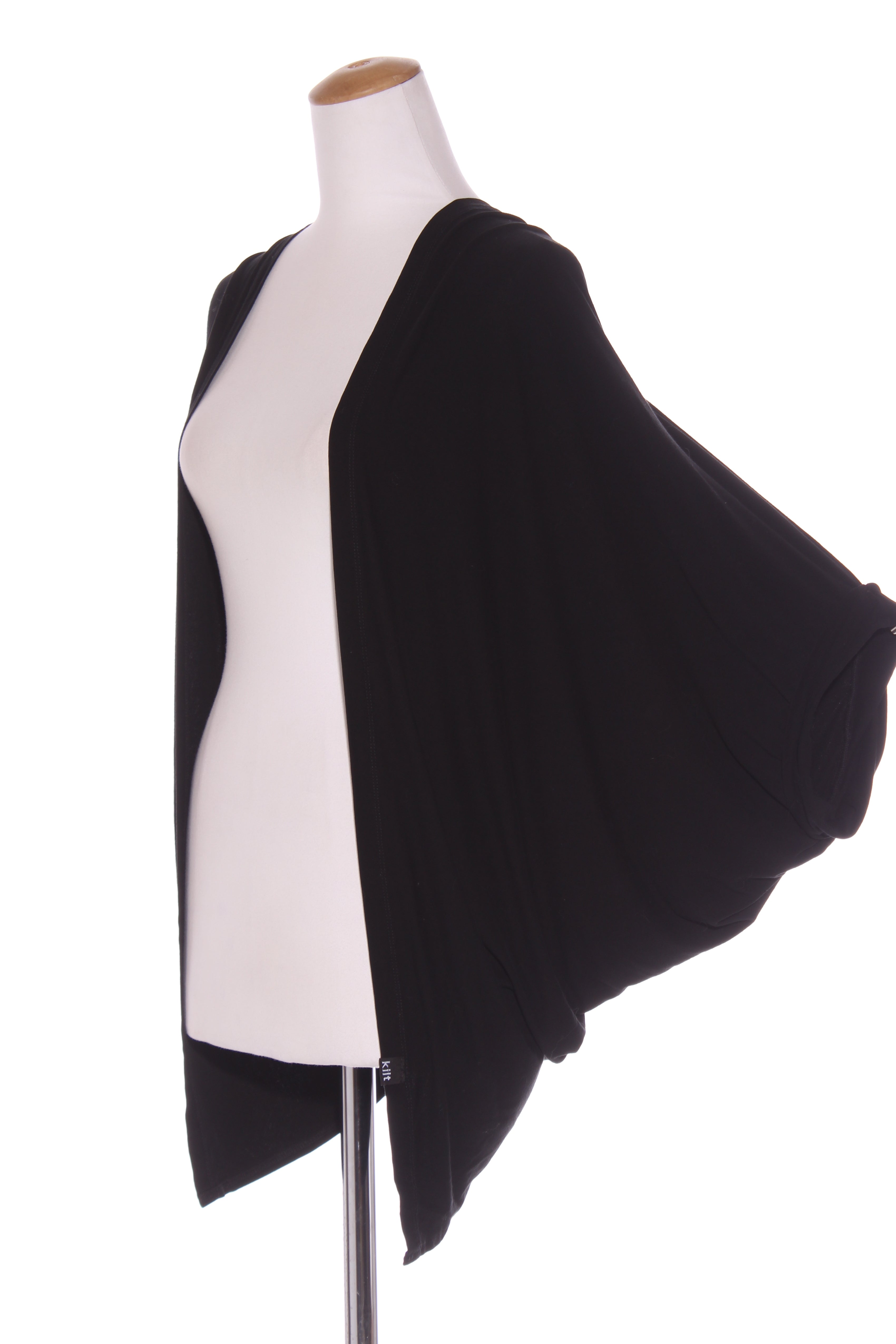 SIZE ON TAG: OSFAFITS LIKE: 8-18COLOUR: BlackFABRIC: Viscose, spandexCONDITION: Excellent prelovedMEASUREMENTS:BUST: Free WAIST: Free LENGTH: 64-85cmsNOTES: Made in NZ. Open front no fastening. Fabric has stretch.