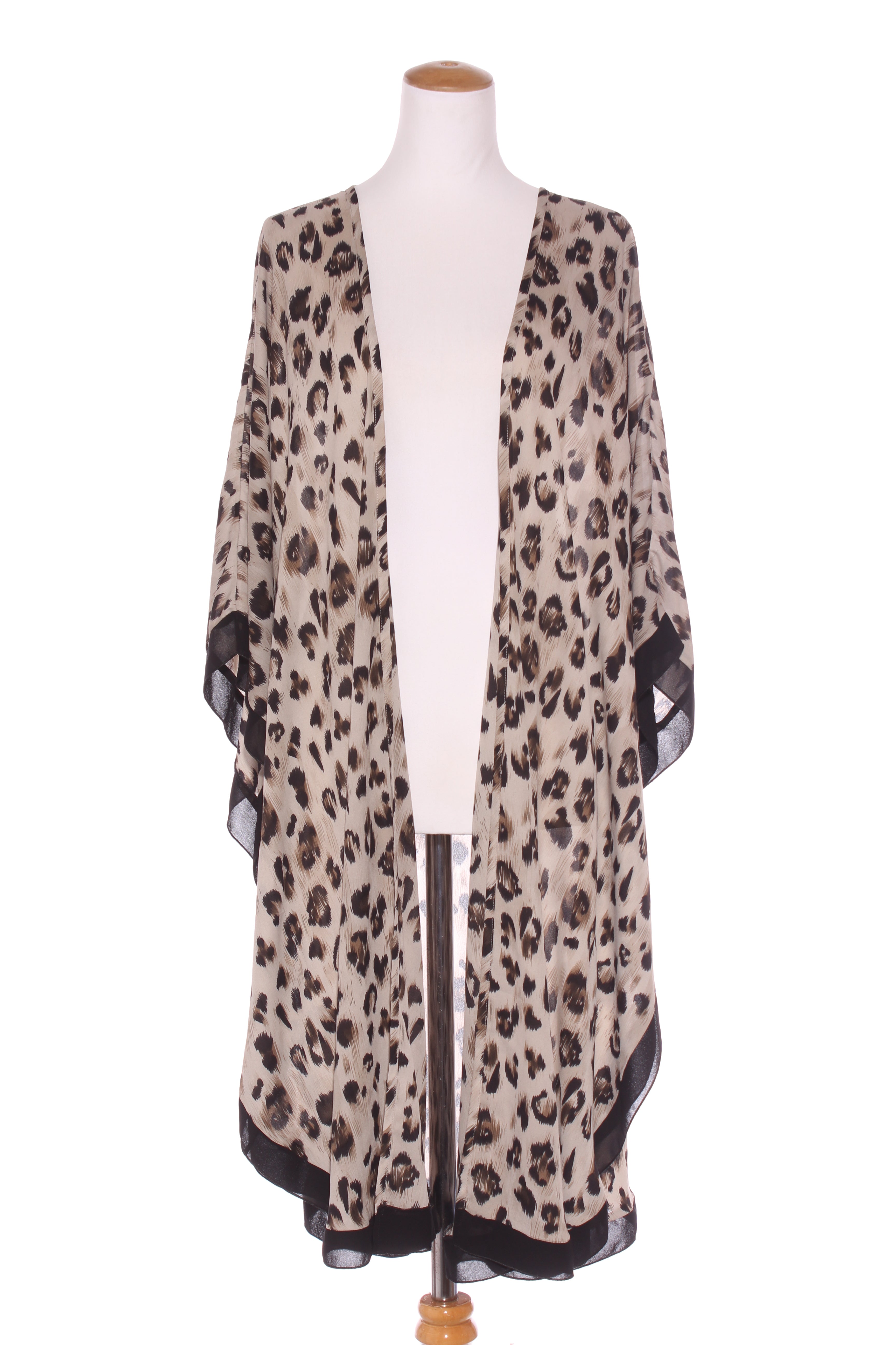 SIZE ON TAG: O/SFITS LIKE: 8-18COLOUR: Beige, black, brownFABRIC: PolyesterCONDITION: Excellent prelovedMEASUREMENTS:BUST: Free WAIST: Free LENGTH: 113cmsNOTES: Open front no fastening.
