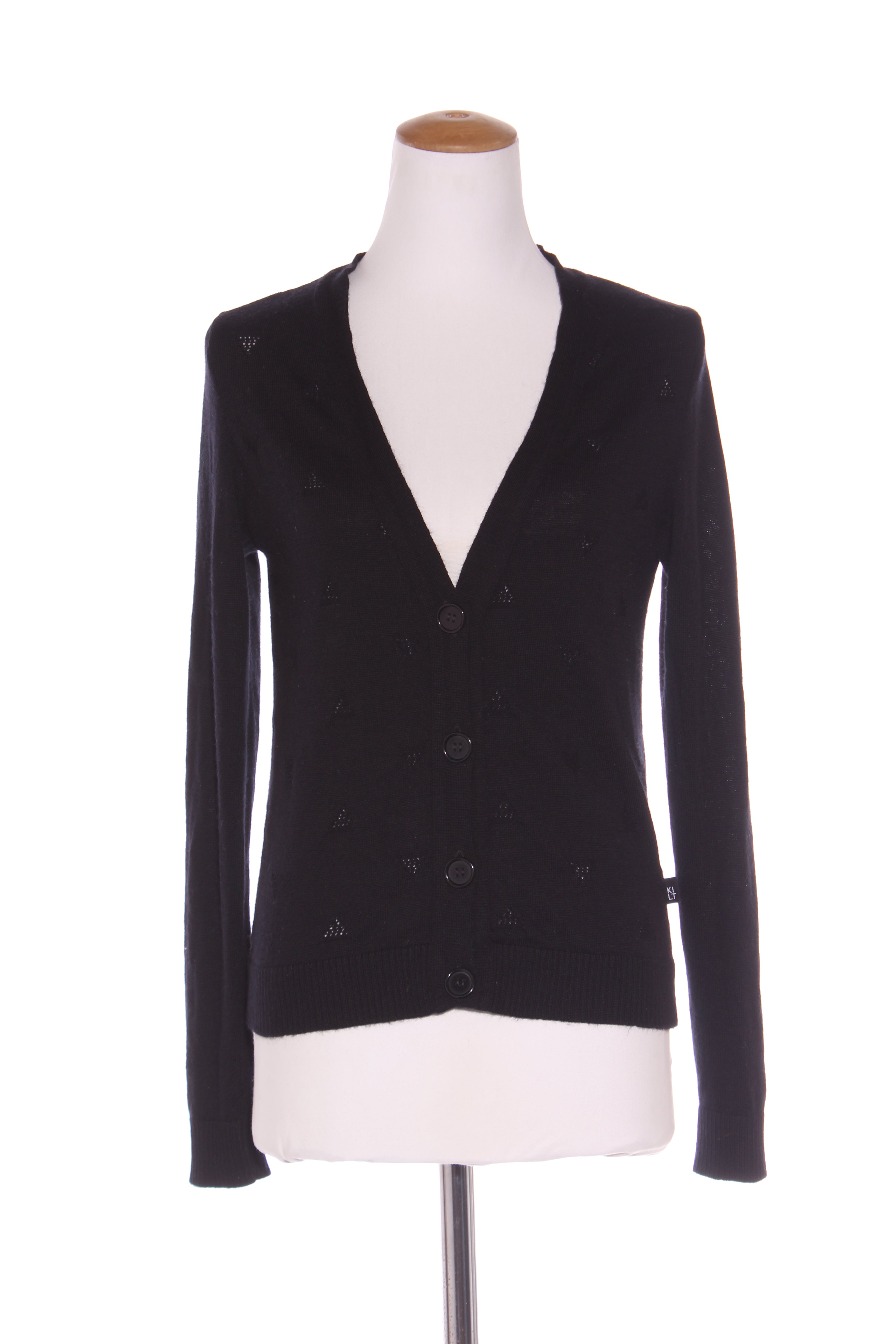 SIZE ON TAG: SFITS LIKE: 10COLOUR: BlackFABRIC: Tag removed, merinoCONDITION: Excellent prelovedMEASUREMENTS:BUST: 46cms WAIST: 43cms LENGTH: 58cms NOTES: Made in NZ. Front triangle detailing. Button up...