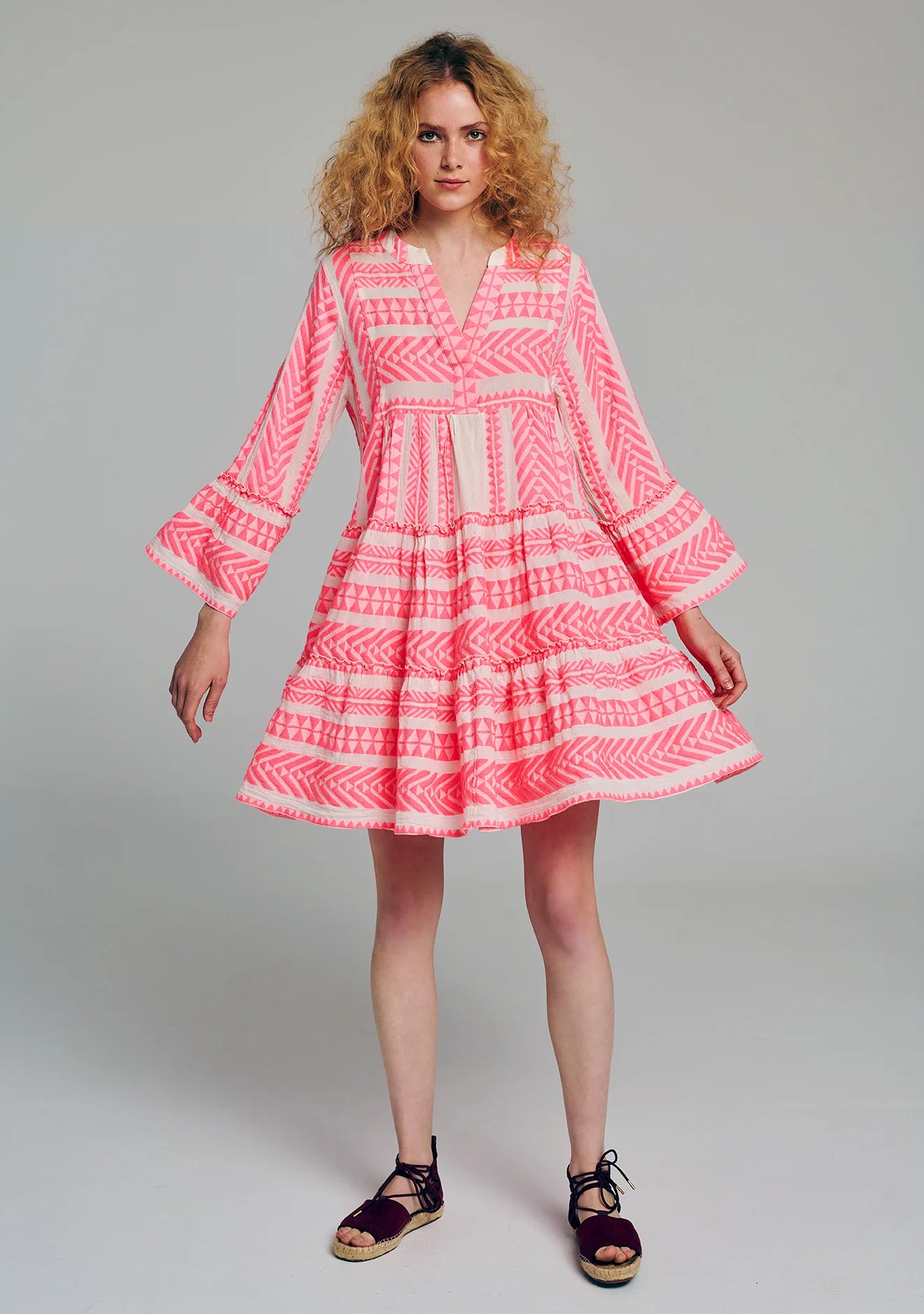 SIZE ON TAG: MFITS LIKE: 12COLOUR: Fluro pink, whiteFABRIC: 97% cotton, 3% polyesterCONDITION: Excellent prelovedMEASUREMENTS:BUST: 51cms WAIST: 52cms LENGTH: 95cmsNOTES: A-lineTunic v-neckline with snap buttonLong sleevesFlared...