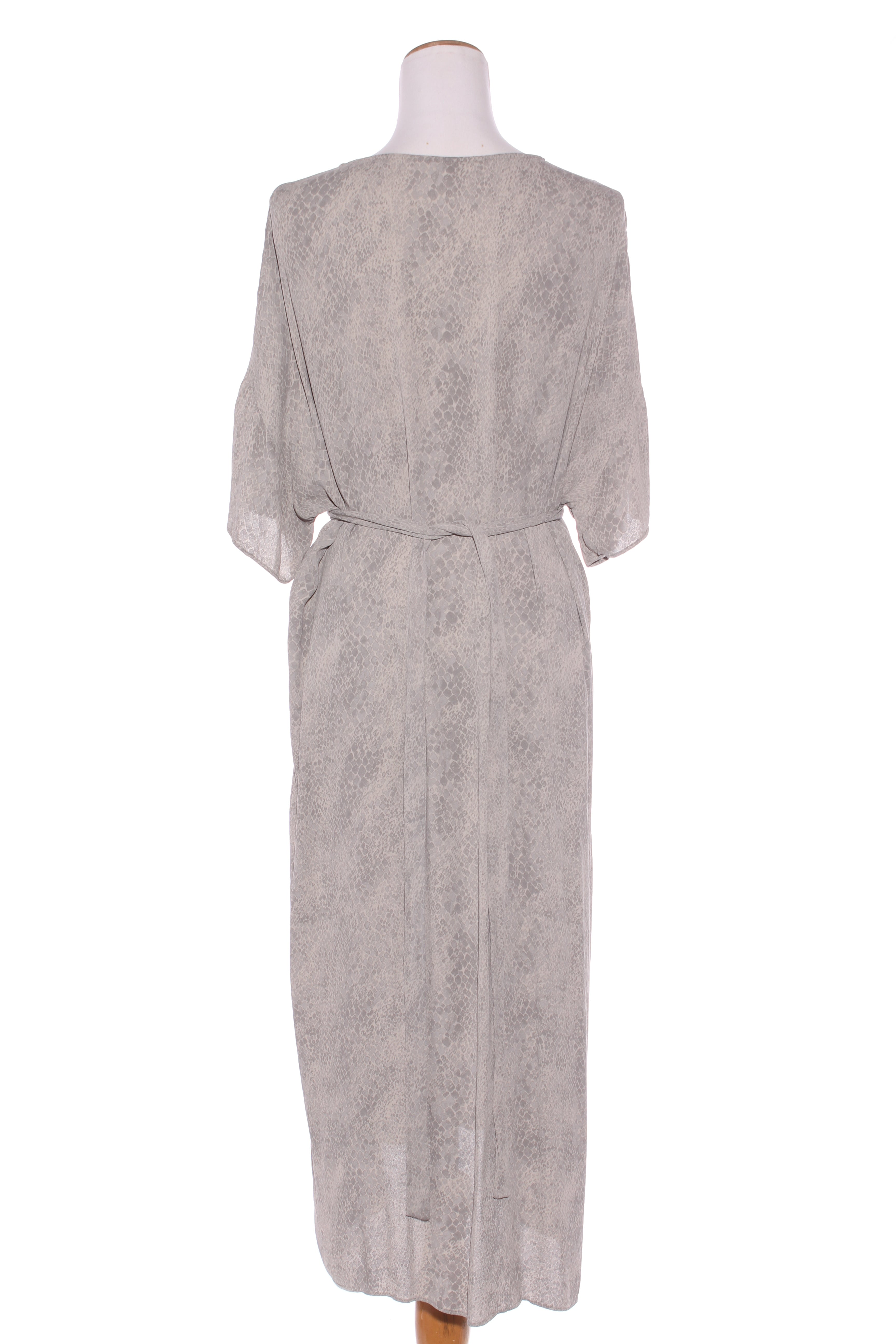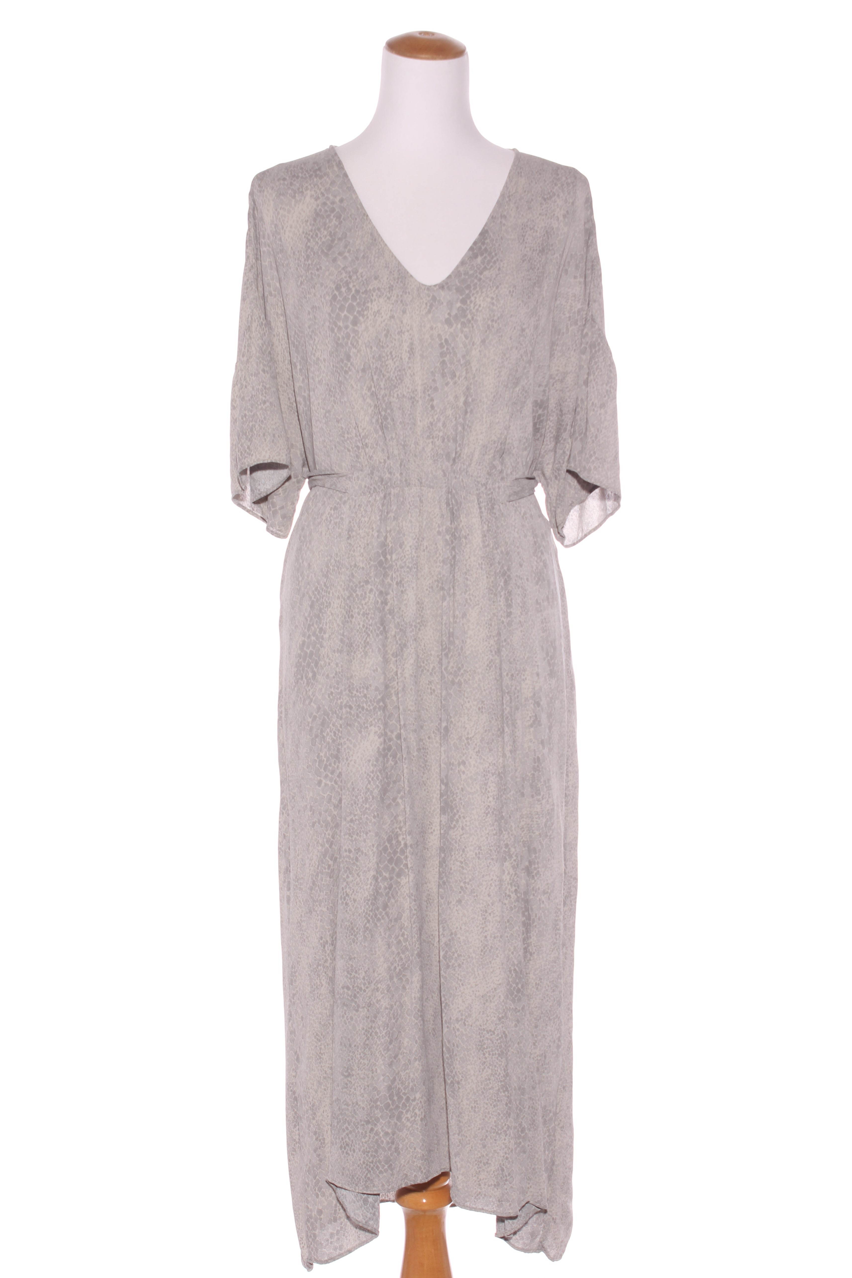 SIZE ON TAG: 14FITS LIKE: N/ACOLOUR: Grey, stone greyFABRIC: ViscoseCONDITION: Excellent prelovedMEASUREMENTS:BUST: 66cms WAIST: 55cms LENGTH: 119-130cmsNOTES: Snakeskin print. Pull over style. Front waist ties fasten...