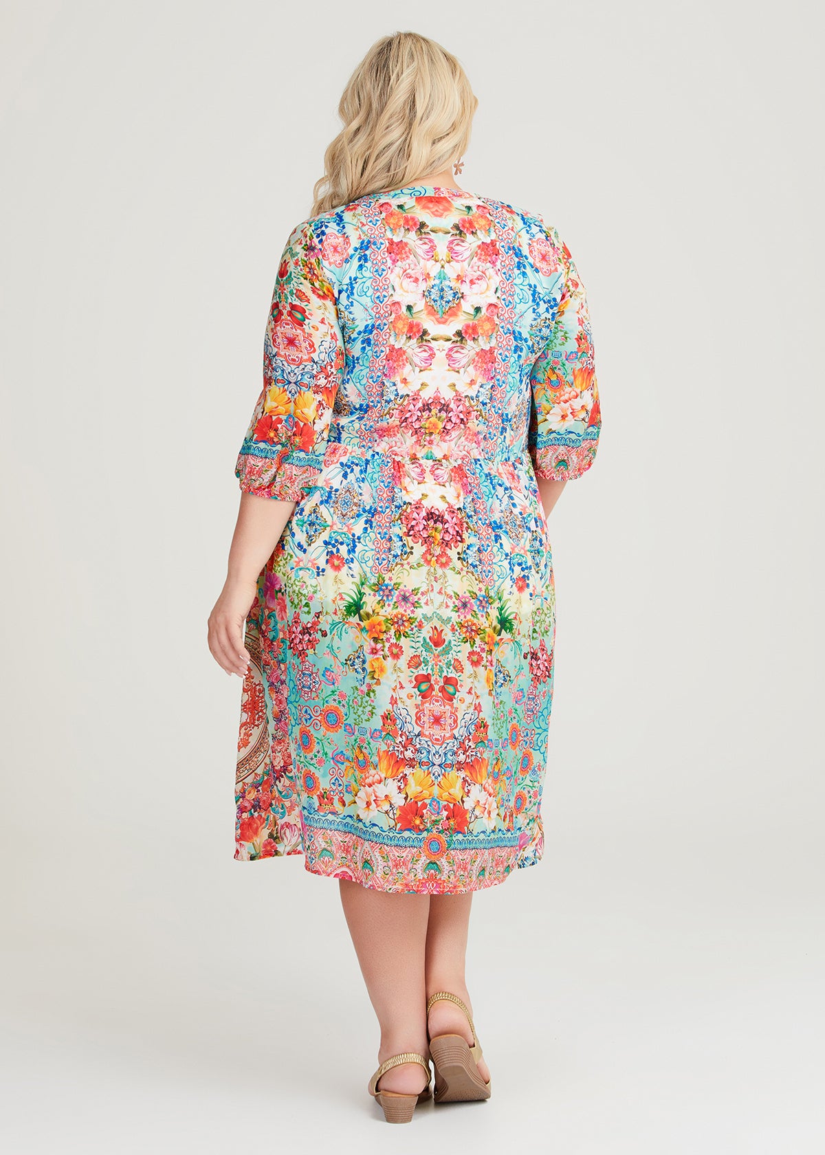 SIZE ON TAG: 18FITS LIKE: N/ACOLOUR: MultiFABRIC: ViscoseCONDITION: Excellent prelovedMEASUREMENTS:BUST: 65cms WAIST: 67cms LENGTH: 116cmsNOTES: Soft and natural viscose fabric Mid length dress V neckline Side...