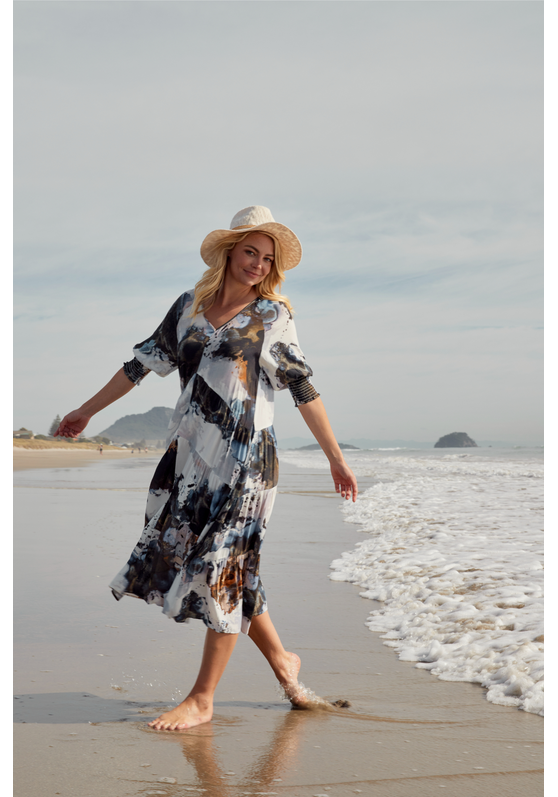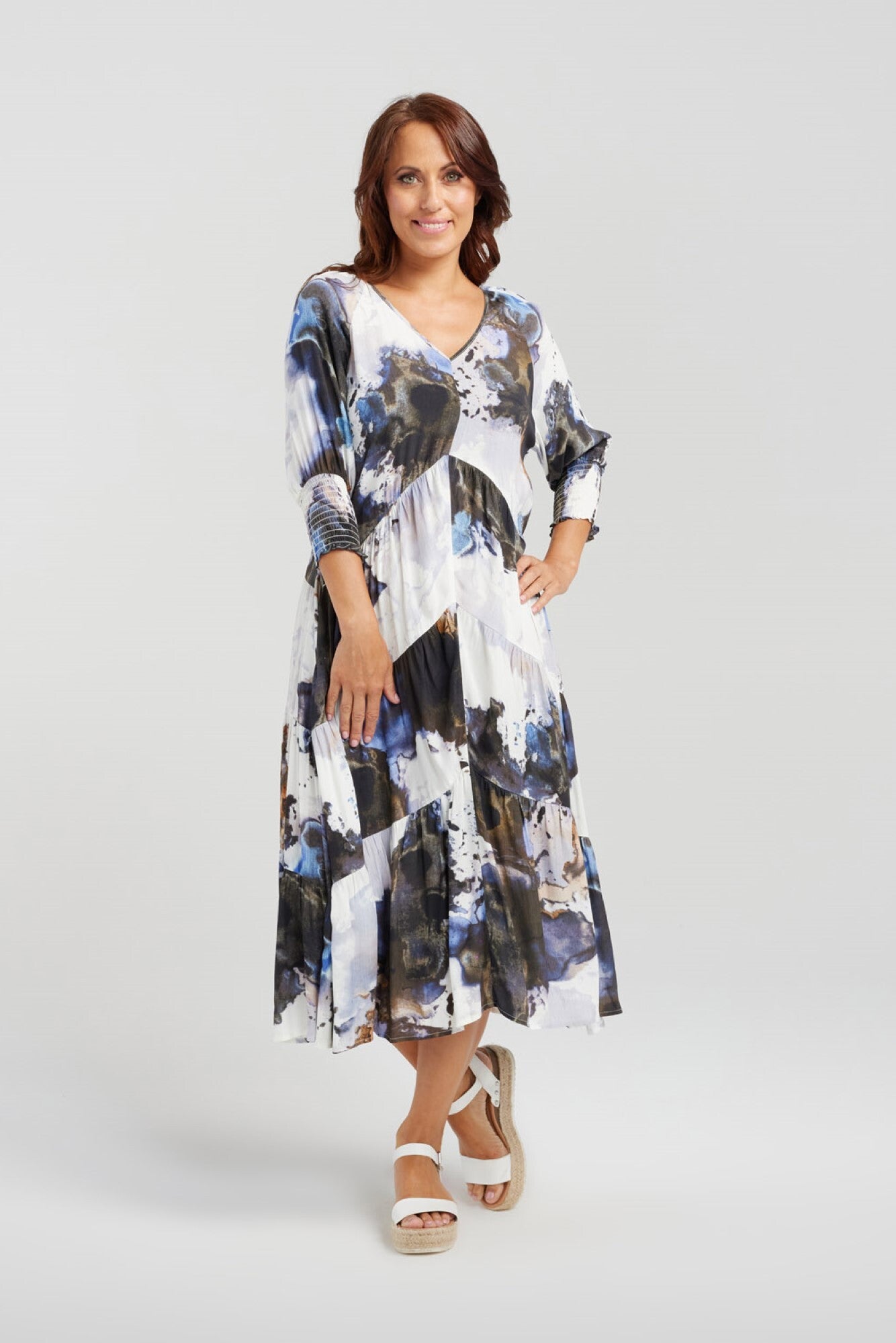 SIZE ON TAG: MFITS LIKE: 12COLOUR: Blue, black, whiteFABRIC: Rayon/viscose twillCONDITION: Brand new with tagMEASUREMENTS:BUST: 53cms WAIST: 56cms LENGTH: 97-107cmsNOTES: Pull over style.