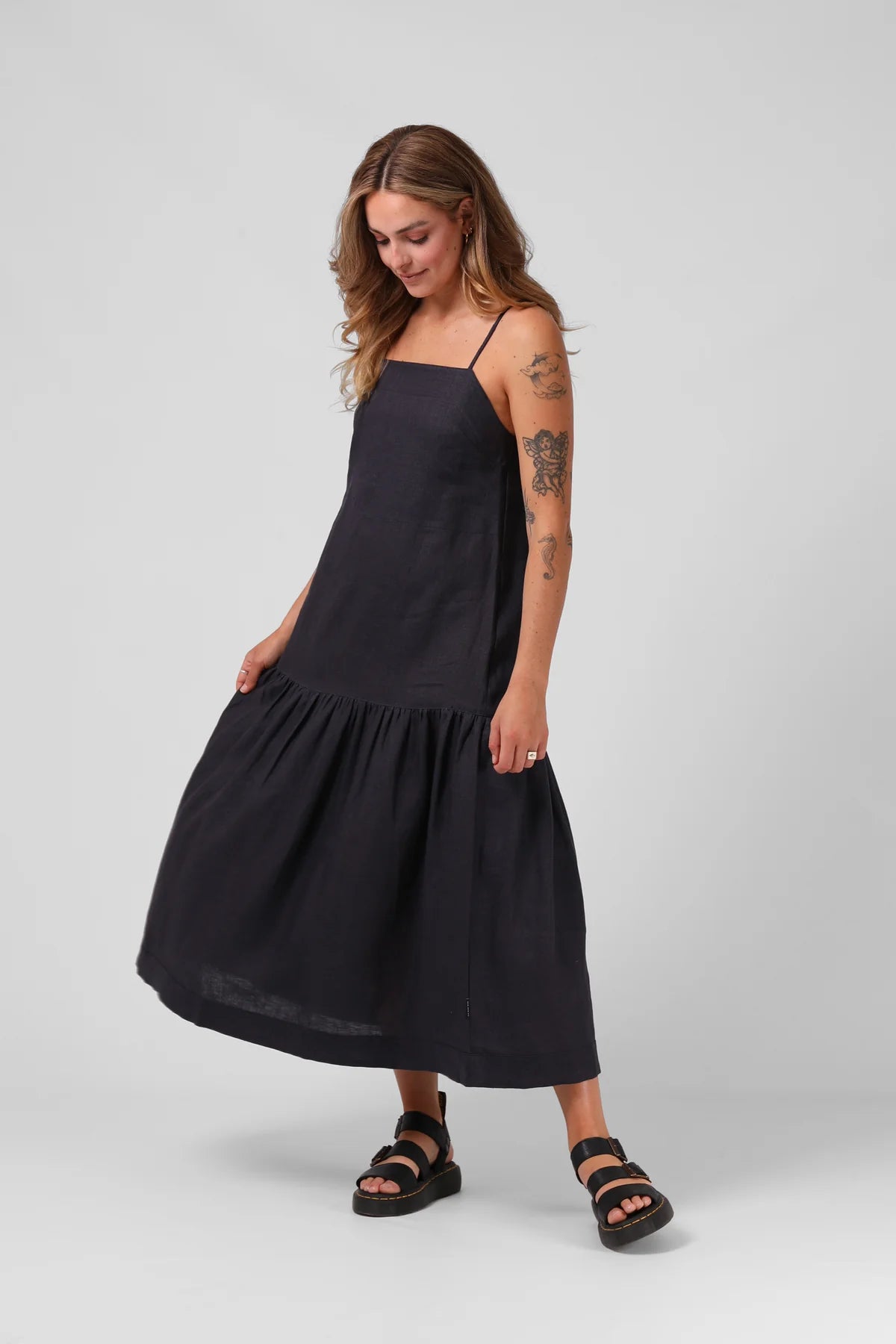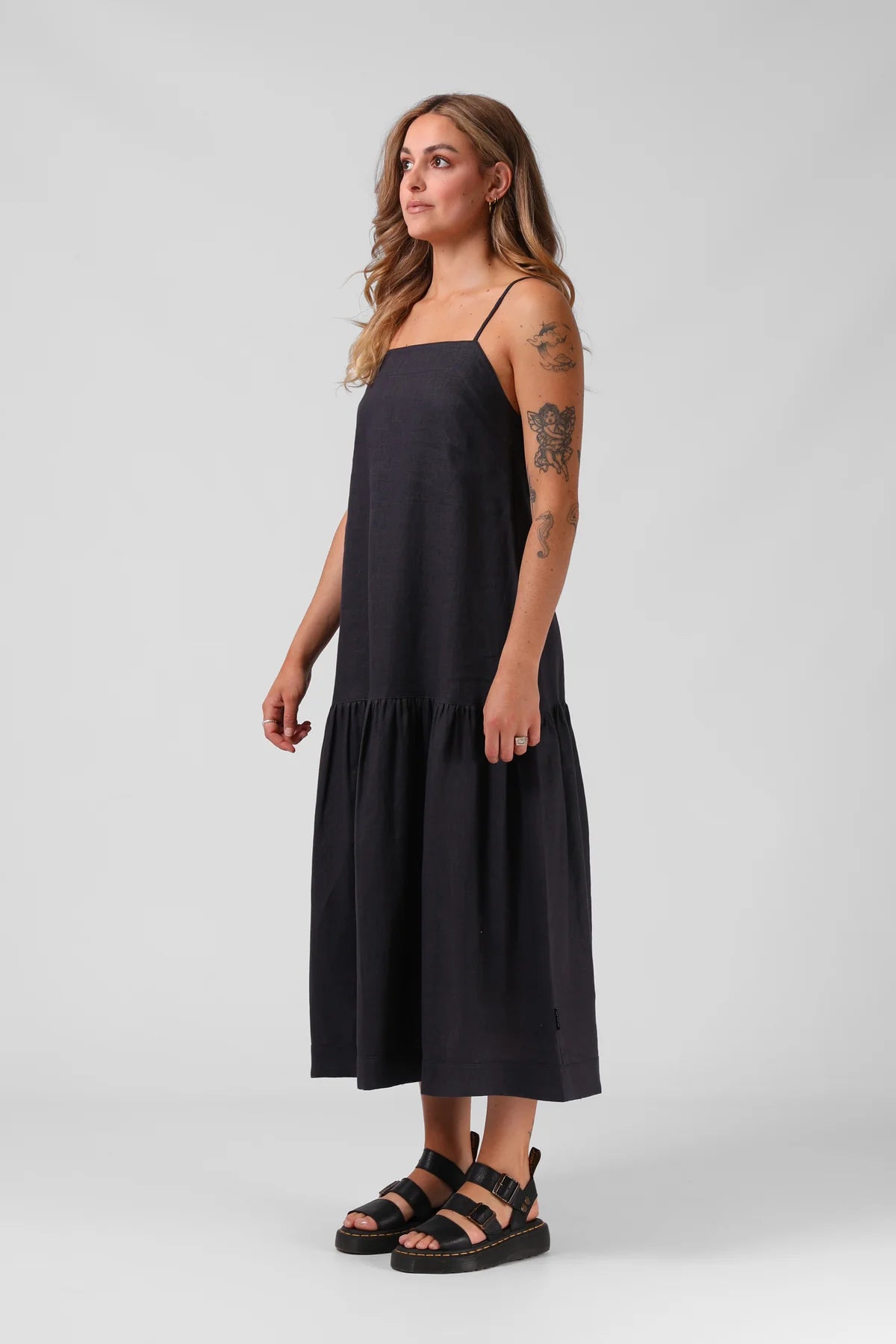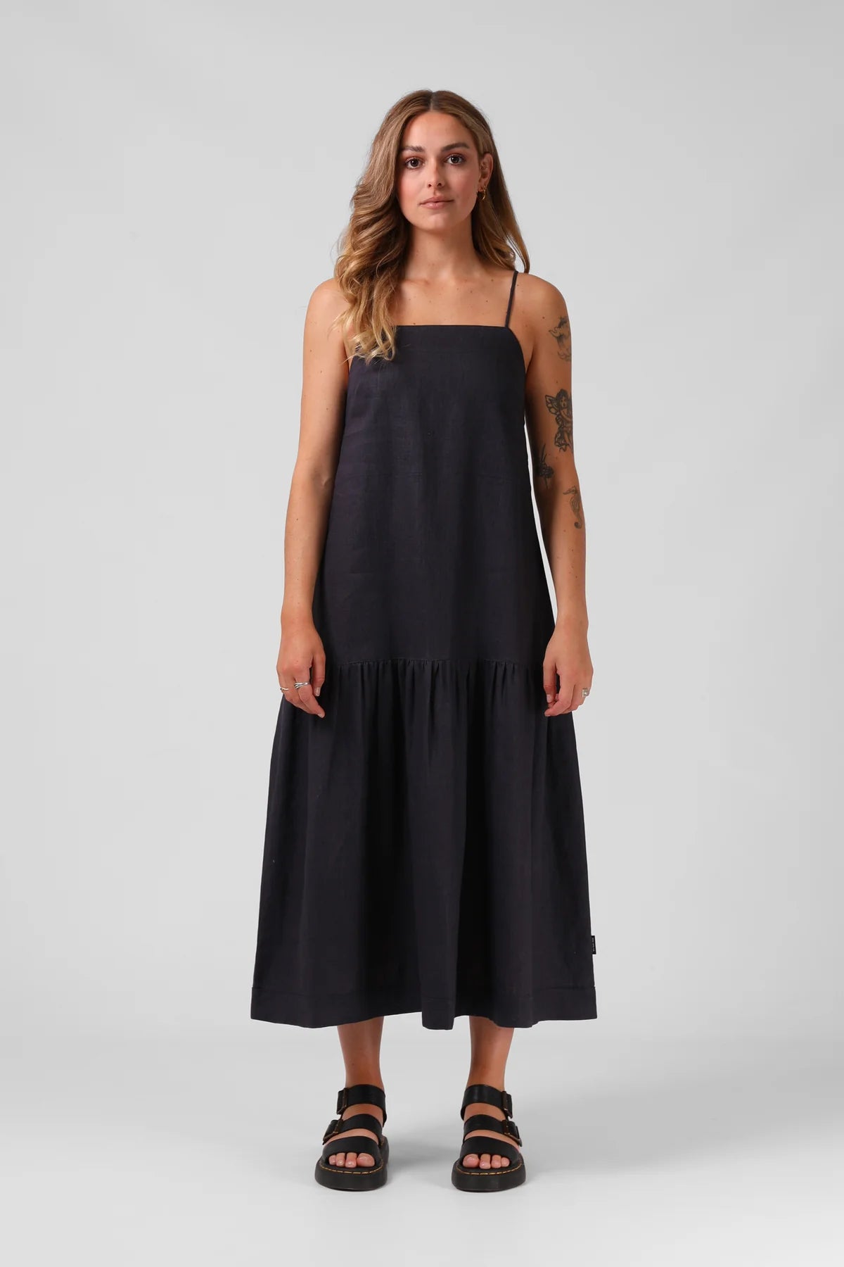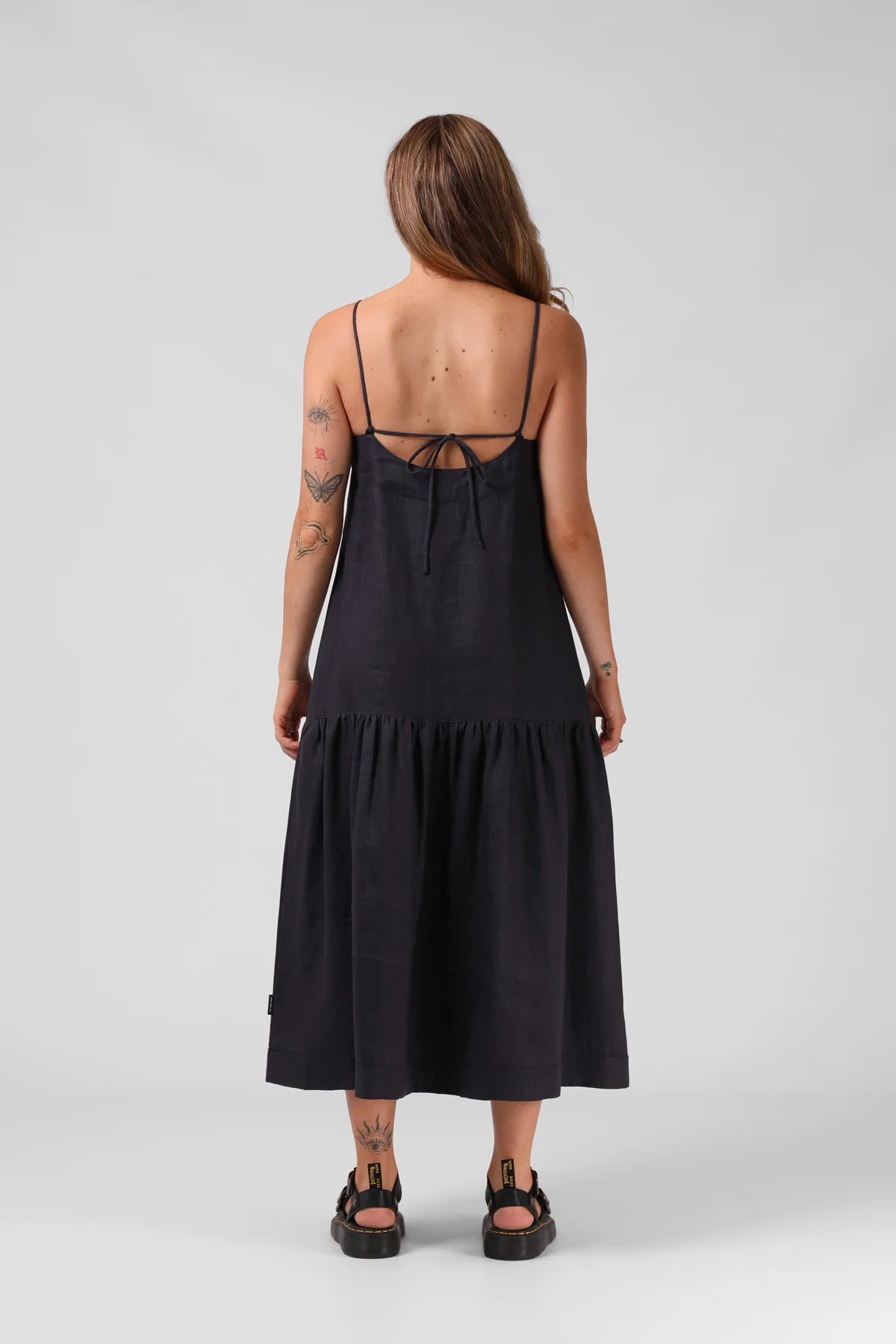 NOTES: Linen Blend, Dropped Waist, Full Length, Ruched Bottom Tier, Adjustable Straps, Back Self-Tie Detailing.