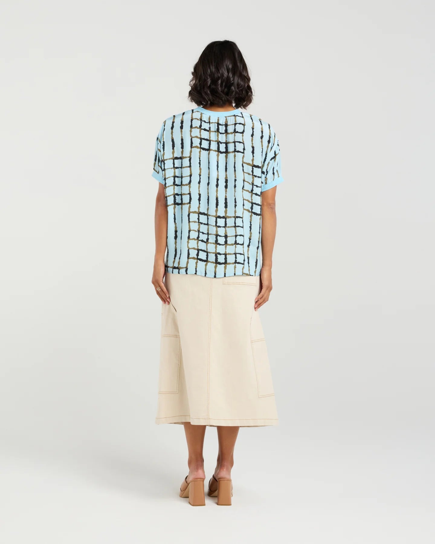 SIZE ON TAG: 14FITS LIKE: N/ACOLOUR: Blue, taupe, brownFABRIC: 52% viscose, 48% rayon - has a slight sheen - looks like silkCONDITION: Like newMEASUREMENTS:BUST: 65cms WAIST: 65cms ...