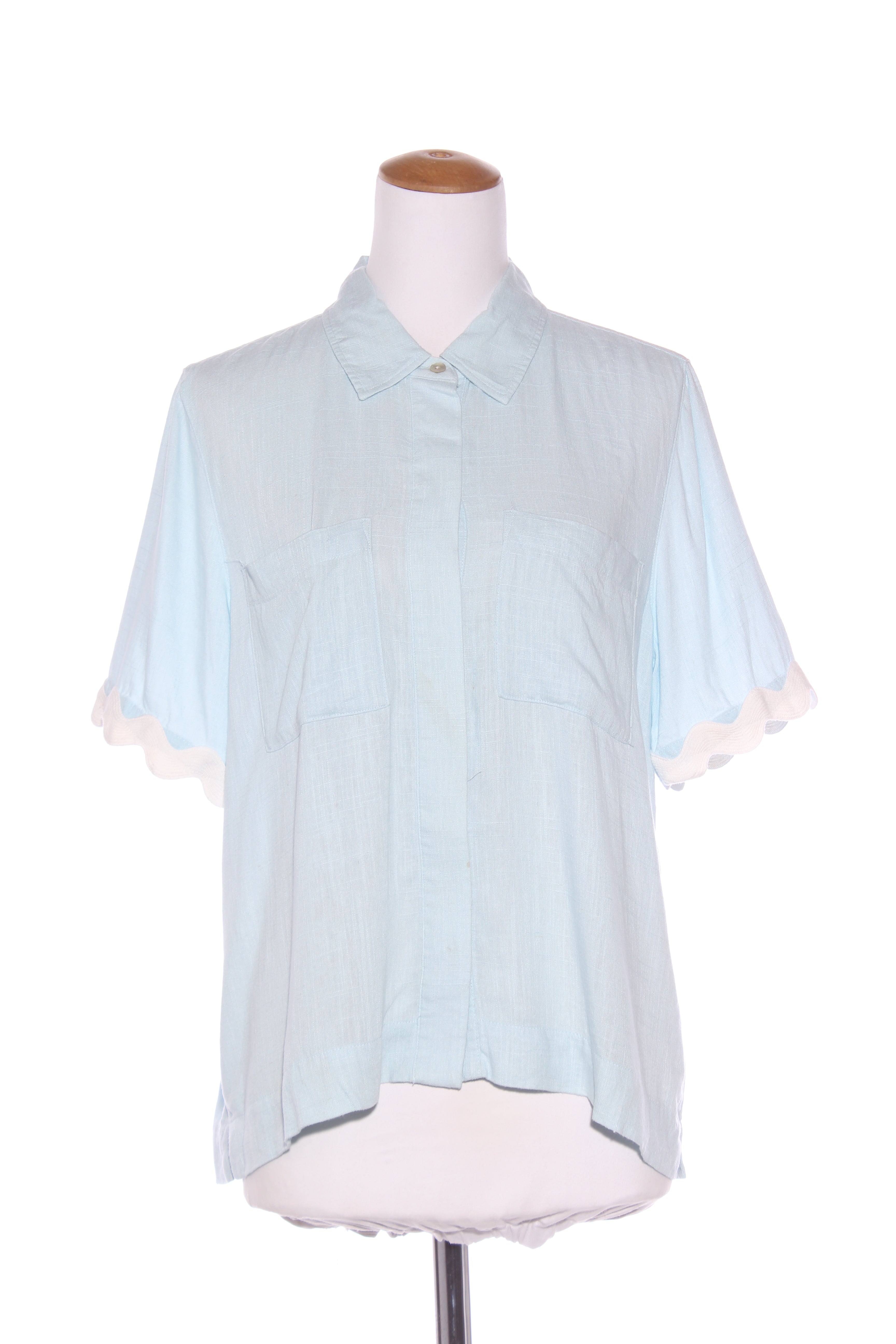 SIZE ON TAG: 12FITS LIKE: N/ACOLOUR: Light blue, whiteFABRIC: 70% viscose, 30% linen, Trim - cottonCONDITION: Excellent prelovedMEASUREMENTS:BUST: 54cms WAIST: 55cms LENGTH: 62-69cmsNOTES: Button up front. ...
