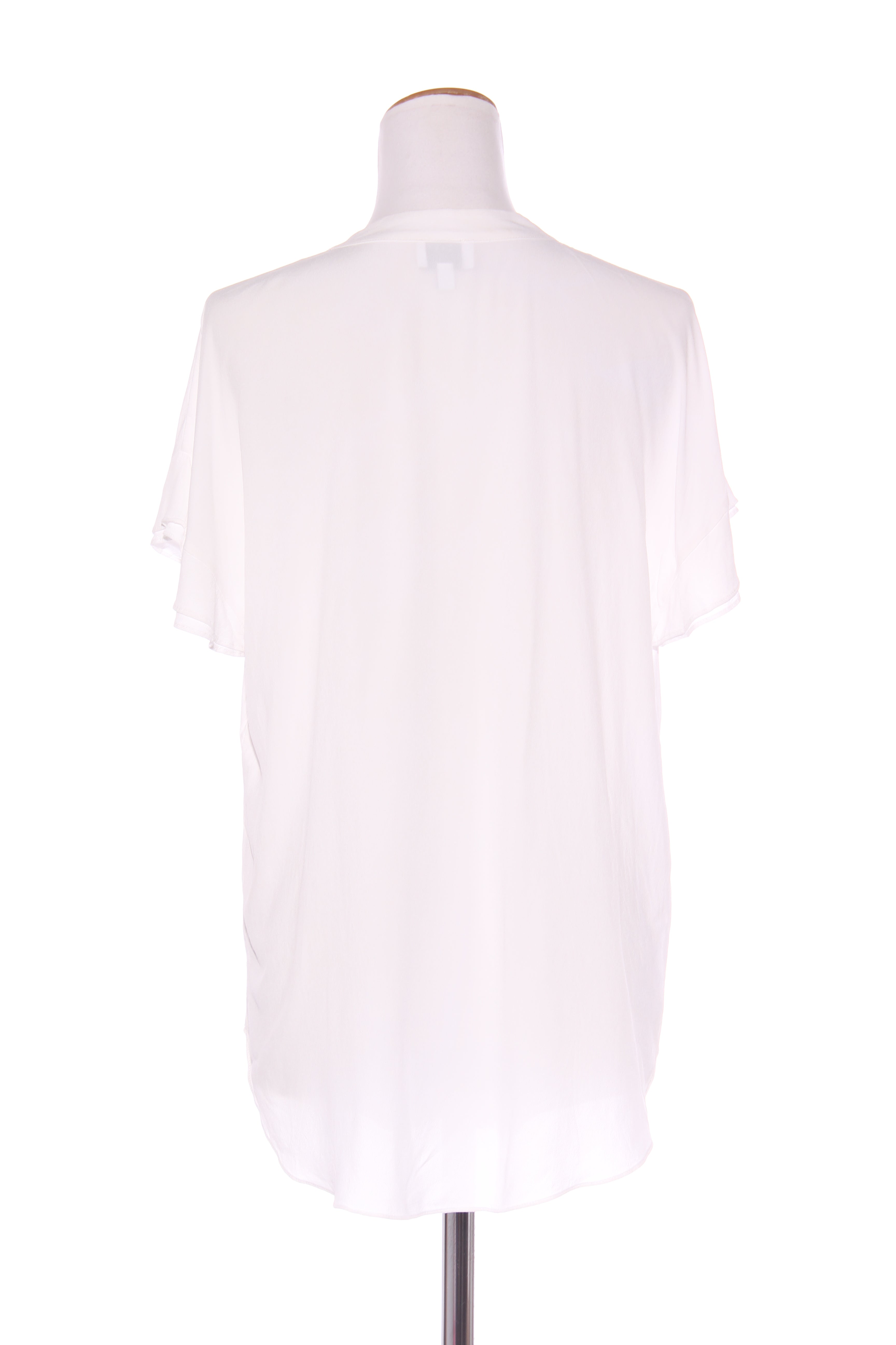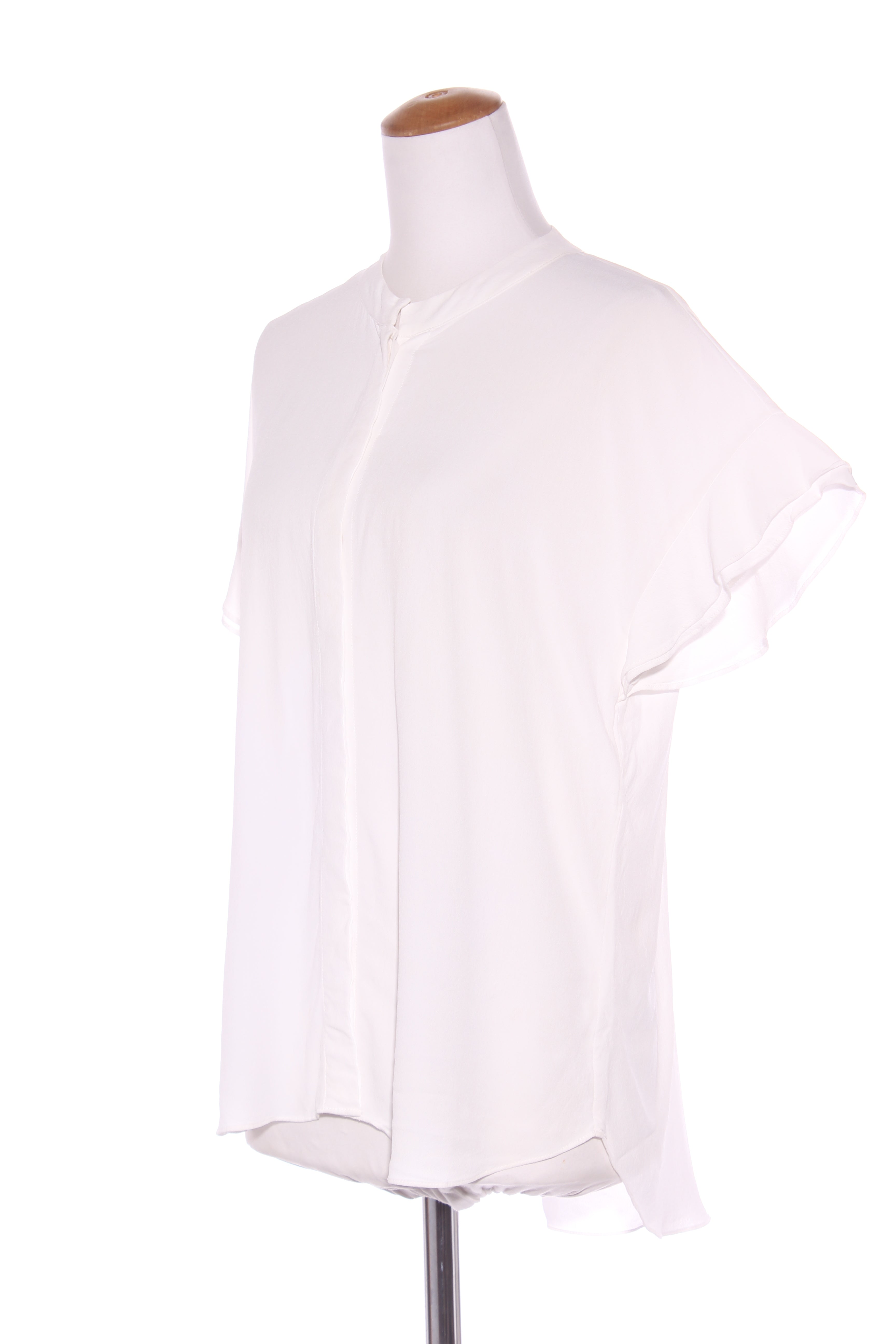 SIZE ON TAG: 14FITS LIKE: N/ACOLOUR: WhiteFABRIC: ViscoseCONDITION: Excellent prelovedMEASUREMENTS:BUST: 56cms WAIST: 58cms LENGTH: 68-76cmsNOTES: Button up front. Tiered sleeve caps. Fabric has some stretch.