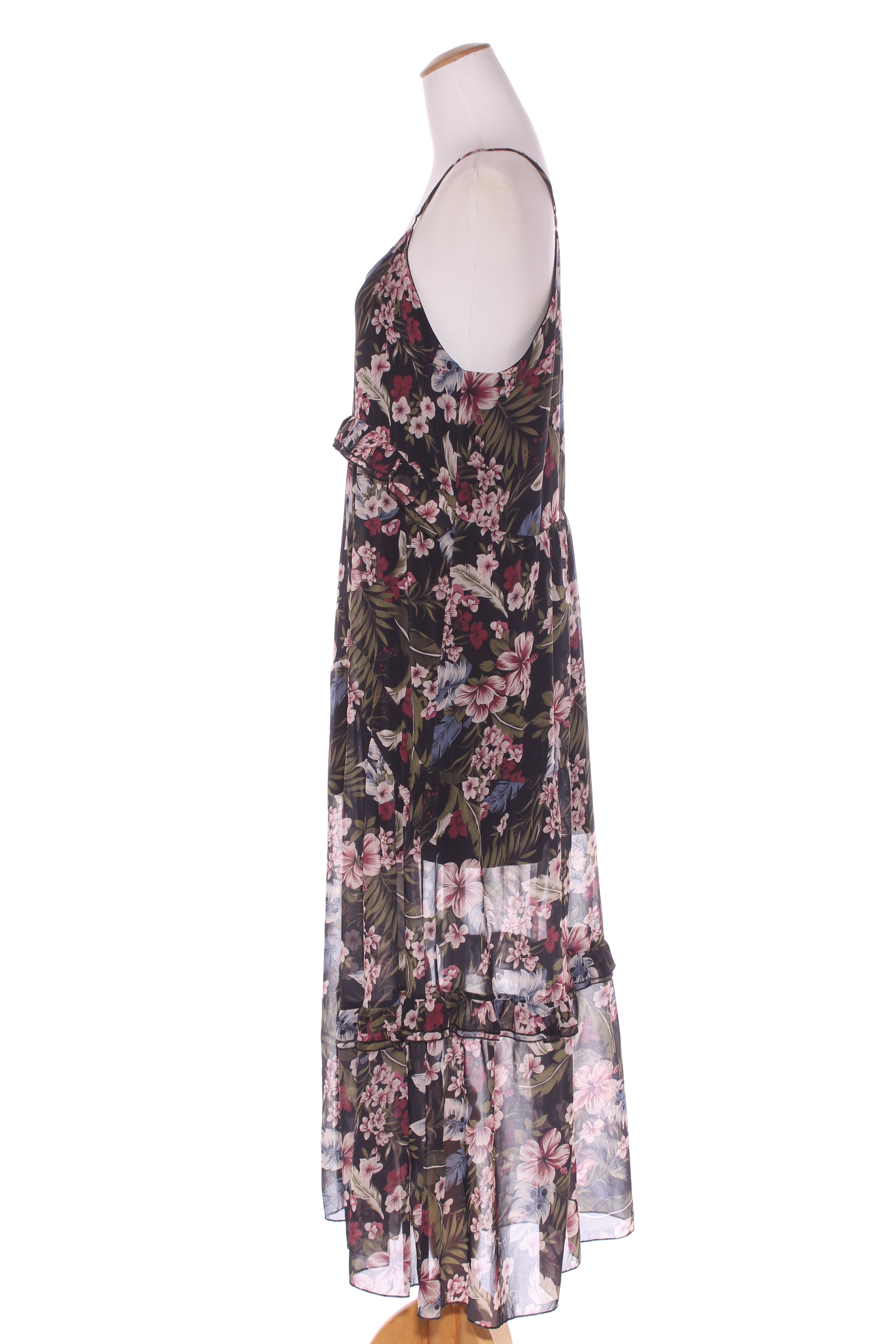 SIZE ON TAG: MFITS LIKE: 12COLOUR: Multi, blackFABRIC: PolyesterCONDITION: Excellent prelovedMEASUREMENTS:BUST: 48cms WAIST: 49cms LENGTH: 143cmsNOTES: "Tropical nights - Life to the maxi". Pull over style. ...