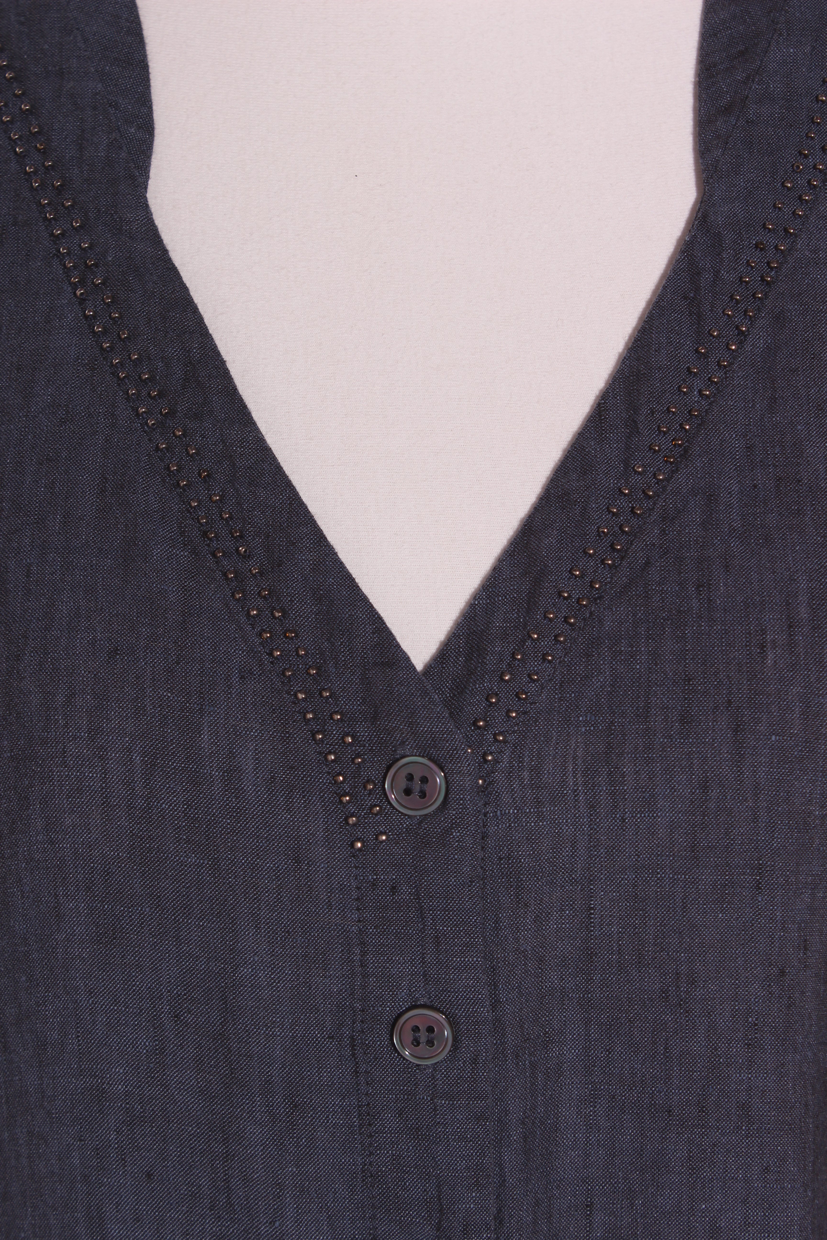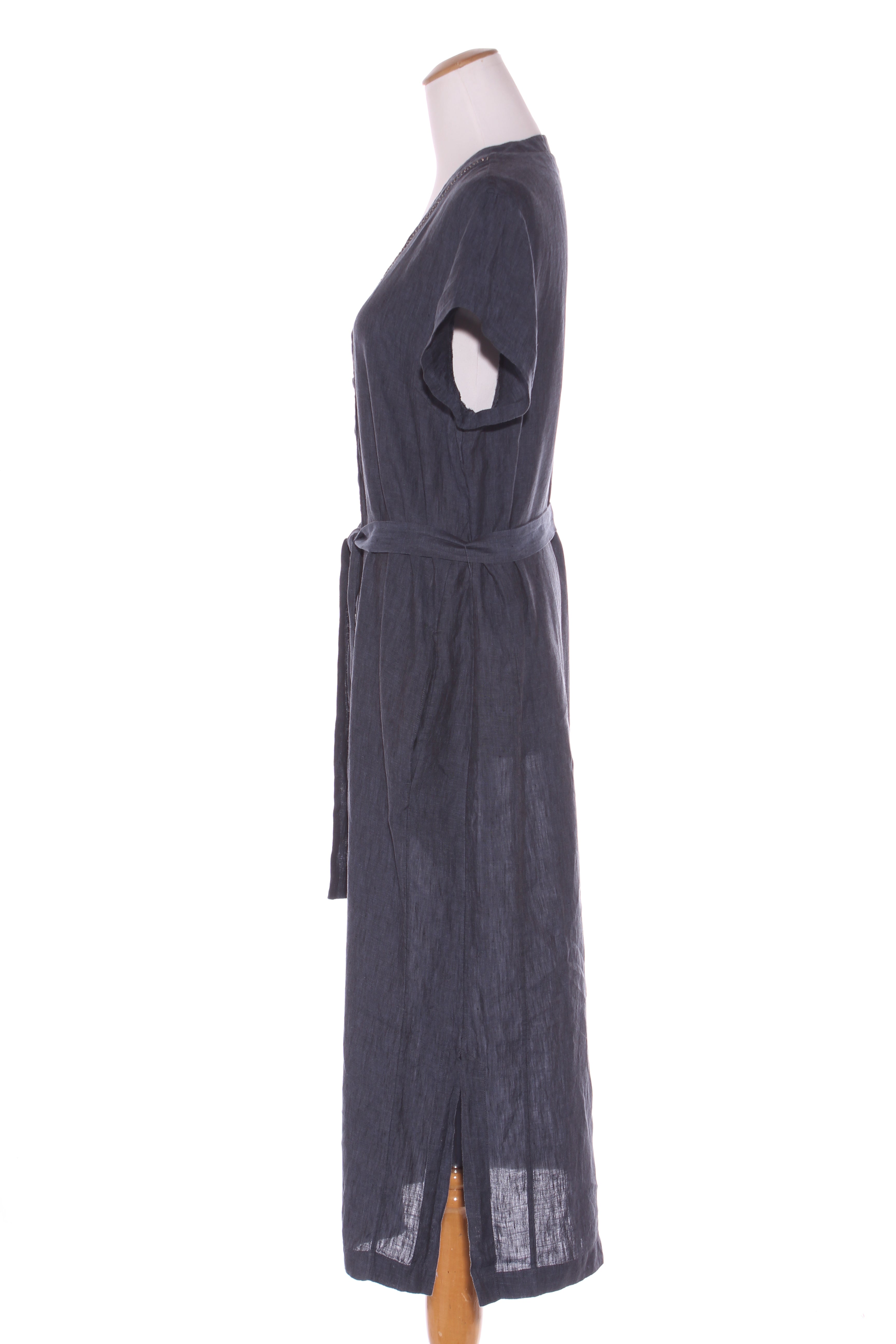 SIZE ON TAG: 16FITS LIKE: N/ACOLOUR: Petrol blueFABRIC: LinenCONDITION: Like new - worn onceMEASUREMENTS:BUST: 55cms WAIST: 56cms LENGTH: 125cmsNOTES: Button up front. Side splits up 27cm...