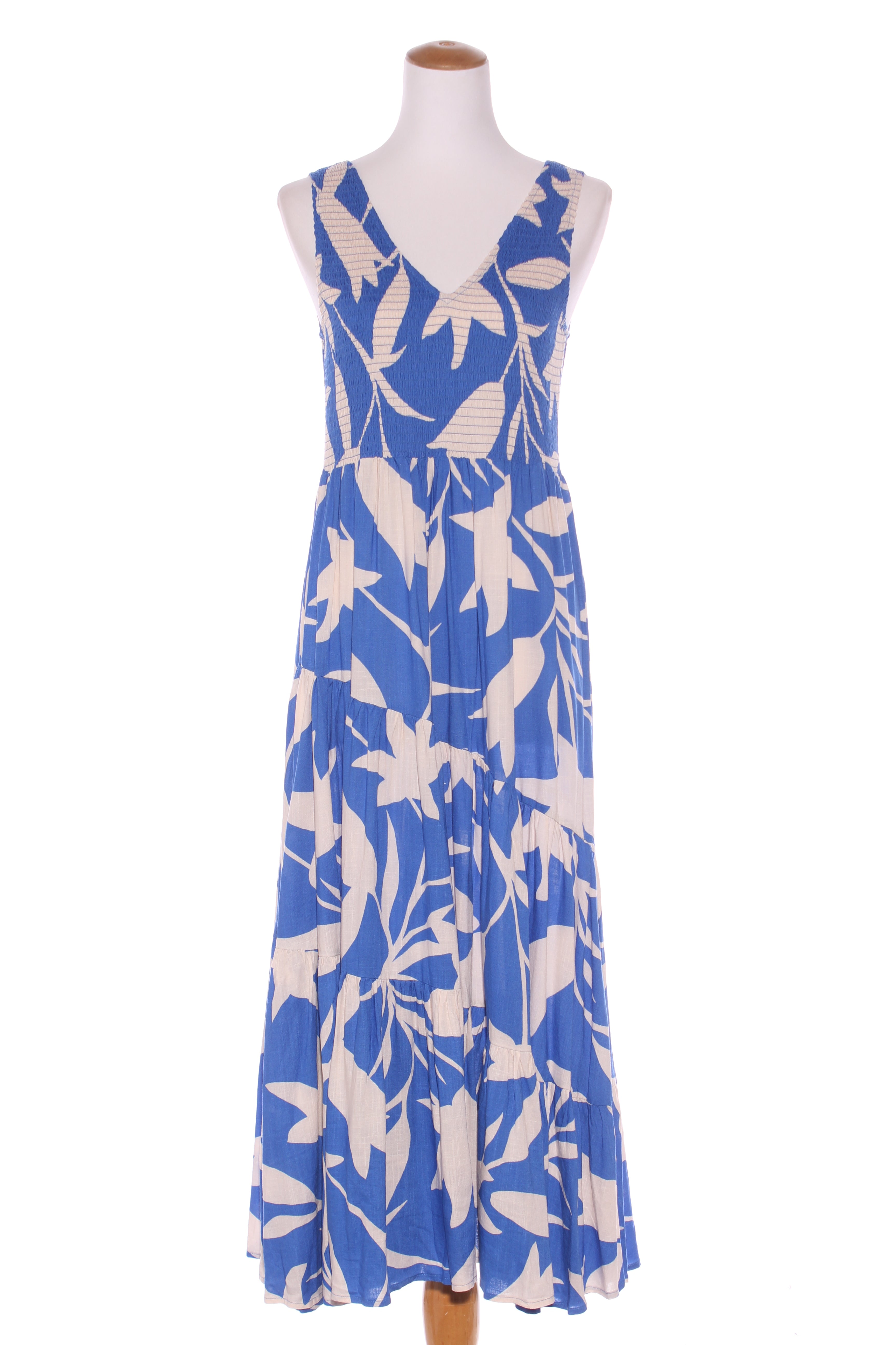 SIZE ON TAG: 10FITS LIKE: 10COLOUR: Blue, off whiteFABRIC: Viscose rayon, linenCONDITION: Excellent preloved - hardly wornMEASUREMENTS:BUST: 41cms WAIST: 39cms LENGTH: 131cmsNOTES: Same print as modelled...