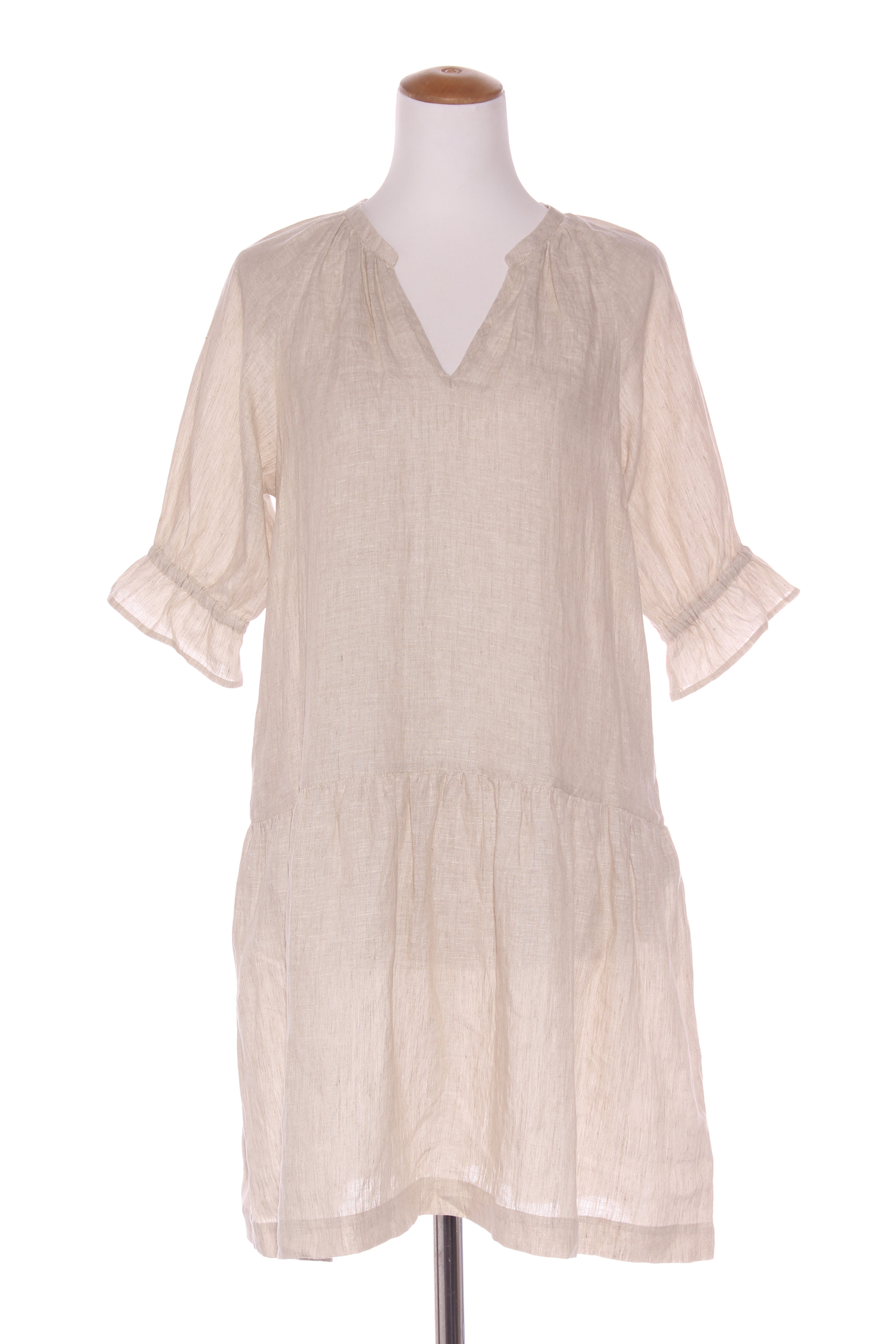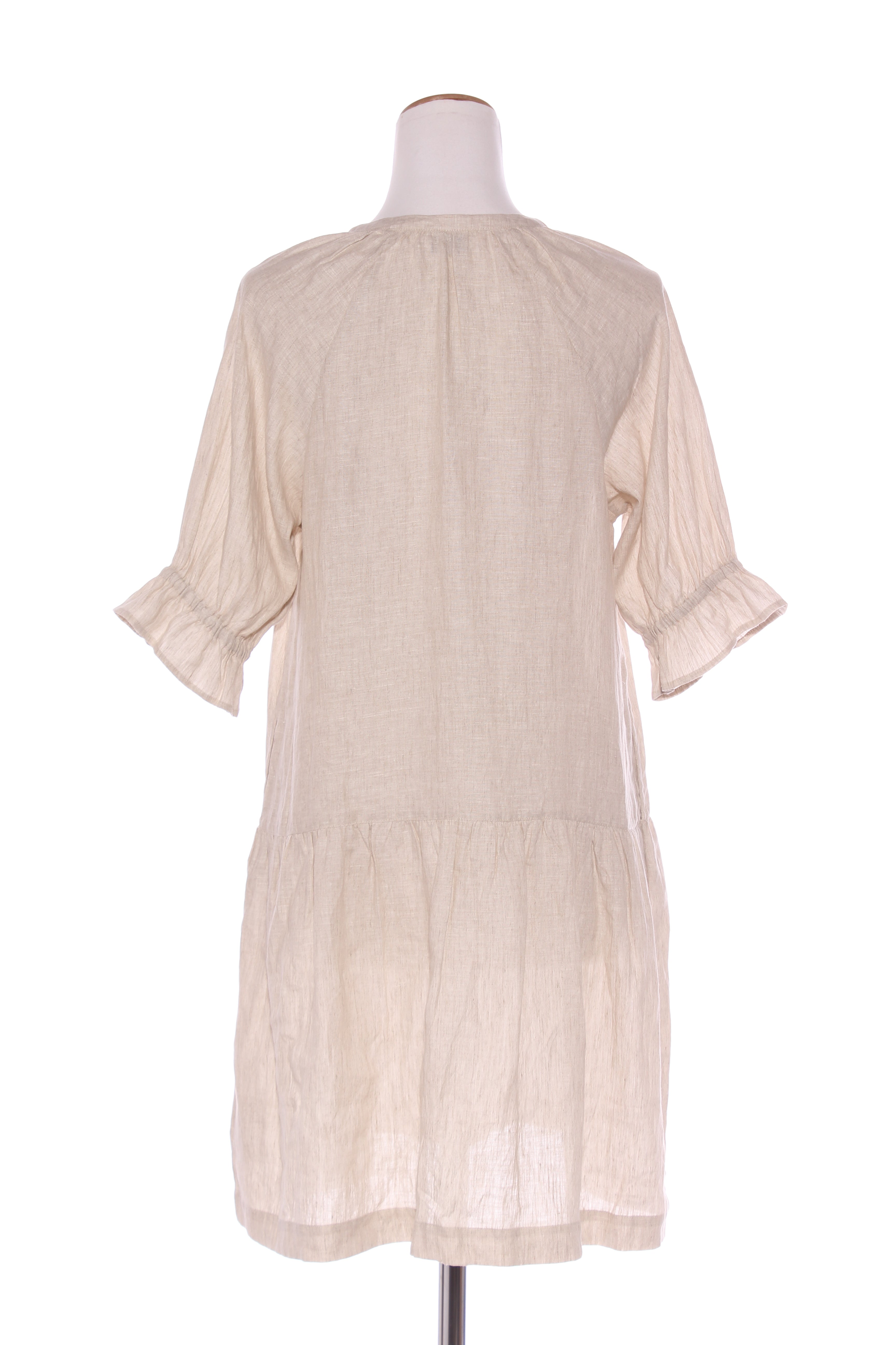 SIZE ON TAG: SFITS LIKE: 10-12COLOUR: OatmealFABRIC: Pure linenCONDITION: Excellent prelovedMEASUREMENTS:BUST: 52cms WAIST: 52cms LENGTH: 94cmsNOTES: Pull over style. Elasticated sleeve ends. Side pockets.