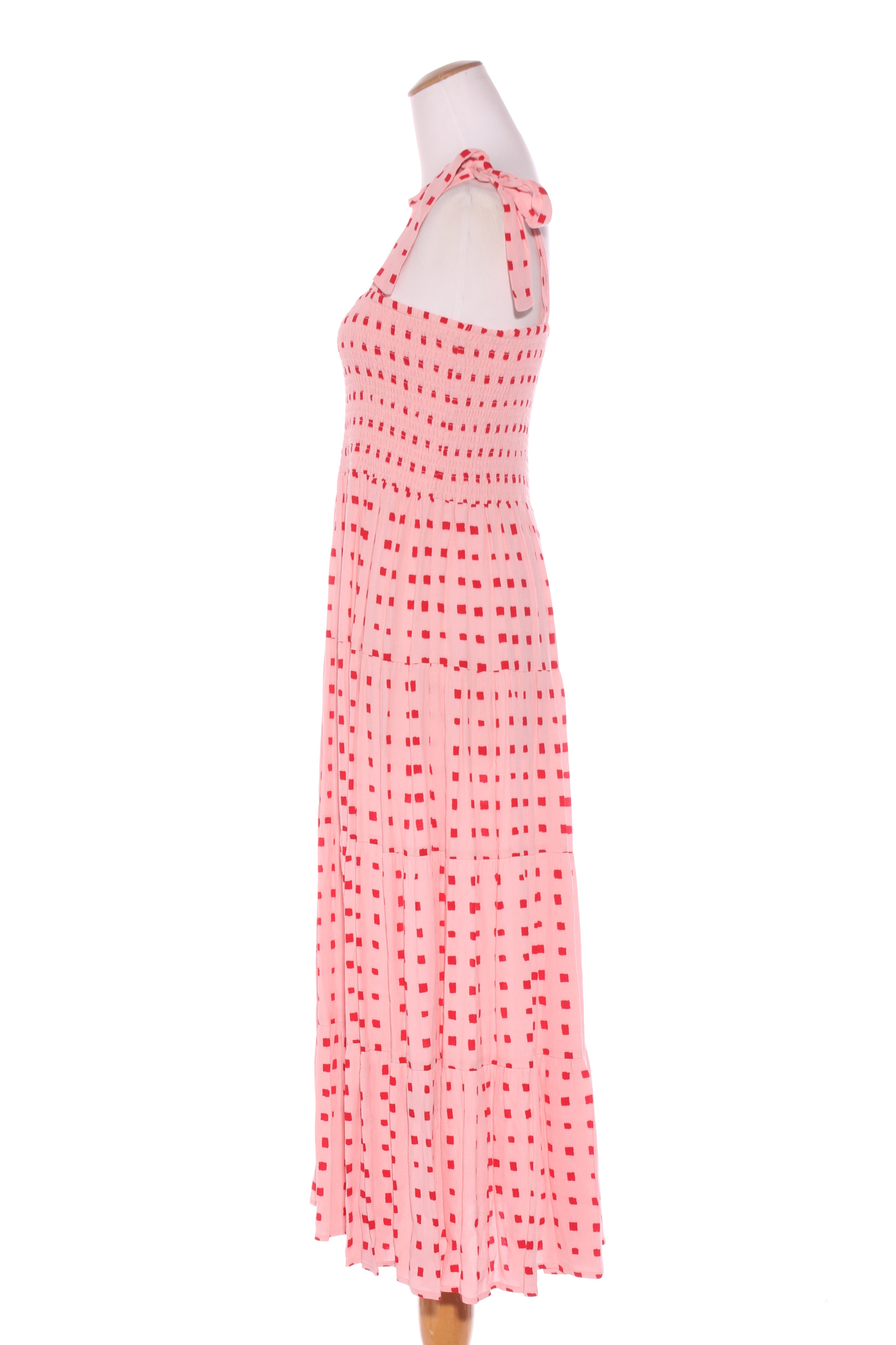 SIZE ON TAG: 12FITS LIKE: N/ACOLOUR: Pink, redFABRIC: ViscoseCONDITION: Excellent prelovedMEASUREMENTS:BUST: 35cms WAIST: 38cms LENGTH: 129cmsNOTES: Pull over style. Elasticated bodice. Adjustable shoulder straps tie in...