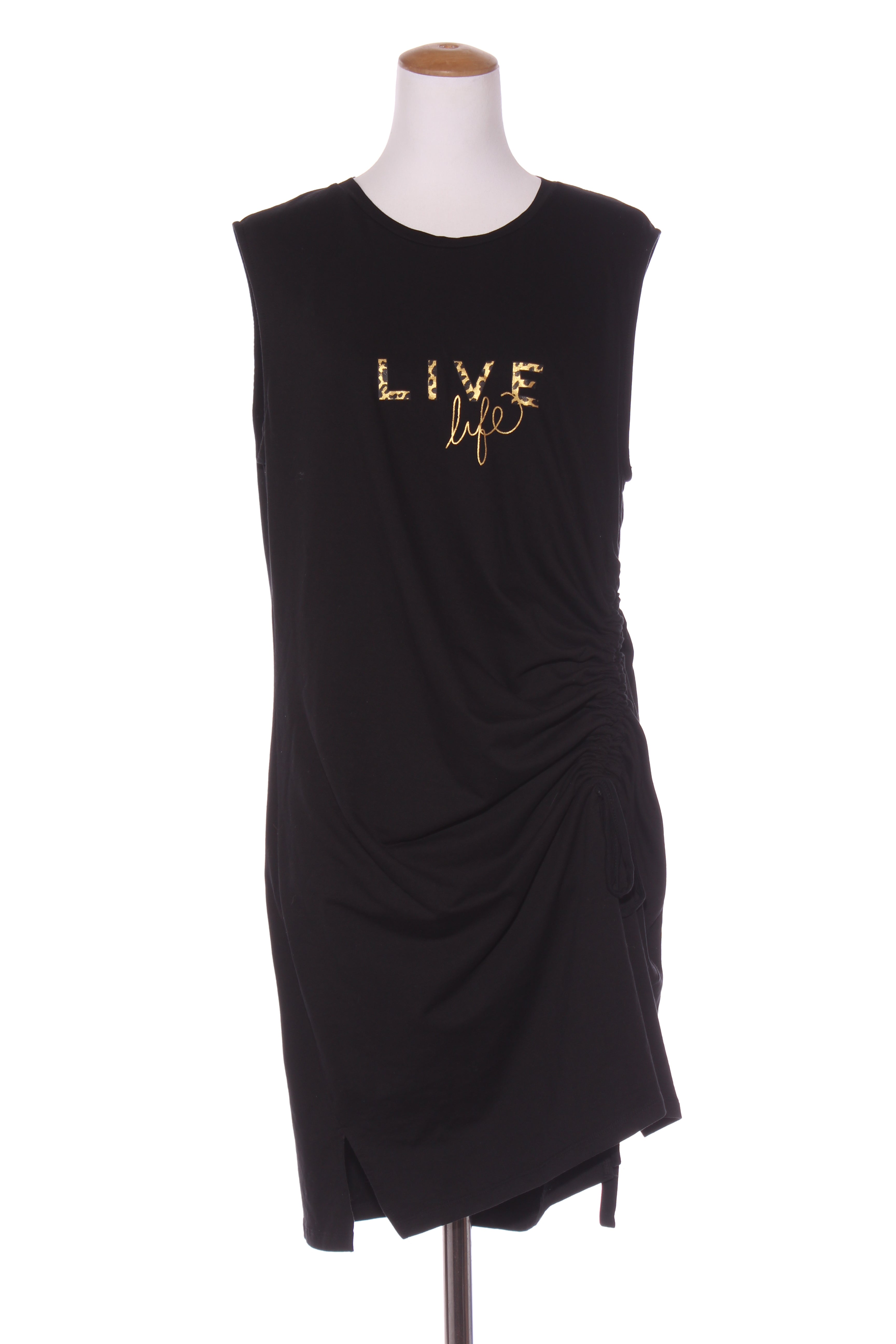 SIZE ON TAG: 14FITS LIKE: N/ACOLOUR: Black, goldFABRIC: Cotton CONDITION: Excellent preloved - hardly wornMEASUREMENTS:BUST: 55cms WAIST: 55cms LENGTH: 108cmsNOTES: Wide strap crew neck casual dress. Dual...