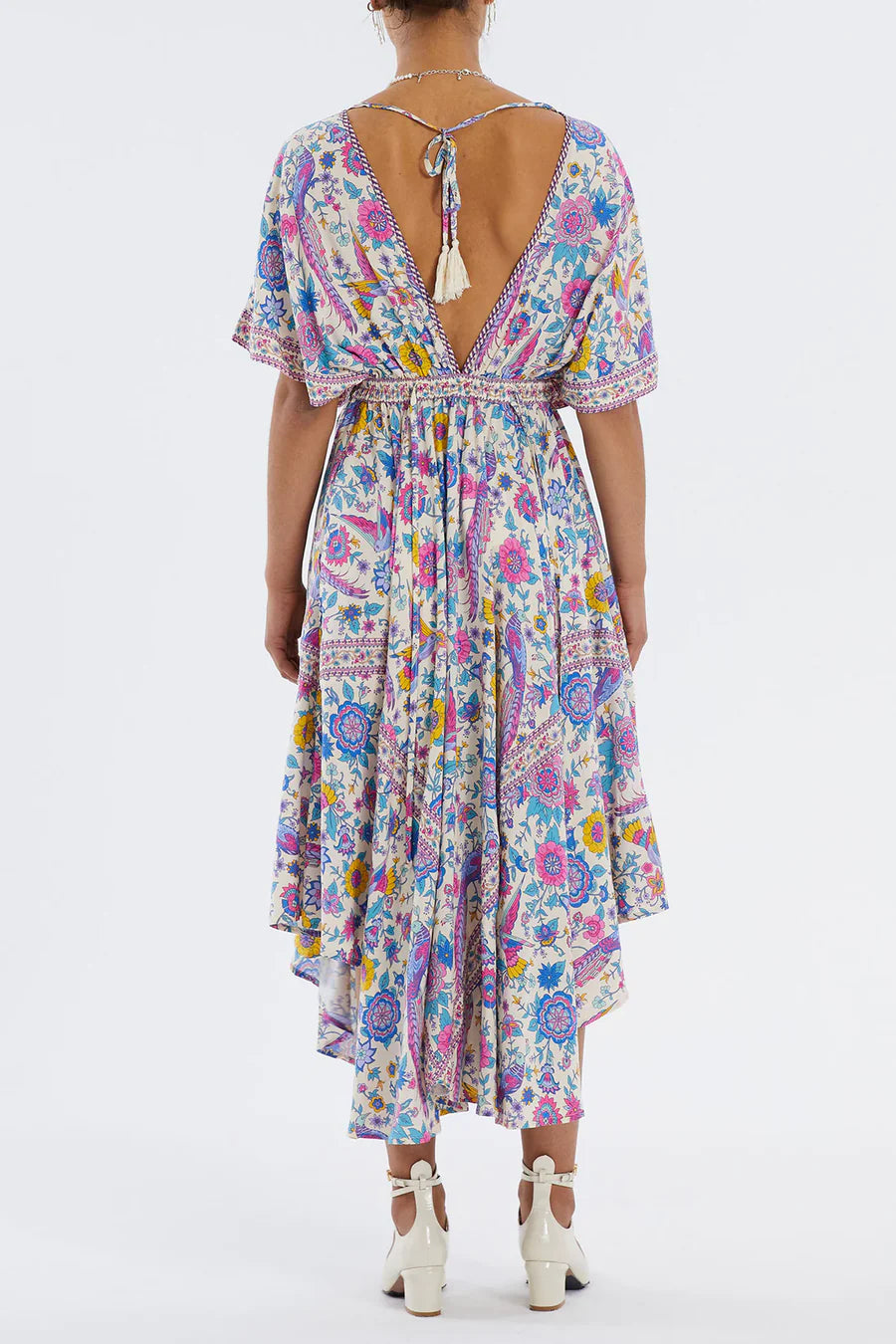 SIZE ON TAG: SFITS LIKE: 10-12COLOUR: MultiFABRIC: ViscoseCONDITION: Like newMEASUREMENTS:BUST: Free WAIST: 34cms LENGTH: 114-142cmsNOTES: The Nightingale Dress from Lollys Laundry features a v-neckline at the...