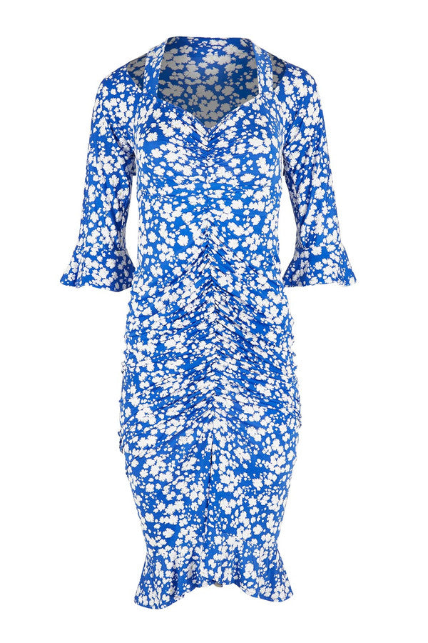 SIZE ON TAG: 10FITS LIKE: COLOUR: Blue, white, yellowFABRIC: Polyester, spandexCONDITION: Brand new with tagsMEASUREMENTS:BUST: 39cms WAIST: 35cms LENGTH: 105-123cmsNOTES: The Somerland Ruched Dress by Sacha Drake...