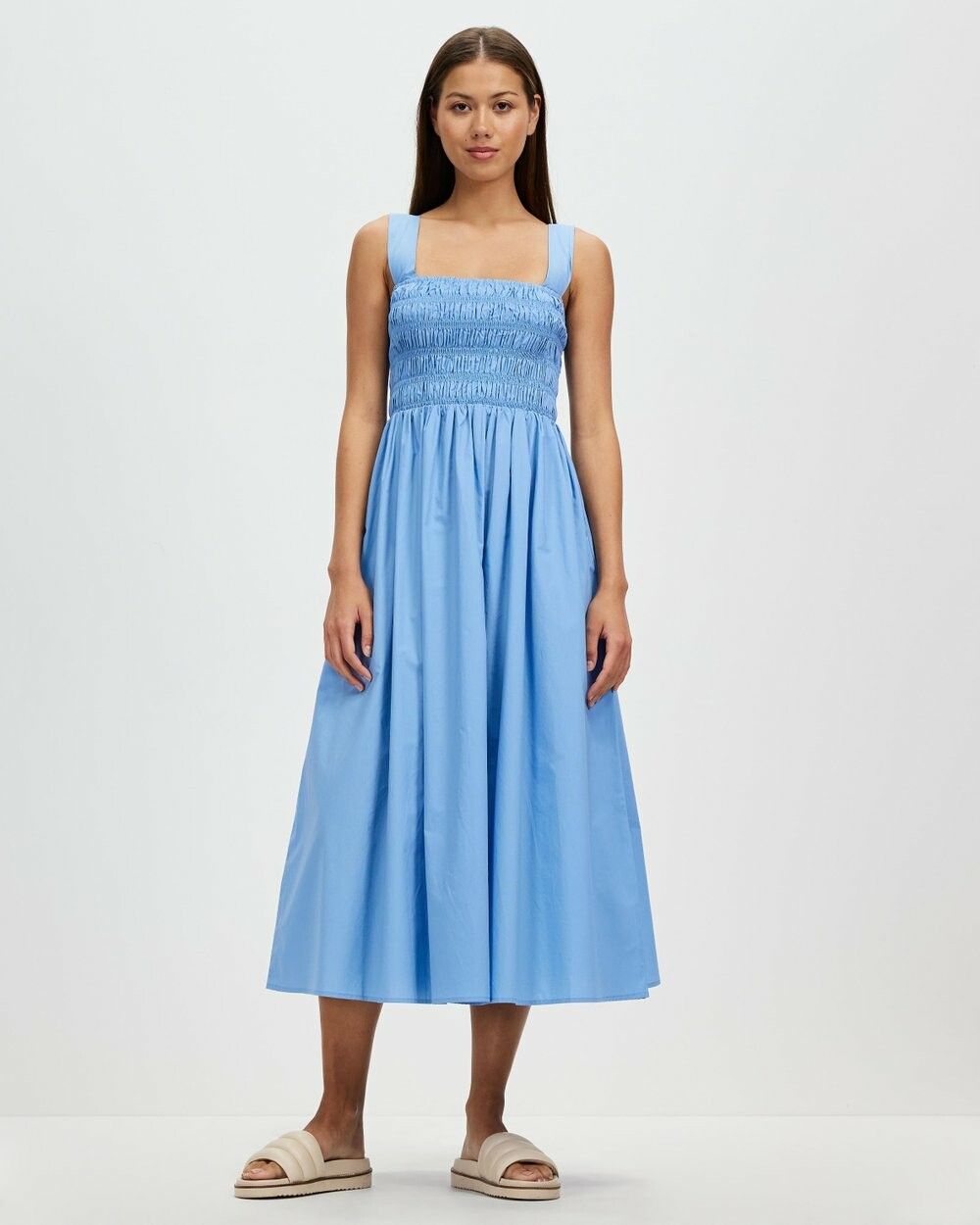 SIZE ON TAG: 10FITS LIKE: N/ACOLOUR: BlueFABRIC: CottonCONDITION: Excellent prelovedMEASUREMENTS:BUST: 34cms WAIST: 34cms LENGTH: 127cmsNOTES: Pull over style. Elasticated shirred bodice. Side pockets.