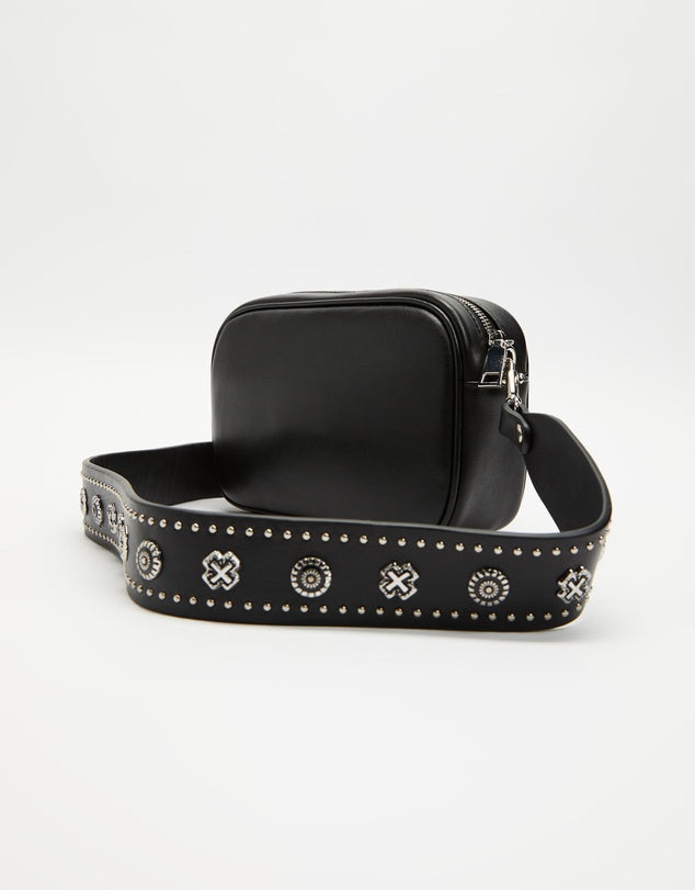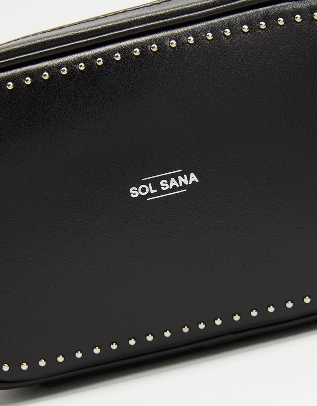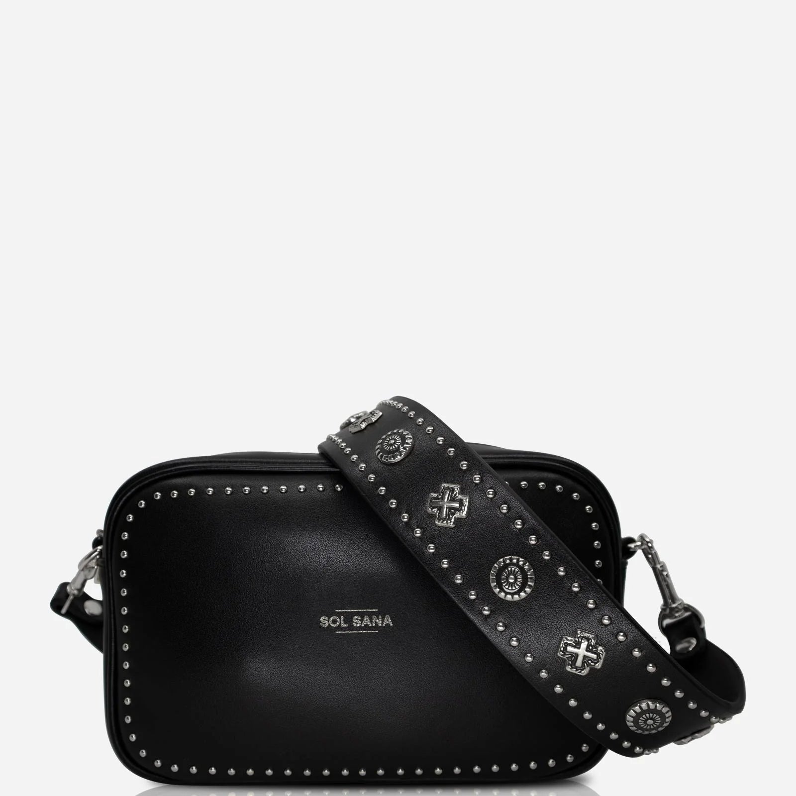 COLOUR: Black, silverFABRIC: Leather, cotton liningCONDITION: Very good prelovedMEASUREMENTS:HEIGHT: 13cms WIDTH: 21cms DEPTH: 6.5cms STRAP: 109cms NOTES: Classic Camera Bag by Sol Sana that a girl can't live without,...