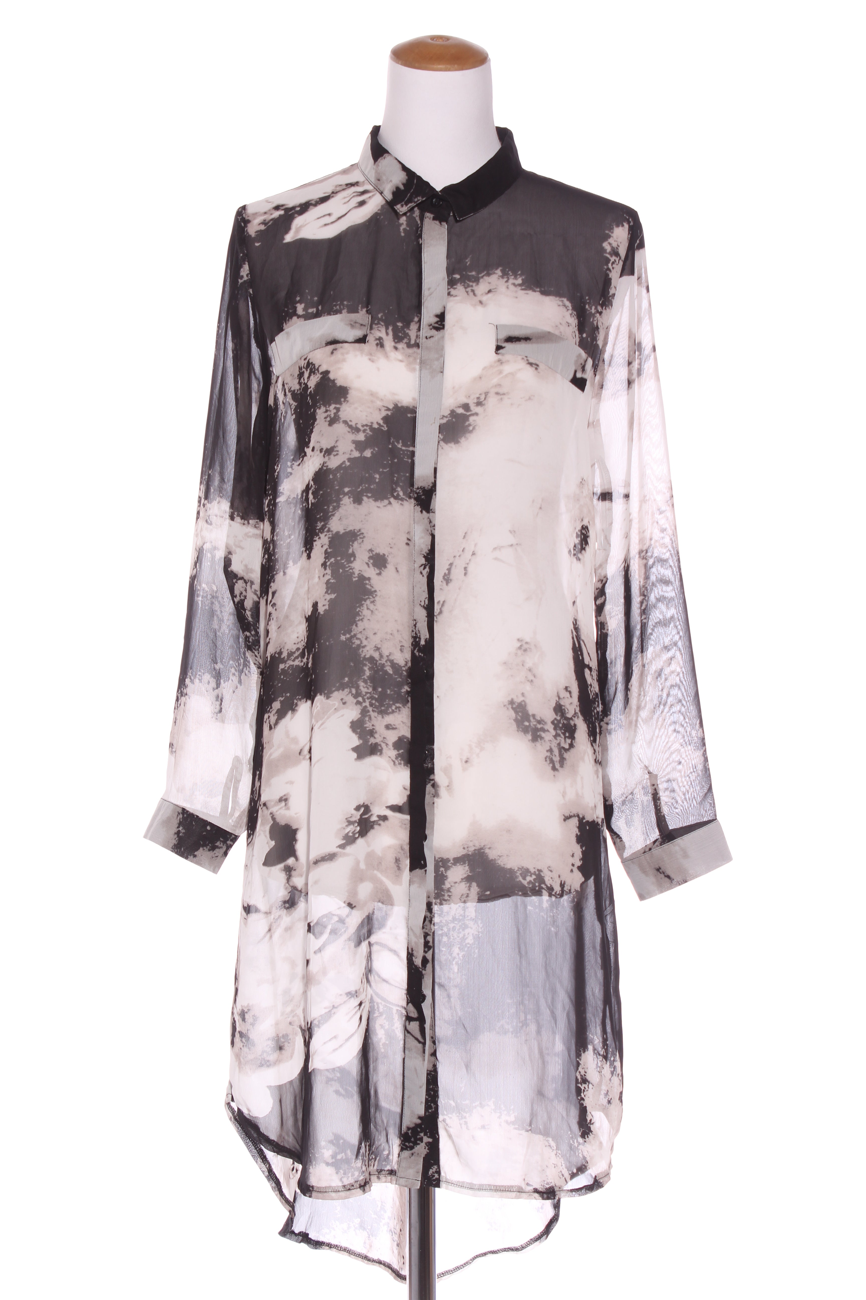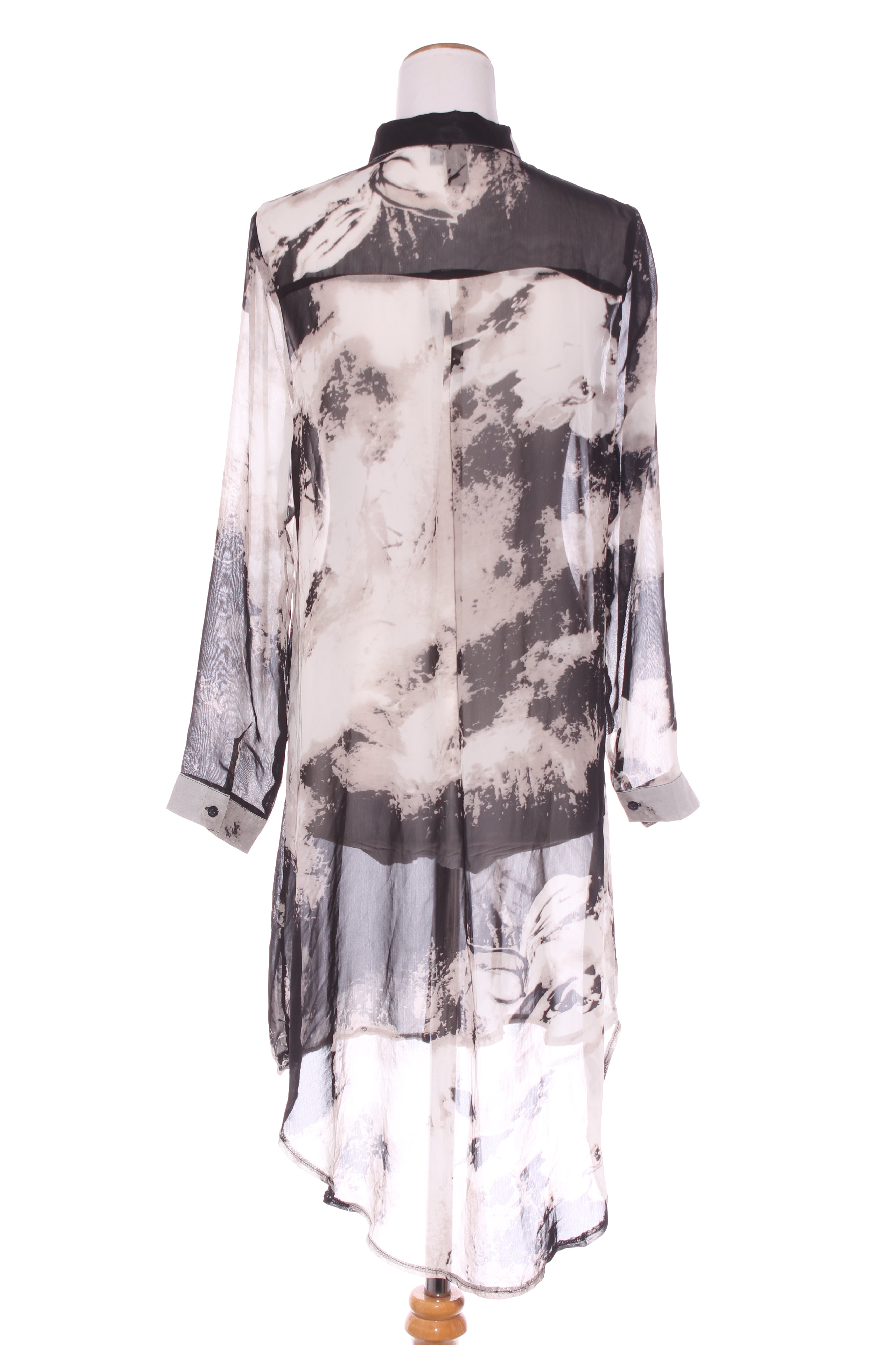 SIZE ON TAG: 12FITS LIKE: N/ACOLOUR: White, black, greyFABRIC: Tag removed, polyesterCONDITION: Very good prelovedMEASUREMENTS:BUST: 53cms WAIST: 55cms LENGTH: 96-115cmsNOTES: Button up front and sleeve ends. ...