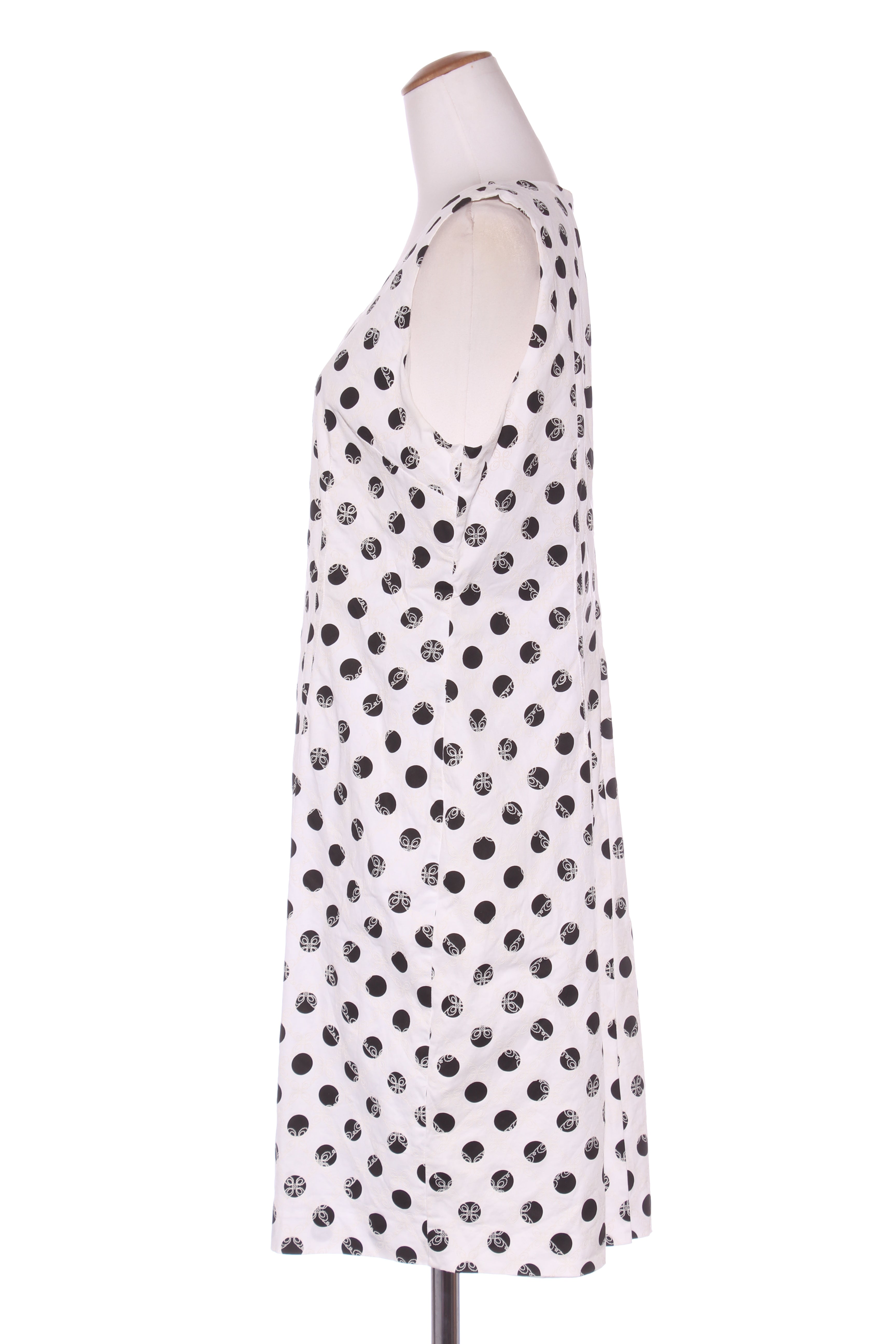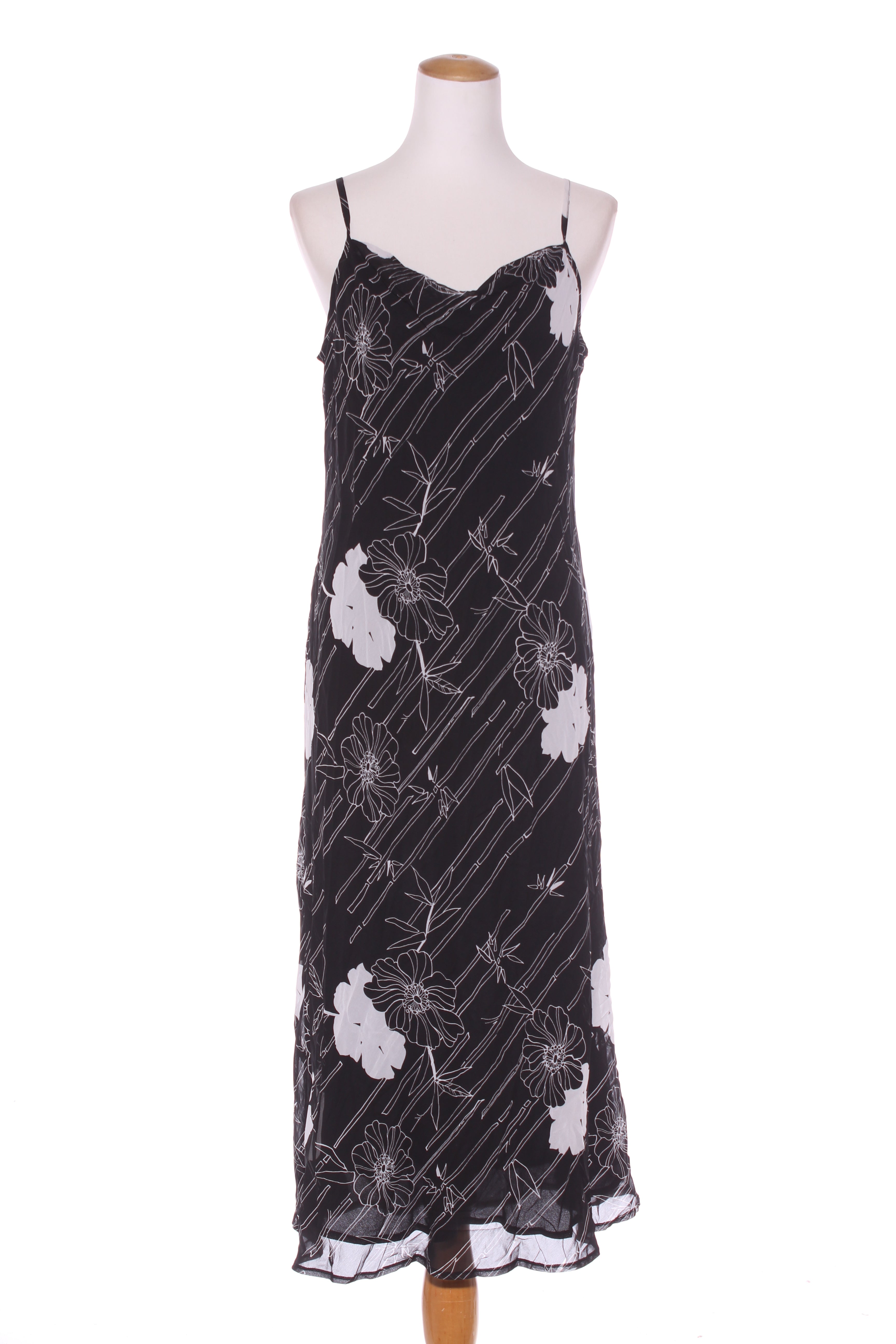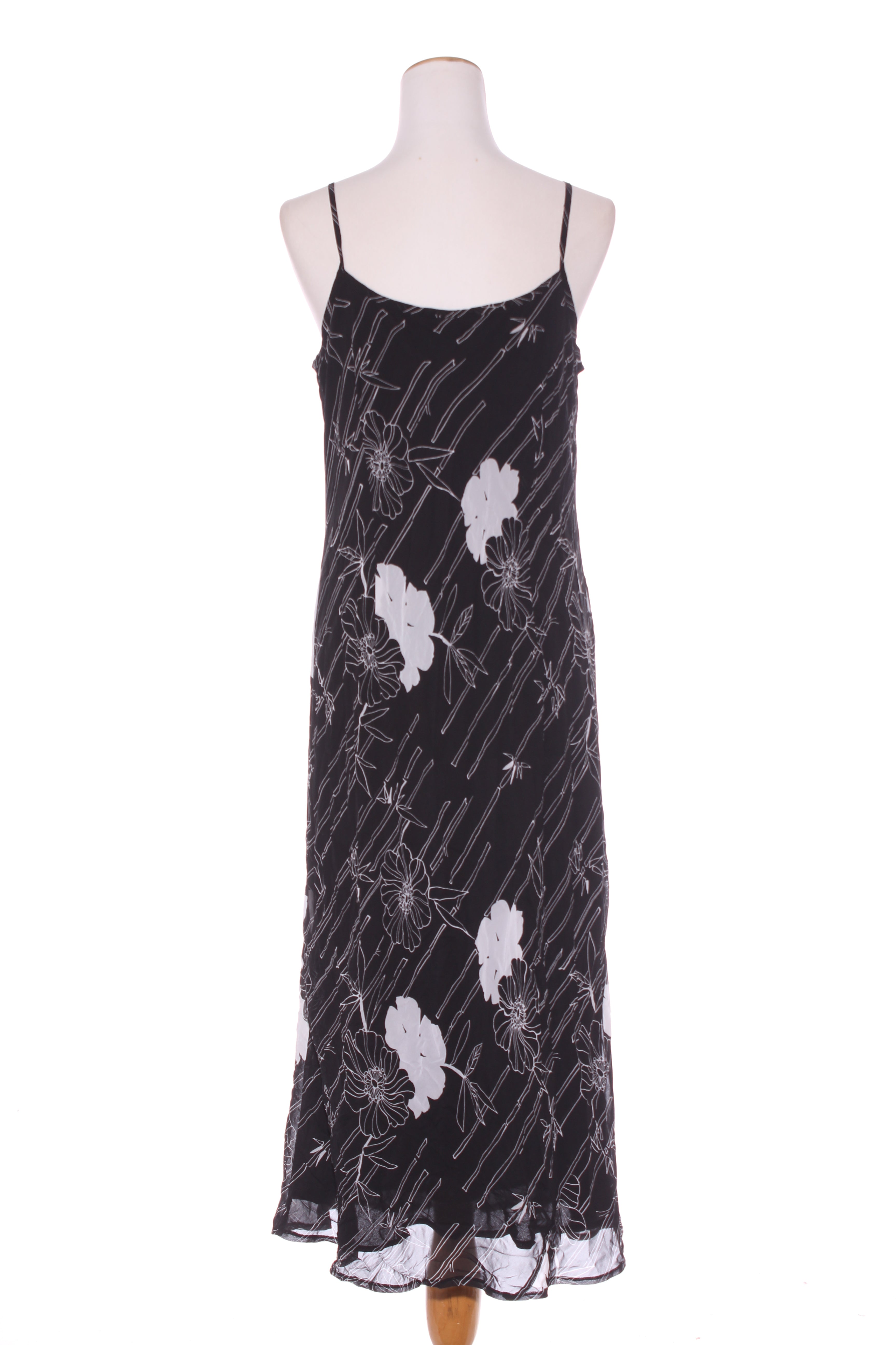 SIZE ON TAG: Not statedFITS LIKE: 14COLOUR: Black, whiteFABRIC: Tag removed, polyesterCONDITION: Excellent prelovedMEASUREMENTS:BUST: 58cms WAIST: 55cms LENGTH: 125cmsNOTES: Pull over style.