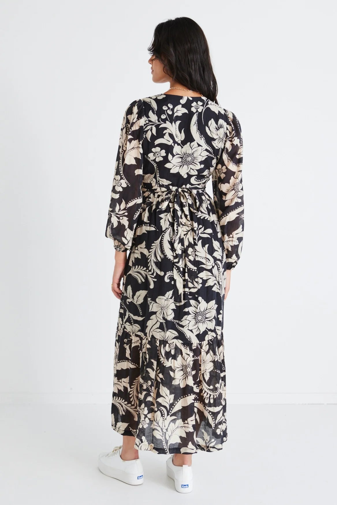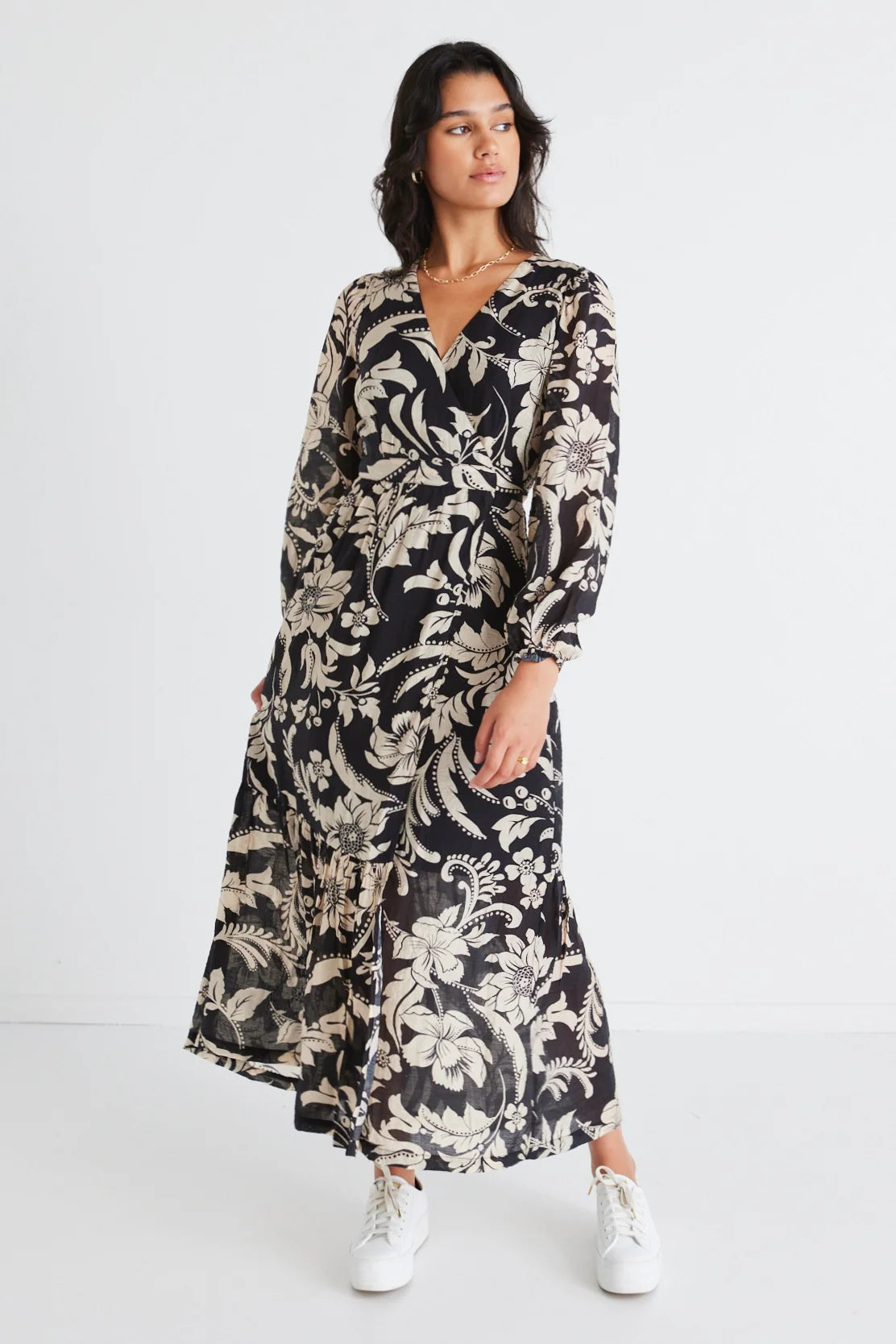 SIZE ON TAG: 12FITS LIKE: N/ACOLOUR: Black, beigeFABRIC: 70% viscose, 30% nylonCONDITION: Excellent prelovedMEASUREMENTS:BUST: 50cms WAIST: Free LENGTH: 133cmsNOTES: The Ocean Wrap Midi Dress from Among...