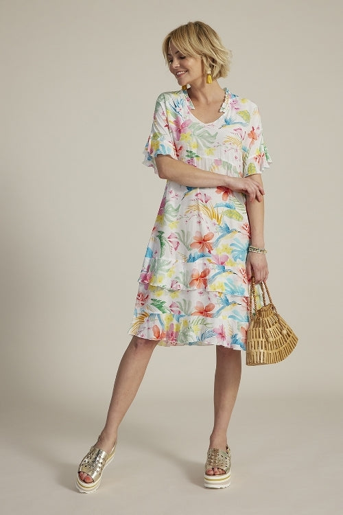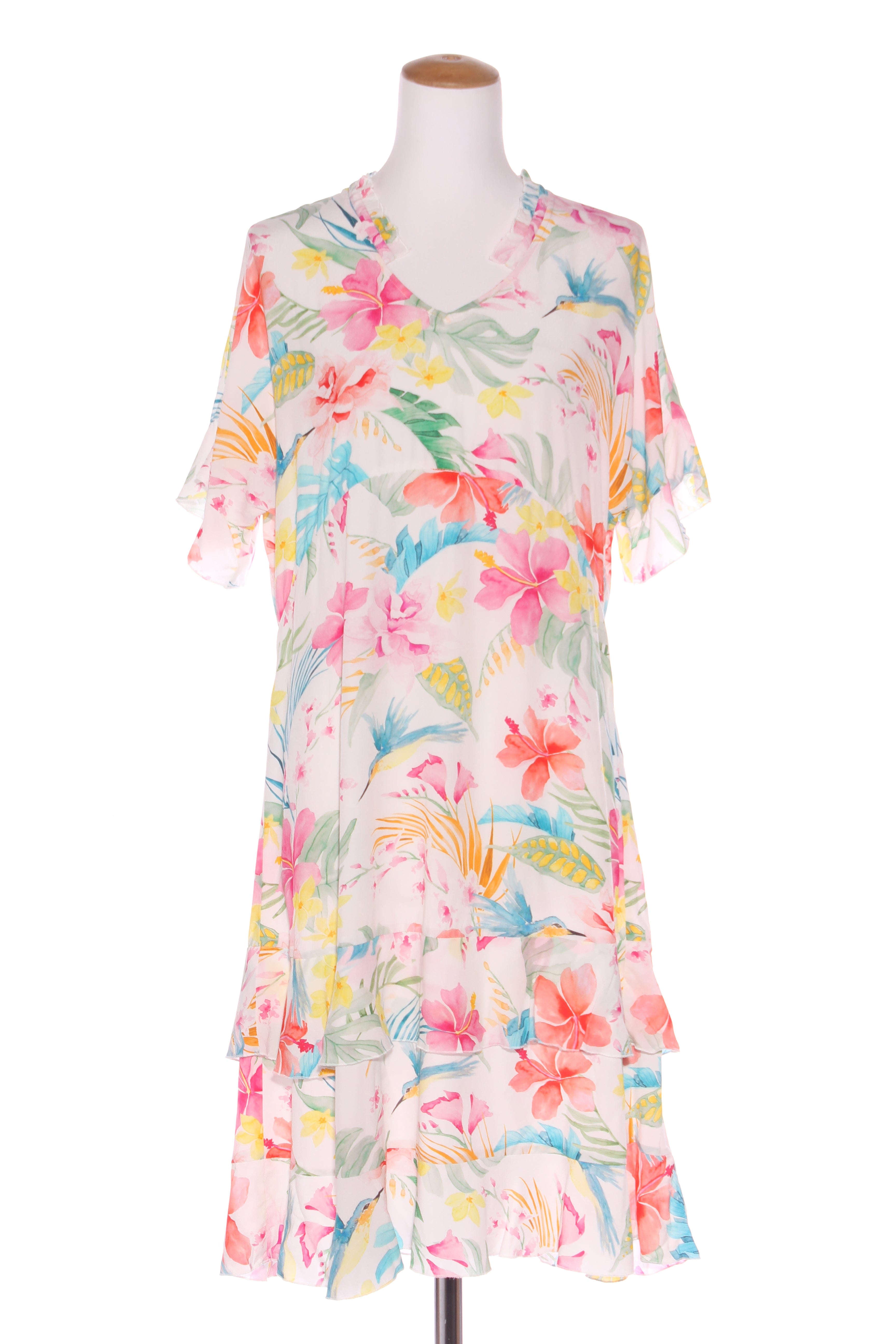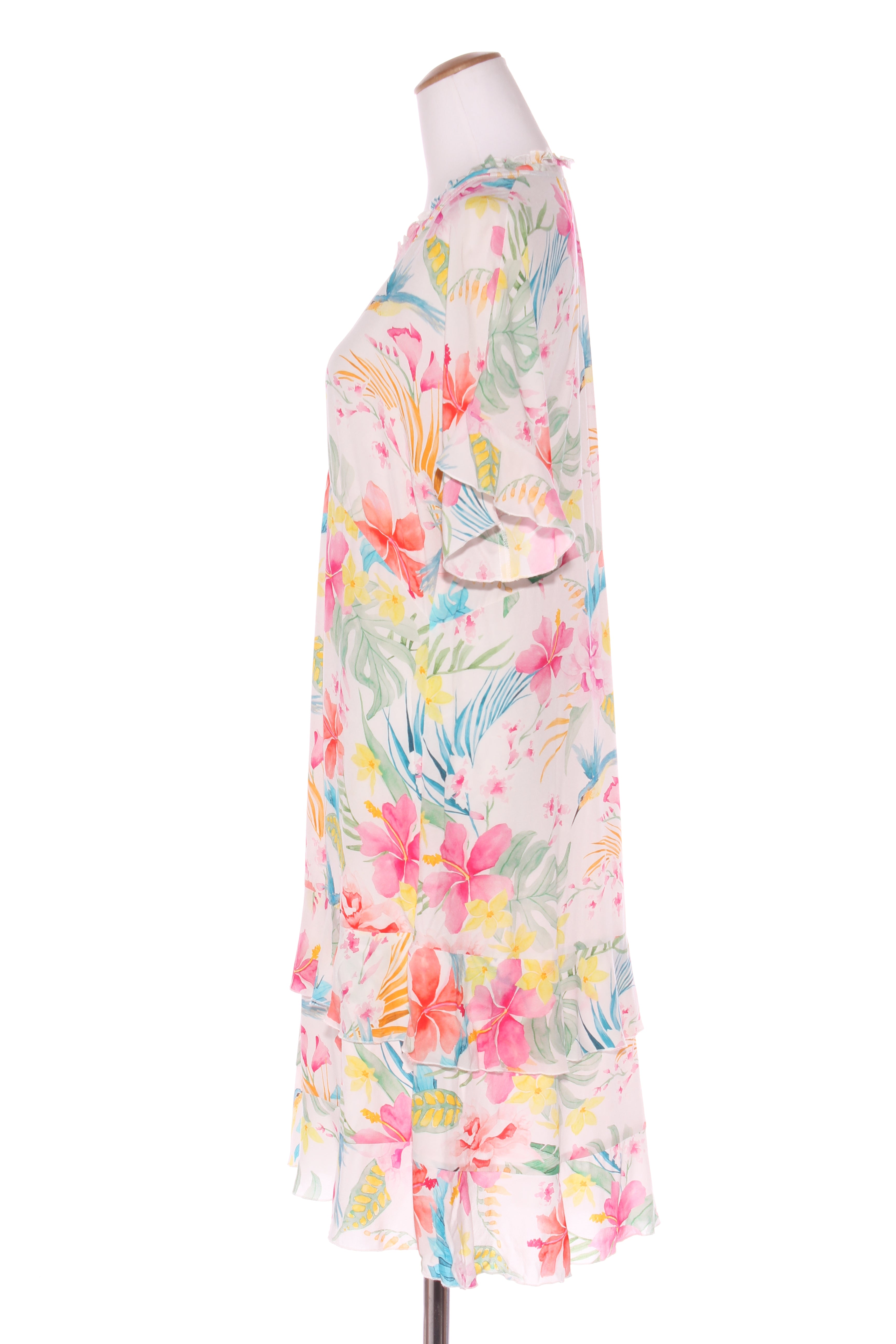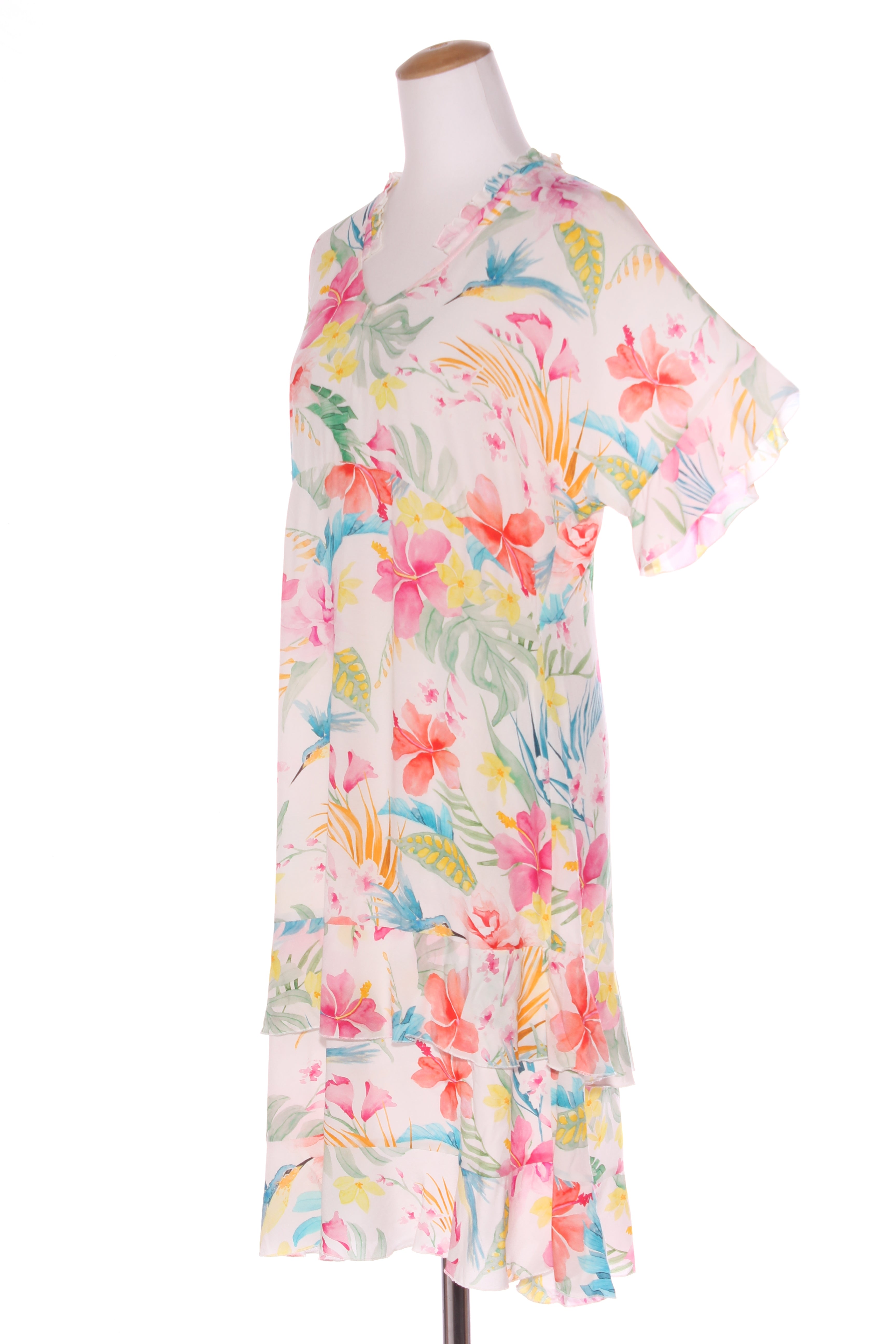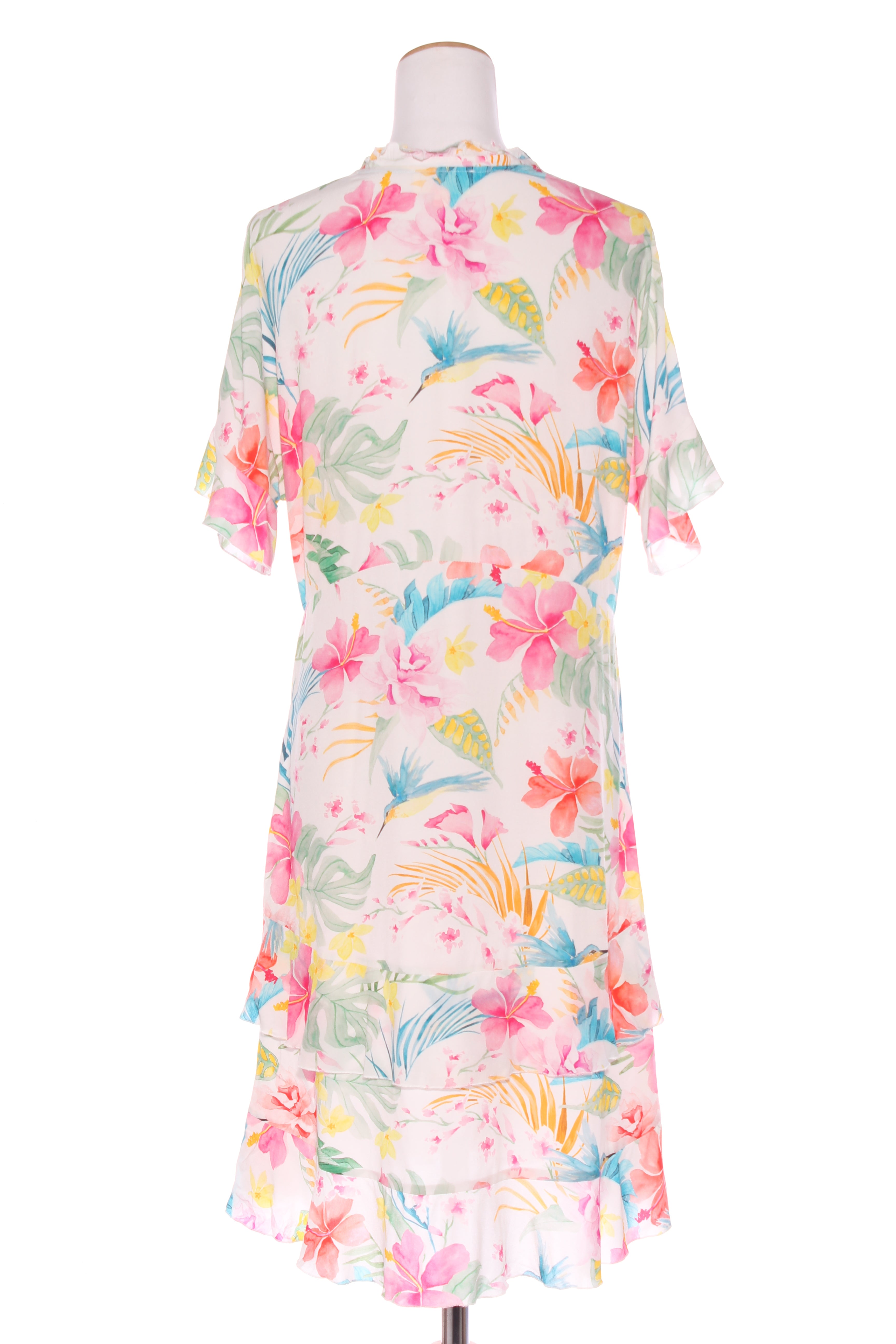 SIZE ON TAG: 10FITS LIKE: N/ACOLOUR: Multi, whiteFABRIC: 70% rayon, 30% viscoseCONDITION: Excellent prelovedMEASUREMENTS:BUST: 53cms WAIST: 49cms LENGTH: 103cmsNOTES: Pull over style. Tiered ruffle hemline. Ruffle...
