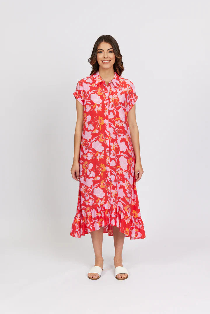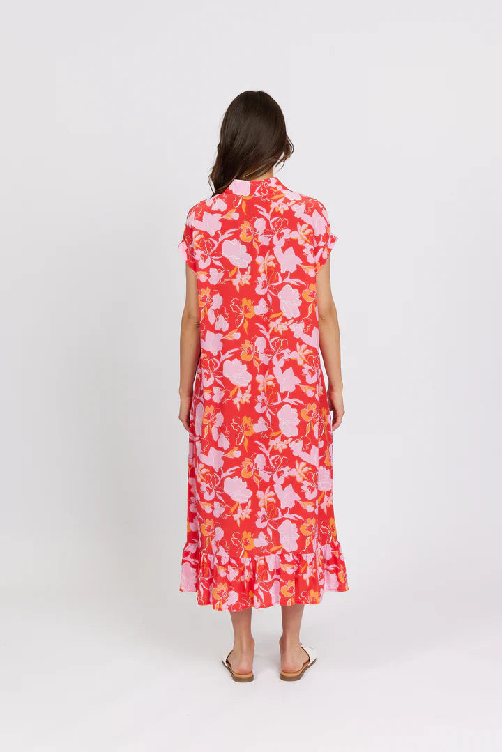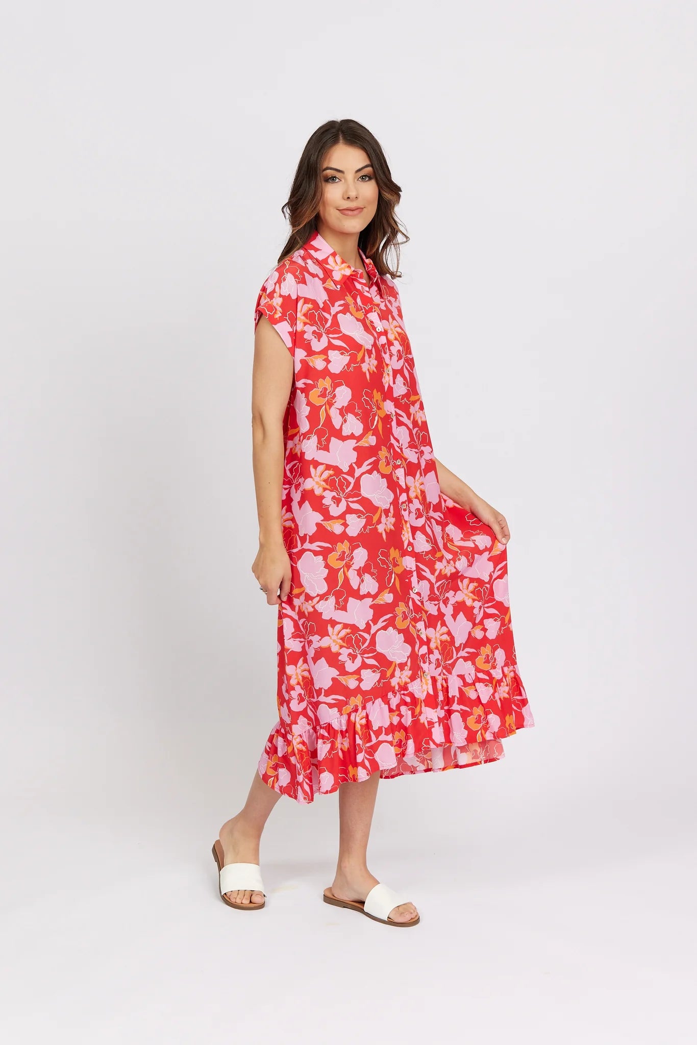 SIZE ON TAG: 16FITS LIKE: N/ACOLOUR: Pink, red, multiFABRIC: 61% rayon, 39% viscoseCONDITION: Like newMEASUREMENTS:BUST: 64cms WAIST: 65cms LENGTH: 112-123cmsNOTES: • Made from a lightweight rayon/viscose fabric...