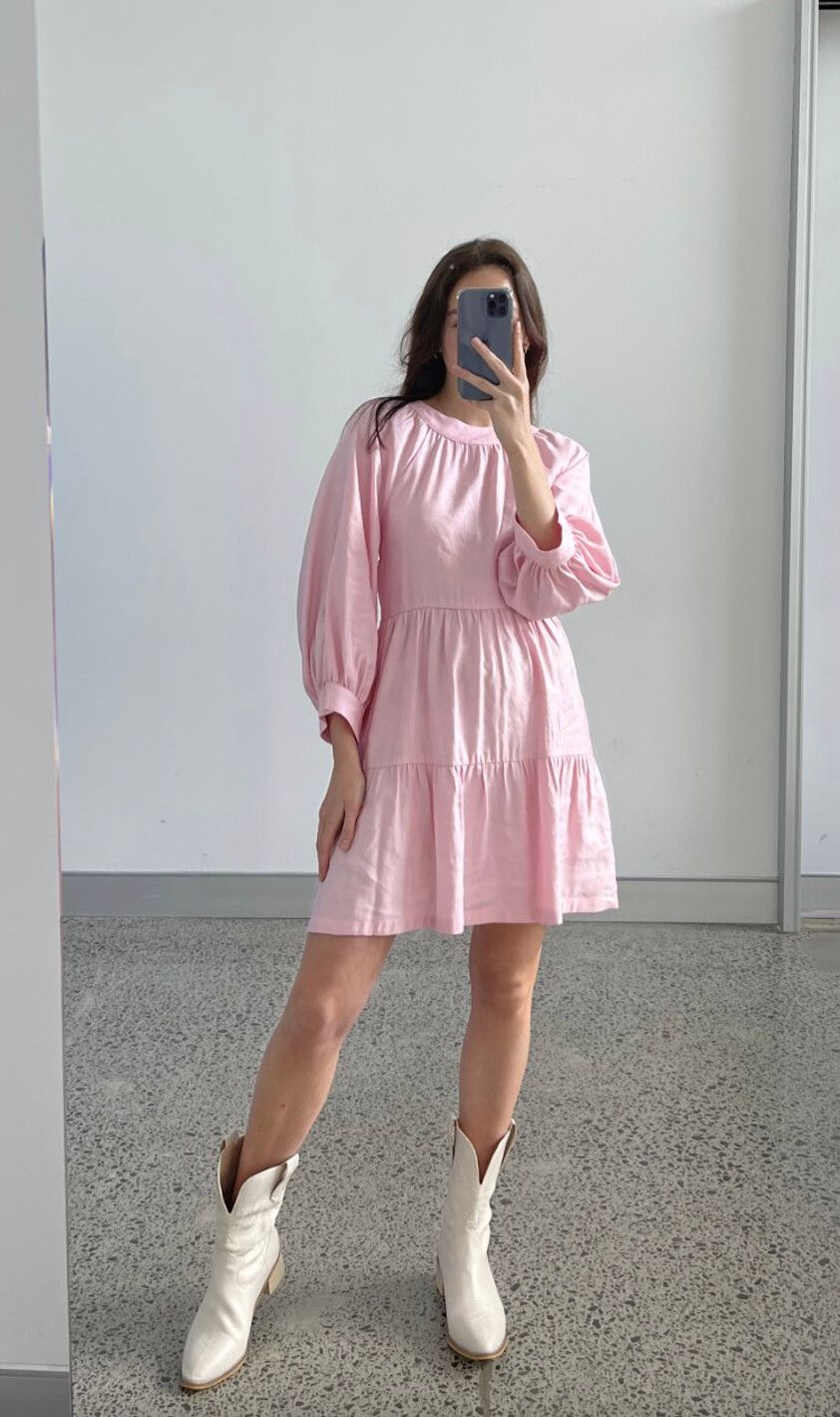 SIZE ON TAG: 12FITS LIKE: N/ACOLOUR: Blush pinkFABRIC: 55% linen, 45% viscoseCONDITION: Excellent prelovedMEASUREMENTS:BUST: 47cms WAIST: 44cms LENGTH: 88cms NOTES: Made in NZ. Tiered linen mini dress...