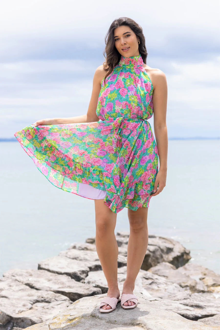 NOTES: A green floral print halter neck mini dress with a high neck, and wavy frilly hemline.