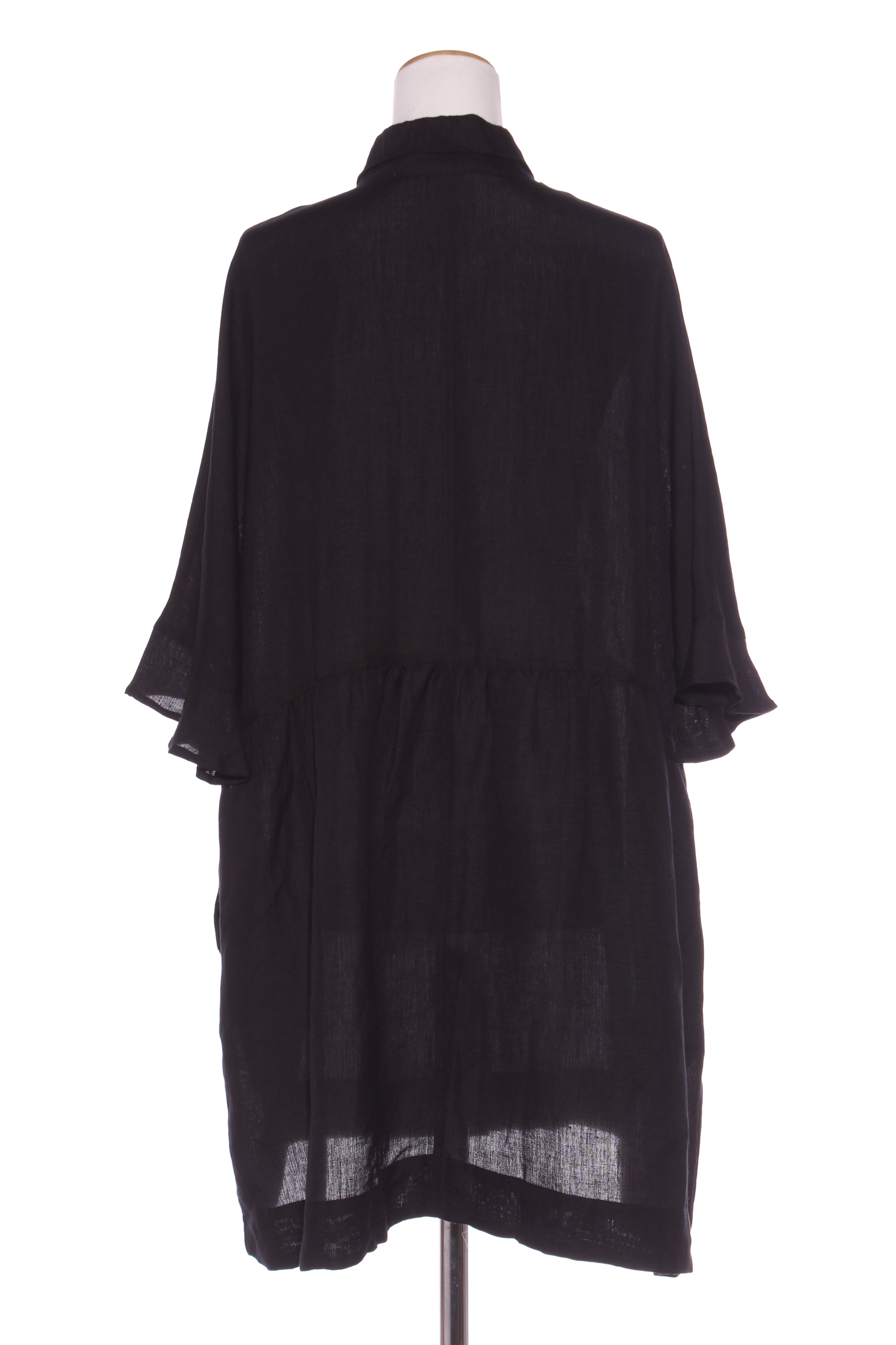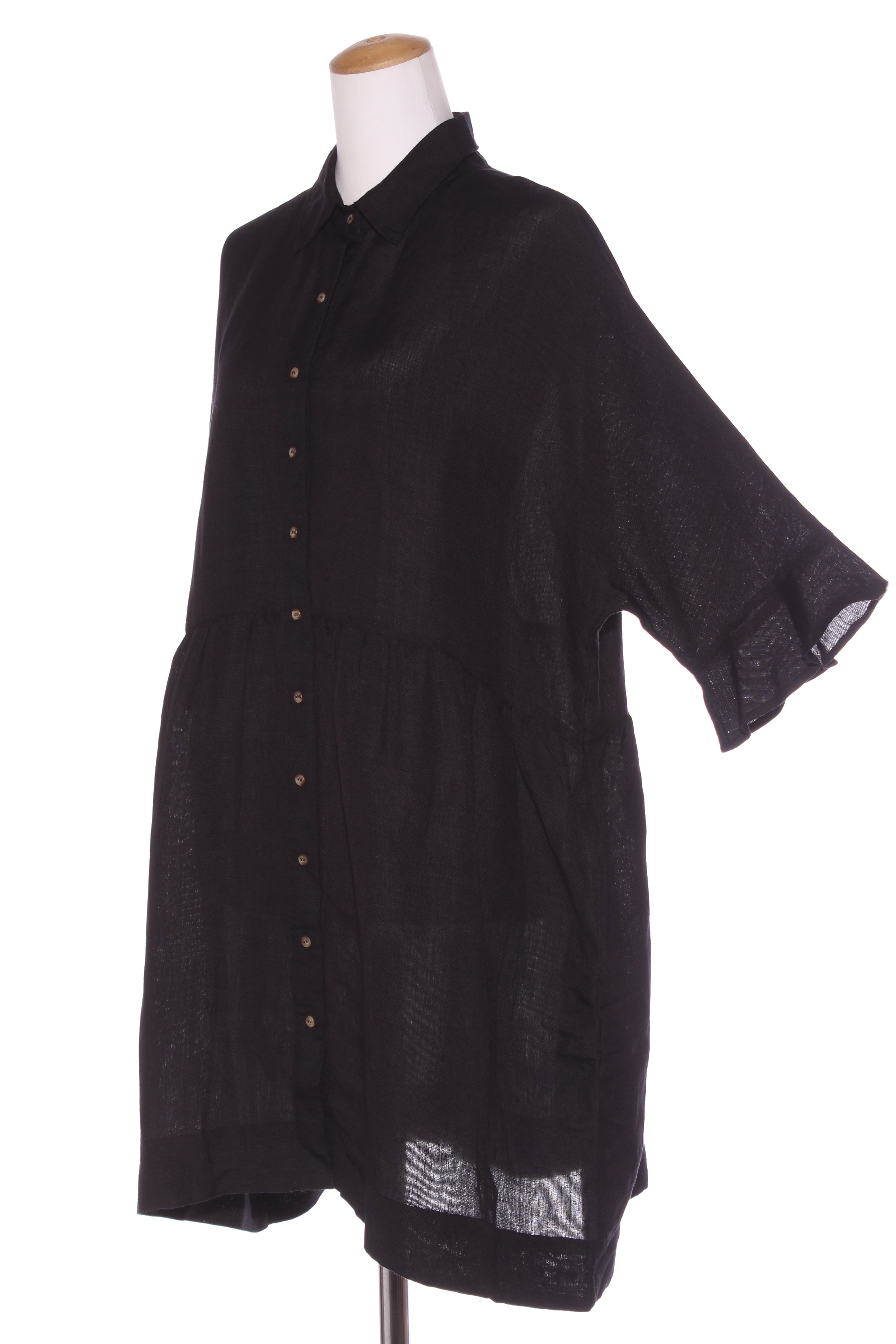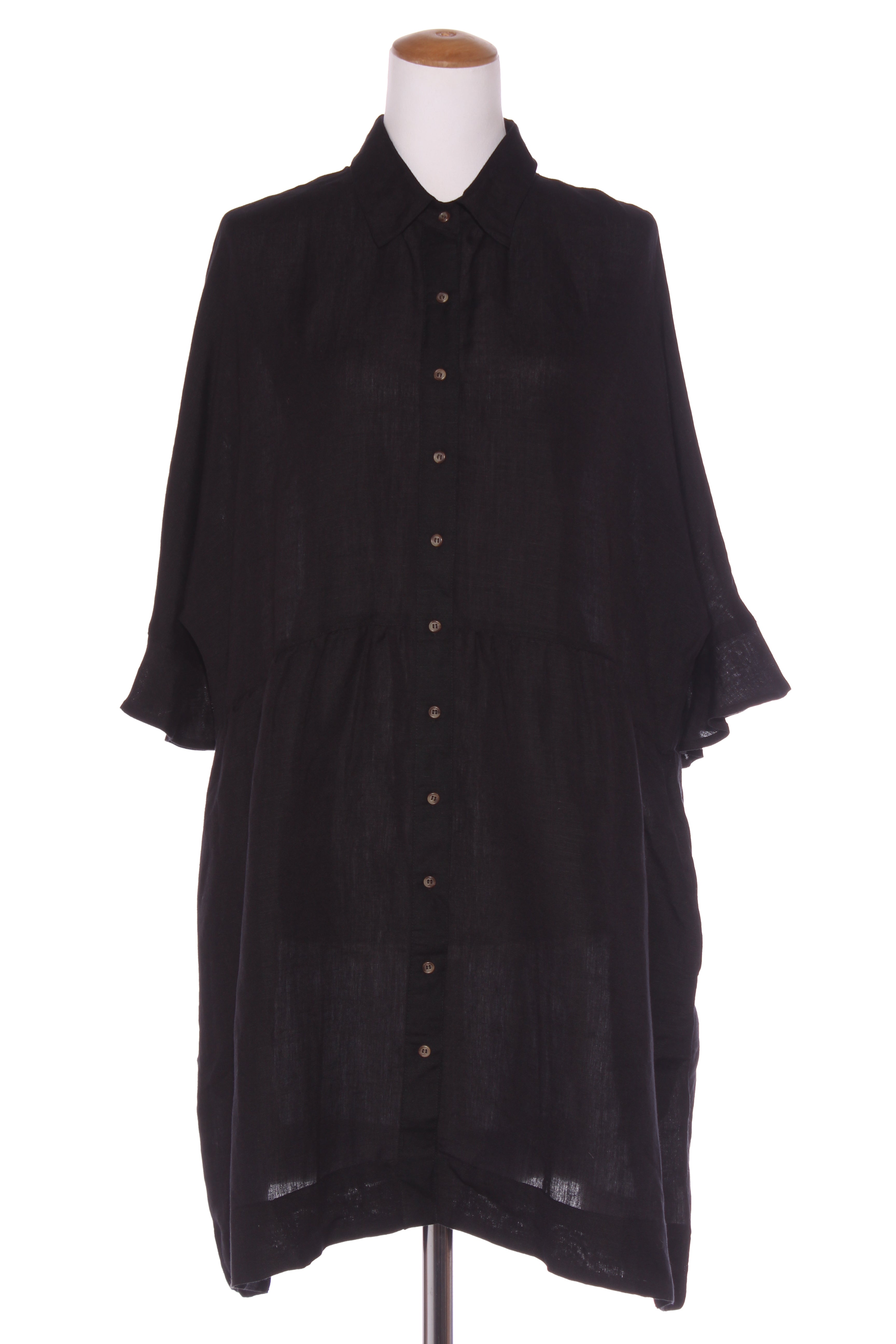 SIZE ON TAG: MFITS LIKE: 12COLOUR: BlackFABRIC: 55% viscose, 45% linenCONDITION: Excellent prelovedMEASUREMENTS:BUST: 71cms WAIST: 66cms LENGTH: 95cmsNOTES: Button up front. Side pockets.