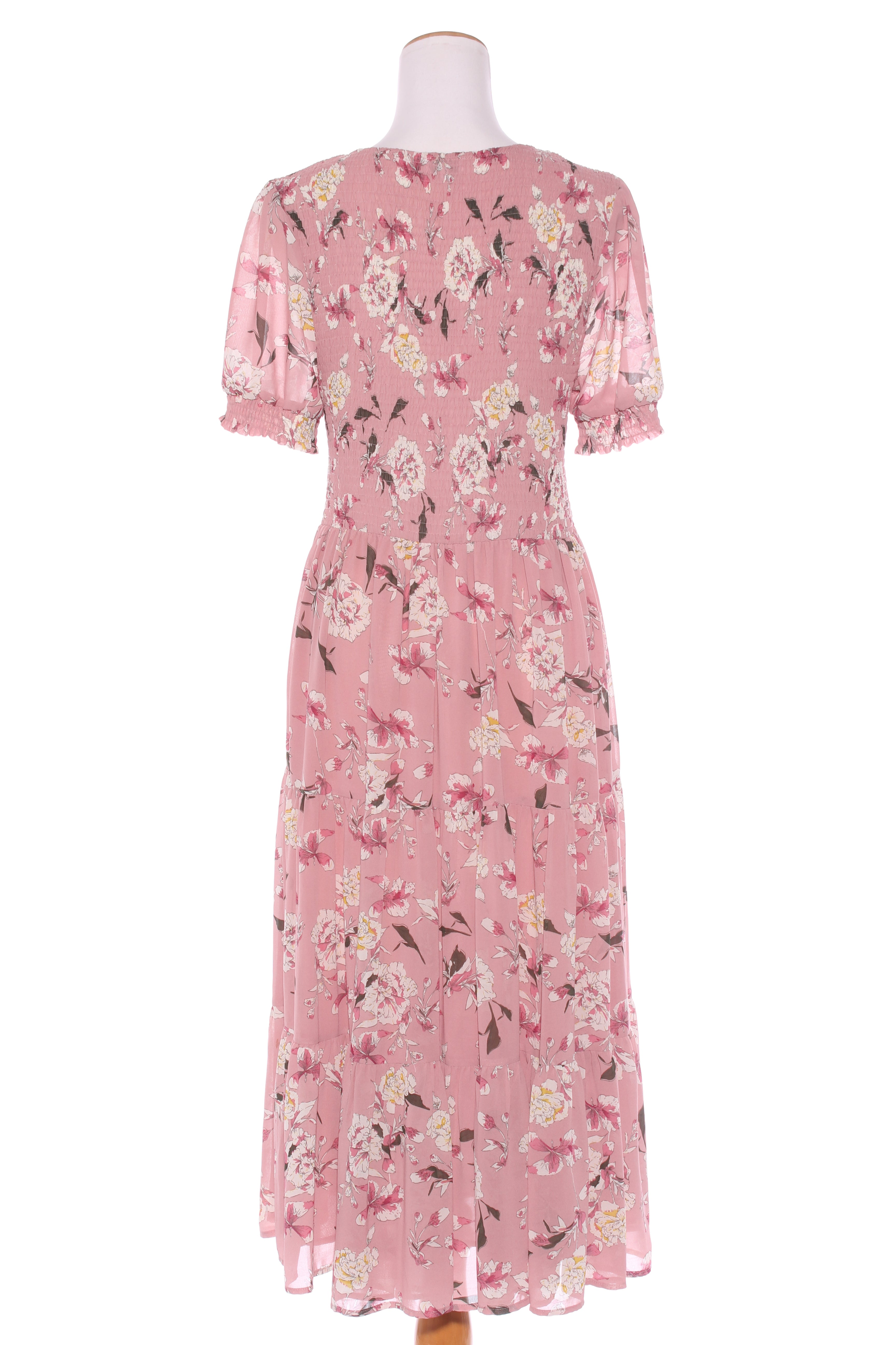 SIZE ON TAG: LFITS LIKE: 12-14COLOUR: Pink, dusty multiFABRIC: PolyesterCONDITION: Excellent prelovedMEASUREMENTS:BUST: 44cms WAIST: 38cms LENGTH: 123cmsNOTES: Pull overt style. Elasticated shirred body. Skirt lined.