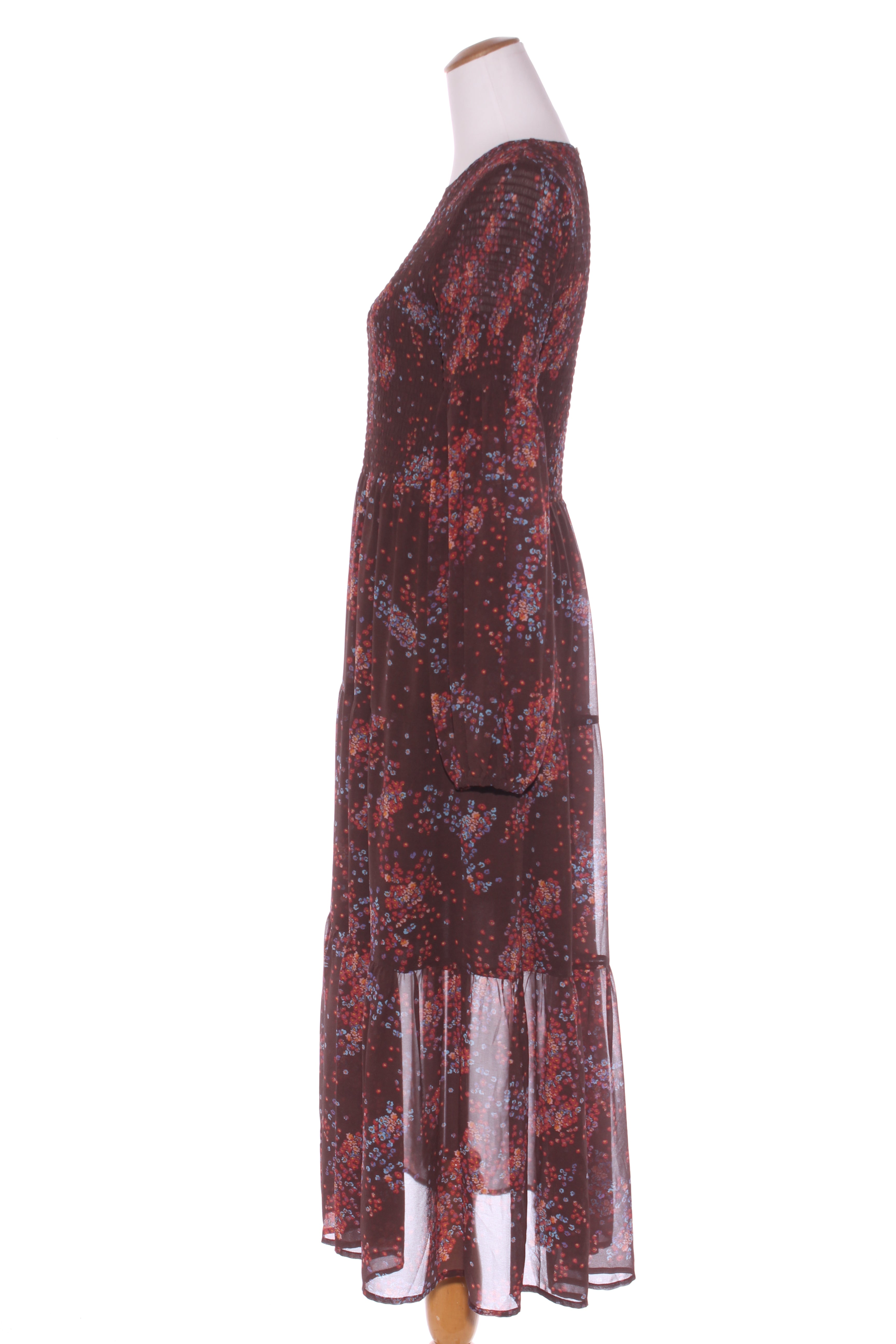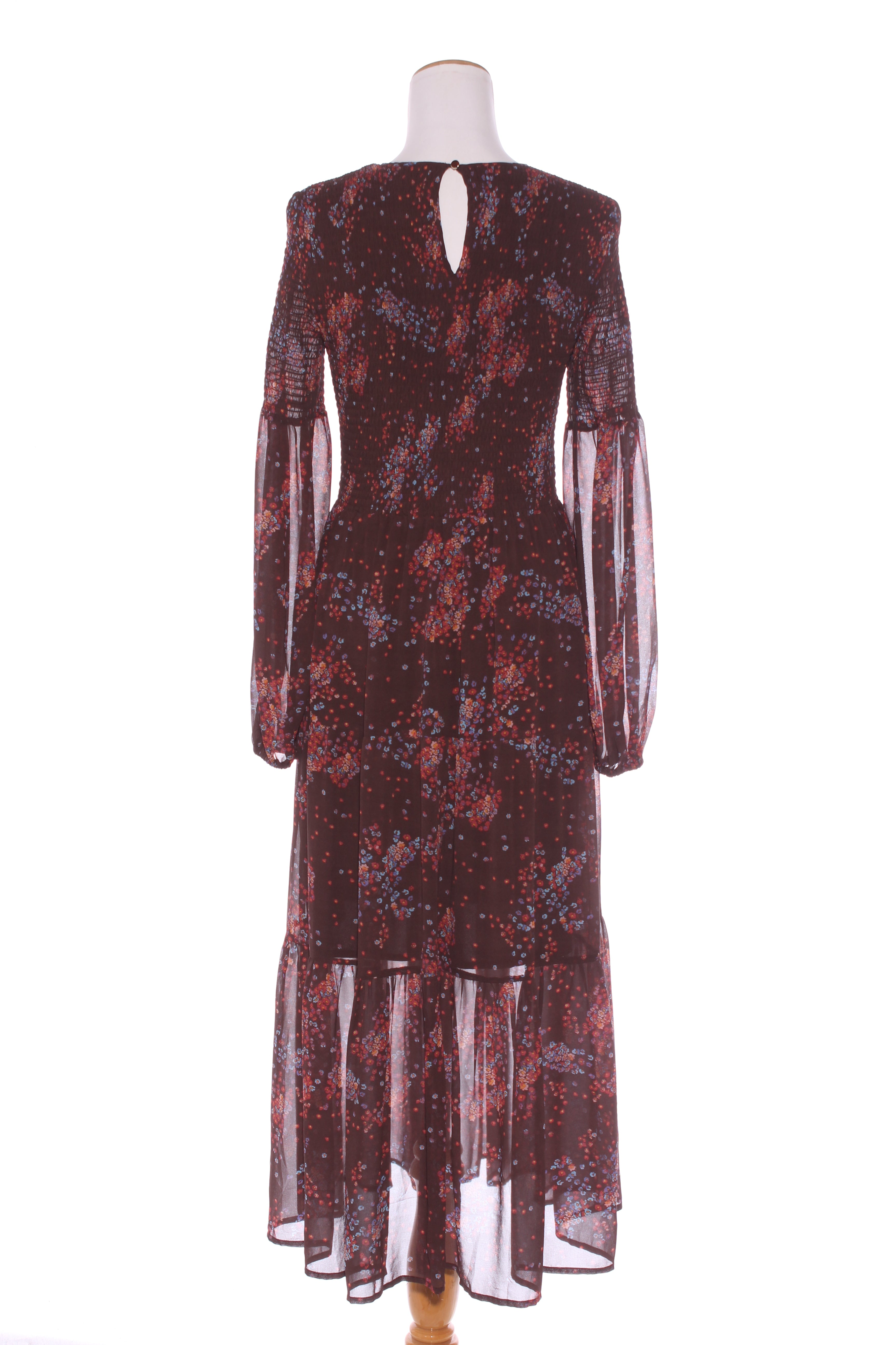 SIZE ON TAG: LFITS LIKE: 12-14COLOUR: Maroon, multiFABRIC: Tag removed, polyester CONDITION: Excellent prelovedMEASUREMENTS:BUST: 42cms WAIST: 38cms LENGTH: 131cmsNOTES: Button up nape of neck. Elasticated shirred body. ...