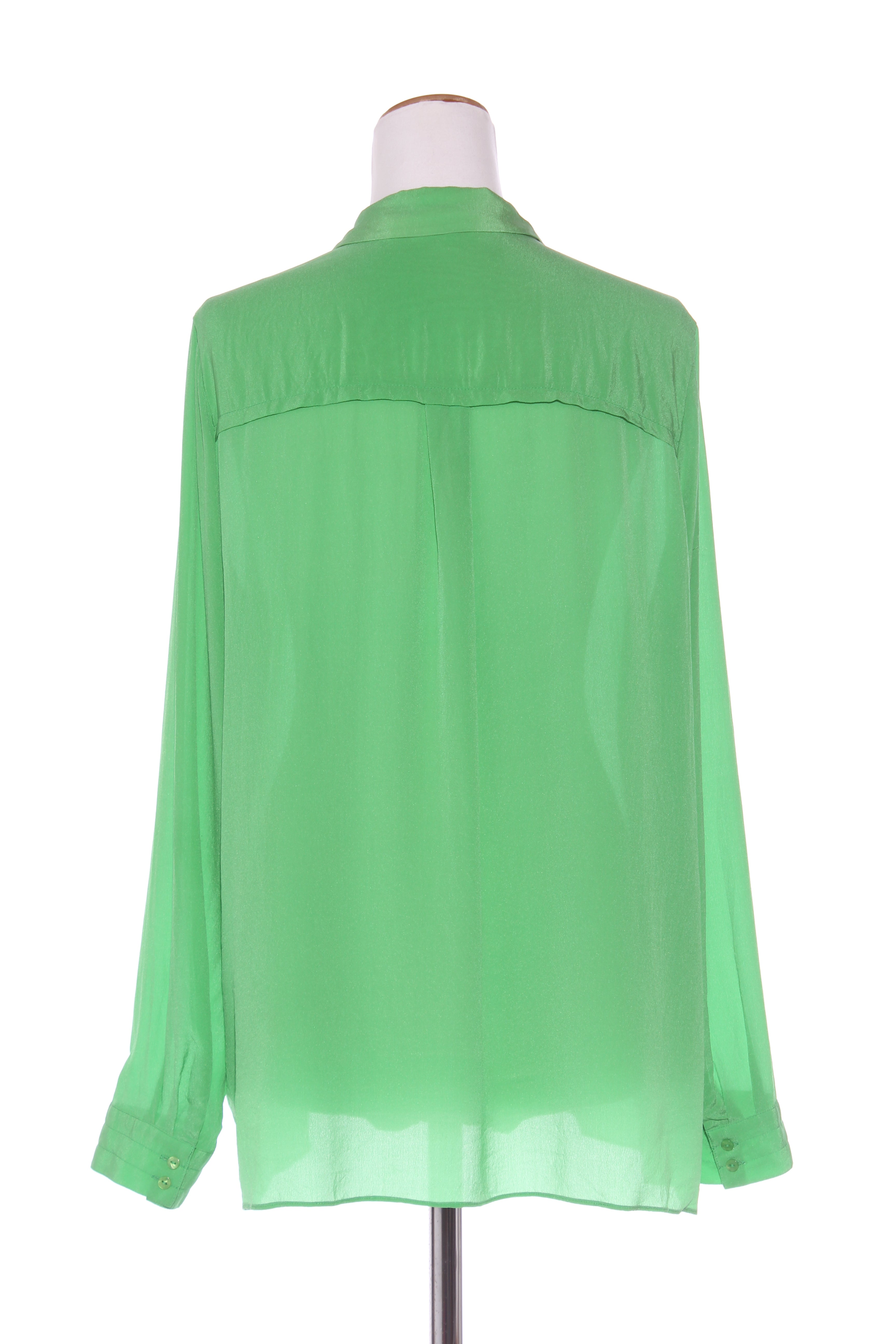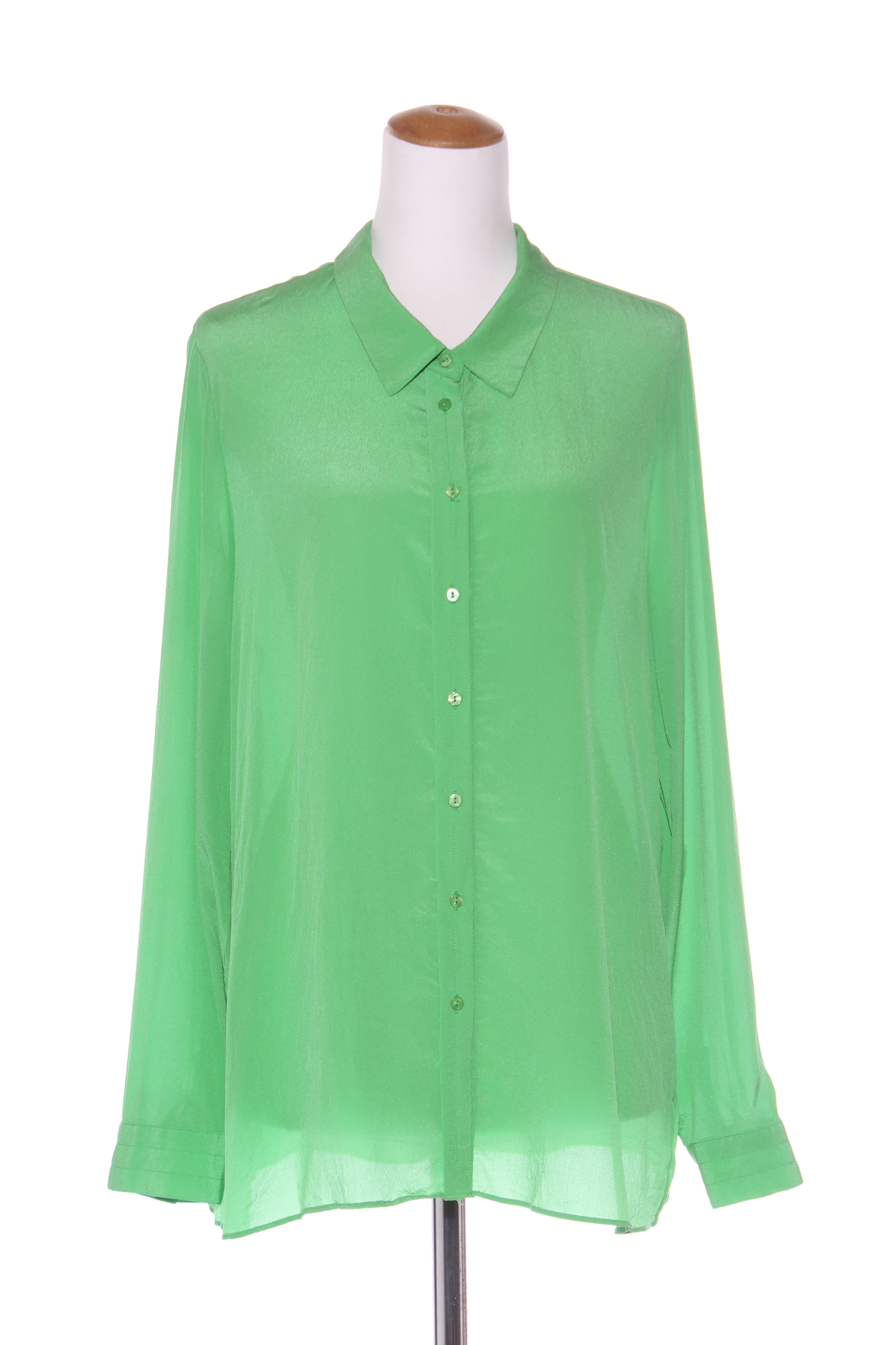 SIZE ON TAG: 18FITS LIKE: N/ACOLOUR: GreenFABRIC: SilkCONDITION: Excellent prelovedMEASUREMENTS:BUST: 58cms WAIST: 62cms LENGTH: 70cmsNOTES: Button up front and sleeve ends. Fabric has some stretch.