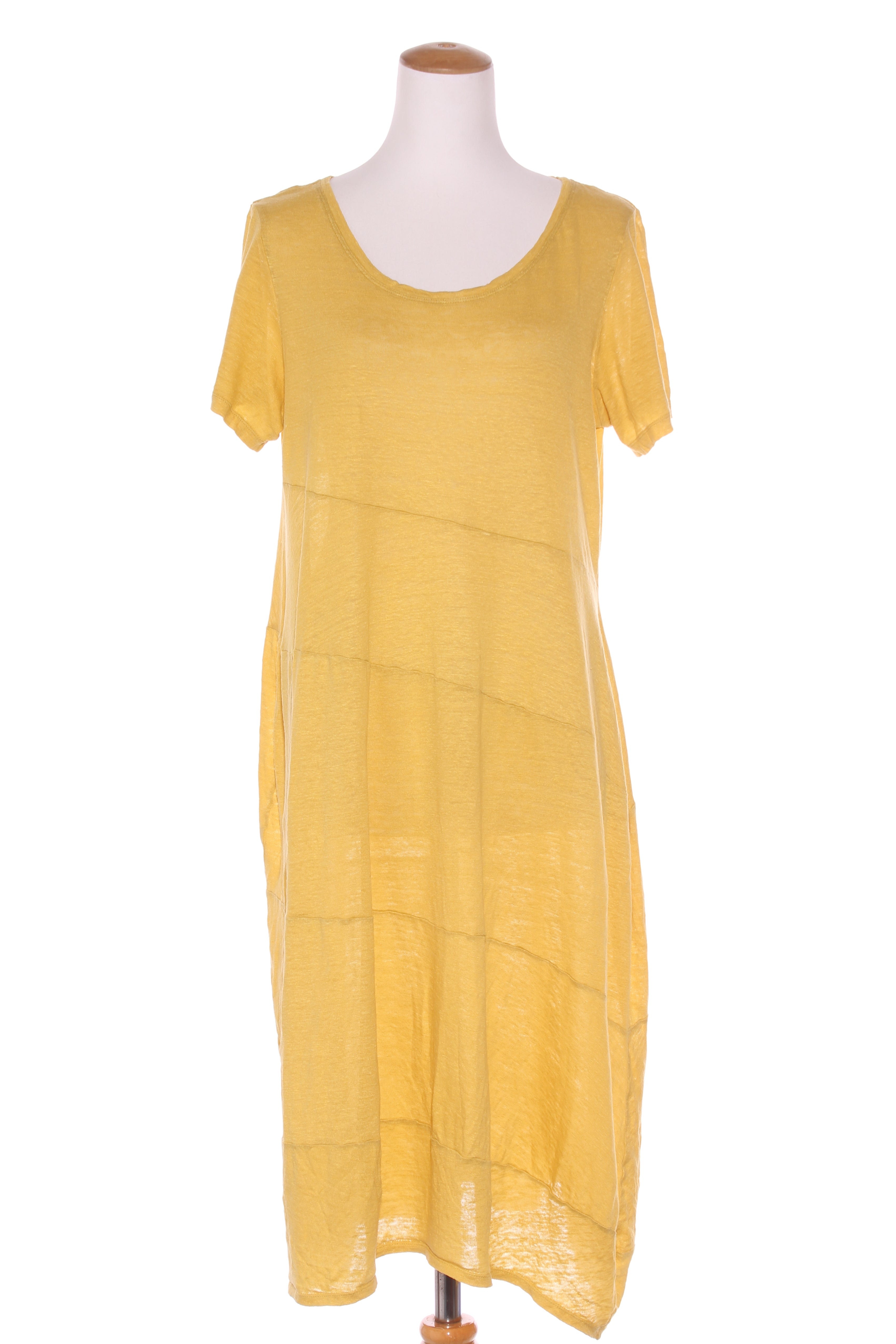 SIZE ON TAG: 18FITS LIKE: 16-18COLOUR: YellowFABRIC: LinenCONDITION: Excellent prelovedMEASUREMENTS:BUST: 58cms WAIST: 54cms LENGTH: 110-117cmsNOTES: Made in NZ. Pull over style. Fabric has stretch.